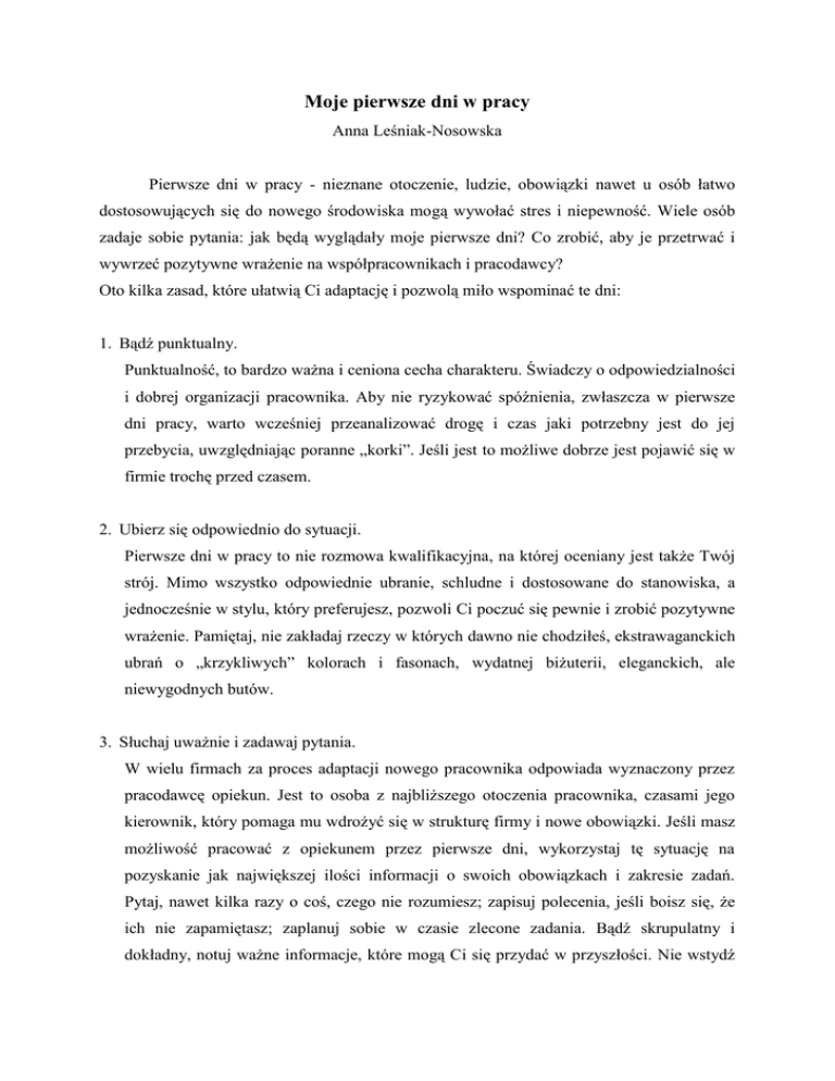 Moje pierwsze dni w pracy Anna Leśniak-Nosowska Pierwsze dni w pracy - nieznane otoczenie, ludzie, obowiązki nawet u osób łatwo dostosowujących się do nowego środowiska mogą wywołać stres i niepewność. Wiele osób zadaje sobie pytania: jak będą wyglądały moje pierwsze dni? Co zrobić, aby je przetrwać i wywrzeć pozytywne wrażenie na współpracownikach i pracodawcy? Oto kilka zasad, które ułatwią Ci adaptację i pozwolą miło wspominać te dni: 1. Bądź punktualny. Punktualność, to bardzo ważna i ceniona cecha charakteru. Świadczy o odpowiedzialności i dobrej organizacji pracownika. Aby nie ryzykować spóźnienia, zwłaszcza w pierwsze dni pracy, warto wcześniej przeanalizować drogę i czas jaki potrzebny jest do jej przebycia, uwzględniając poranne „korki”. Jeśli jest to możliwe dobrze jest pojawić się w firmie trochę przed czasem. 2. Ubierz się odpowiednio do sytuacji. Pierwsze dni w pracy to nie rozmowa kwalifikacyjna, na której oceniany jest także Twój strój. Mimo wszystko odpowiednie ubranie, schludne i dostosowane do stanowiska, a jednocześnie w stylu, który preferujesz, pozwoli Ci poczuć się pewnie i zrobić pozytywne wrażenie. Pamiętaj, nie zakładaj rzeczy w których dawno nie chodziłeś, ekstrawaganckich ubrań o „krzykliwych” kolorach i fasonach, wydatnej biżuterii, eleganckich, ale niewygodnych butów. 3. Słuchaj uważnie i zadawaj pytania. W wielu firmach za proces adaptacji nowego pracownika odpowiada wyznaczony przez pracodawcę opiekun. Jest to osoba z najbliższego otoczenia pracownika, czasami jego kierownik, który pomaga mu wdrożyć się w strukturę firmy i nowe obowiązki. Jeśli masz możliwość pracować z opiekunem przez pierwsze dni, wykorzystaj tę sytuację na pozyskanie jak największej ilości informacji o swoich obowiązkach i zakresie zadań. Pytaj, nawet kilka razy o coś, czego nie rozumiesz; zapisuj polecenia, jeśli boisz się, że ich nie zapamiętasz; zaplanuj sobie w czasie zlecone zadania. Bądź skrupulatny i dokładny, notuj ważne informacje, które mogą Ci się przydać w przyszłości. Nie wstydź się swojej niewiedzy, masz prawo pytać, popełniać błędy. Im więcej nauczysz się w tym okresie „ochronnym” tym łatwiej poradzisz sobie później. 4. Rozmawiaj o swojej niepełnosprawności. Choroba, na którą chorujesz, rodzaj niepełnosprawności jest Twoją osobistą sprawą. Jednakże, dla własnego komfortu, a czasami bezpieczeństwa, warto jest poinformować współpracowników o Twoich ograniczeniach oraz sposobach pomocy w sytuacjach nagłej potrzeby. Nie chodzi tutaj o wtajemniczanie nowo poznanych koleżanek i kolegów w kwestie dotyczące przebiegu Twojej choroby i jej procesu leczenia, ale o wyjaśnienie dlaczego pracujesz inaczej i w innym tempie niż reszta zespołu oraz kiedy i jakiej potrzebujesz pomocy aby efektywnie wykonywać pracę. Staraj się dbać o komunikację ze swoim otoczeniem, informuj o problemach z wykonaniem jakiegoś zadania, nie wahaj się prosić o pomoc. Daj się poznać. 5. Pracuj. Nawet jeśli nie wiesz jeszcze wszystkiego, nie zapoznałeś się z całą strukturą firmy i pracownikami, staraj się przede wszystkim skupić na pracy. Angażuj się w wykonie zleconych Ci zadań, a nie w rozmowy towarzyskie. Pamiętaj, że od pierwszych dni Twój opiekun obserwuje jak bardzo przykładasz się do pracy i czym się zajmujesz. Pokaż się więc od jak najlepszej strony. To zawsze procentuje. 6. Nie mów pierwszy „po imieniu”. Nieformalne sposoby komunikacji zazwyczaj przyspieszają proces adaptacji w nowym środowisku. W niektórych firmach z góry przyjęty jest zwyczaj bezpośredniego zwracania się do siebie współpracowników i pomijania zwrotu „pan-pani”. Pozwala to na większą integrację załogi i ułatwia budowanie zespołu. Jednakże niezależnie od tego, jaki system komunikacji interpersonalnej przyjęty jest w Twoim miejscu pracy, nie wychodź pierwszy z inicjatywą mówienia do Ciebie po imieniu. Taka propozycja zapewne padnie ze strony Twojego opiekuna i współpracowników. 7. Unikaj plotek. Unikaj sytuacji, w której pracownicy plotkują na temat kolegów lub pracodawcy. Niektóre z osób szukają sojuszników wśród nowych pracowników i dzielą się z nimi swoimi spostrzeżeniami na temat kolegów lub koleżanek z pracy. To stwarza niebezpieczeństwo popadnięcia w sytuacje konfliktowe już w pierwszych dniach pracy w nowej firmie. Staraj się zachować obiektywizm i nie brać udziału w tego typu rozmowach. 8. Bądź pozytywnie nastawiony. Pierwsze dni w pracy, chociaż trudne, zawsze rozpoczynają nowy etap w Twoim życiu. Jest to bardzo pozytywne wydarzenie. Staraj się, aby współpracownicy nie zauważyli, że stresujesz się, ale wręcz przeciwnie, że cieszy Cię nowa sytuacja. Uśmiechaj się często i bądź otwarty. 9. Podsumuj dzień. Na koniec dnia pracy porozmawiaj ze swoim opiekunem. Podziel się swoimi wrażeniami, zapytaj jak ocenia sposób wykonywania przez Ciebie obowiązków, poproś o ewentualne wskazówki i ustal plan zadań na dzień następny. Pamiętaj o tym, że opiekun jest osobą, która chce Ci pomóc w adaptacji w nowym środowisku. Dlatego ewentualne uwagi z jego strony mają na celu ułatwienie Ci tego procesu, między innymi poprzez polepszenie jakości wykonywanej przez Ciebie pracy oraz zmotywowanie Cię. Negatywna ocena sposobu wykonania któregoś z obowiązków nie świadczy o tym, że pracodawca jest niezadowolony z całokształtu Twojej pracy. Wręcz przeciwnie, krytyka z jego strony powinna wpłynąć na Twoje większe zaangażowanie się w pracę, a nie na rezygnację z jej wykonywania. Po wyjściu z pracy, staraj się zrelaksować. Zapomnij o wszystkim co było nie tak, a co mogłeś zrobić lepiej. Porozmawiaj z bliskimi i zajmij się tym co Cię odpręża.