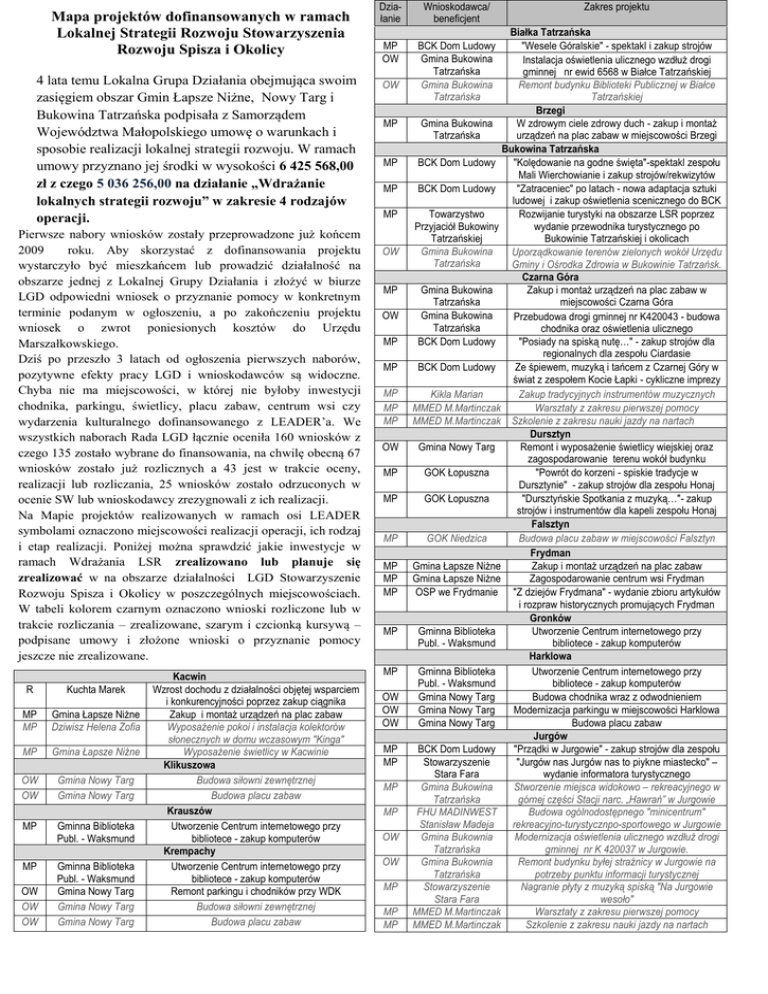 Mapa projektów dofinansowanych w ramach Lokalnej Strategii Rozwoju Stowarzyszenia Rozwoju Spisza i Okolicy 4 lata temu Lokalna Grupa Działania obejmująca swoim zasięgiem obszar Gmin Łapsze Niżne, Nowy Targ i Bukowina Tatrzańska podpisała z Samorządem Województwa Małopolskiego umowę o warunkach i sposobie realizacji lokalnej strategii rozwoju. W ramach umowy przyznano jej środki w wysokości 6 425 568,00 zł z czego 5 036 256,00 na działanie „Wdrażanie lokalnych strategii rozwoju” w zakresie 4 rodzajów operacji. Pierwsze nabory wniosków zostały przeprowadzone już końcem 2009 roku. Aby skorzystać z dofinansowania projektu wystarczyło być mieszkańcem lub prowadzić działalność na obszarze jednej z Lokalnej Grupy Działania i złożyć w biurze LGD odpowiedni wniosek o przyznanie pomocy w konkretnym terminie podanym w ogłoszeniu, a po zakończeniu projektu wniosek o zwrot poniesionych kosztów do Urzędu Marszałkowskiego. Dziś po przeszło 3 latach od ogłoszenia pierwszych naborów, pozytywne efekty pracy LGD i wnioskodawców są widoczne. Chyba nie ma miejscowości, w której nie byłoby inwestycji chodnika, parkingu, świetlicy, placu zabaw, centrum wsi czy wydarzenia kulturalnego dofinansowanego z LEADER’a. We wszystkich naborach Rada LGD łącznie oceniła 160 wniosków z czego 135 zostało wybrane do finansowania, na chwilę obecną 67 wniosków zostało już rozlicznych a 43 jest w trakcie oceny, realizacji lub rozliczania, 25 wniosków zostało odrzuconych w ocenie SW lub wnioskodawcy zrezygnowali z ich realizacji. Na Mapie projektów realizowanych w ramach osi LEADER symbolami oznaczono miejscowości realizacji operacji, ich rodzaj i etap realizacji. Poniżej można sprawdzić jakie inwestycje w ramach Wdrażania LSR zrealizowano lub planuje się zrealizować w na obszarze działalności LGD Stowarzyszenie Rozwoju Spisza i Okolicy w poszczególnych miejscowościach. W tabeli kolorem czarnym oznaczono wnioski rozliczone lub w trakcie rozliczania – zrealizowane, szarym i czcionką kursywą – podpisane umowy i złożone wnioski o przyznanie pomocy jeszcze nie zrealizowane. R Kuchta Marek MP MP Gmina Łapsze Niżne Dziwisz Helena Zofia MP Gmina Łapsze Niżne OW OW Gmina Nowy Targ Gmina Nowy Targ MP Gminna Biblioteka Publ. - Waksmund MP Gminna Biblioteka Publ. - Waksmund Gmina Nowy Targ Gmina Nowy Targ Gmina Nowy Targ OW OW OW Kacwin Wzrost dochodu z działalności objętej wsparciem i konkurencyjności poprzez zakup ciągnika Zakup i montaż urządzeń na plac zabaw Wyposażenie pokoi i instalacja kolektorów słonecznych w domu wczasowym "Kinga" Wyposażenie świetlicy w Kacwinie Klikuszowa Budowa siłowni zewnętrznej Budowa placu zabaw Krauszów Utworzenie Centrum internetowego przy bibliotece - zakup komputerów Krempachy Utworzenie Centrum internetowego przy bibliotece - zakup komputerów Remont parkingu i chodników przy WDK Budowa siłowni zewnętrznej Budowa placu zabaw Działanie MP OW OW MP MP MP MP OW MP OW MP MP MP MP MP OW MP MP MP MP MP MP MP MP OW OW OW MP MP MP MP OW OW MP MP MP Wnioskodawca/ beneficjent Zakres projektu Białka Tatrzańska "Wesele Góralskie" - spektakl i zakup strojów Instalacja oświetlenia ulicznego wzdłuż drogi gminnej nr ewid 6568 w Białce Tatrzańskiej Remont budynku Biblioteki Publicznej w Białce Tatrzańskiej Brzegi Gmina Bukowina W zdrowym ciele zdrowy duch - zakup i montaż Tatrzańska urządzeń na plac zabaw w miejscowości Brzegi Bukowina Tatrzańska BCK Dom Ludowy "Kolędowanie na godne święta"-spektakl zespołu Mali Wierchowianie i zakup strojów/rekwizytów BCK Dom Ludowy "Zatraceniec" po latach - nowa adaptacja sztuki ludowej i zakup oświetlenia scenicznego do BCK Towarzystwo Rozwijanie turystyki na obszarze LSR poprzez Przyjaciół Bukowiny wydanie przewodnika turystycznego po Tatrzańskiej Bukowinie Tatrzańskiej i okolicach Gmina Bukowina Uporządkowanie terenów zielonych wokół Urzędu Tatrzańska Gminy i Ośrodka Zdrowia w Bukowinie Tatrzańsk. Czarna Góra Gmina Bukowina Zakup i montaż urządzeń na plac zabaw w Tatrzańska miejscowości Czarna Góra Gmina Bukowina Przebudowa drogi gminnej nr K420043 - budowa Tatrzańska chodnika oraz oświetlenia ulicznego BCK Dom Ludowy "Posiady na spiską nutę…" - zakup strojów dla regionalnych dla zespołu Ciardasie BCK Dom Ludowy Ze śpiewem, muzyką i tańcem z Czarnej Góry w świat z zespołem Kocie Łapki - cykliczne imprezy Kikla Marian Zakup tradycyjnych instrumentów muzycznych MMED M.Martinczak Warsztaty z zakresu pierwszej pomocy MMED M.Martinczak Szkolenie z zakresu nauki jazdy na nartach Dursztyn Gmina Nowy Targ Remont i wyposażenie świetlicy wiejskiej oraz zagospodarowanie terenu wokół budynku GOK Łopuszna "Powrót do korzeni - spiskie tradycje w Dursztynie" - zakup strojów dla zespołu Honaj GOK Łopuszna "Dursztyńskie Spotkania z muzyką…"- zakup strojów i instrumentów dla kapeli zespołu Honaj Falsztyn GOK Niedzica Budowa placu zabaw w miejscowości Falsztyn Frydman Gmina Łapsze Niżne Zakup i montaż urządzeń na plac zabaw Gmina Łapsze Niżne Zagospodarowanie centrum wsi Frydman OSP we Frydmanie "Z dziejów Frydmana" - wydanie zbioru artykułów i rozpraw historycznych promujących Frydman Gronków Gminna Biblioteka Utworzenie Centrum internetowego przy Publ. - Waksmund bibliotece - zakup komputerów Harklowa Gminna Biblioteka Utworzenie Centrum internetowego przy Publ. - Waksmund bibliotece - zakup komputerów Gmina Nowy Targ Budowa chodnika wraz z odwodnieniem Gmina Nowy Targ Modernizacja parkingu w miejscowości Harklowa Gmina Nowy Targ Budowa placu zabaw Jurgów BCK Dom Ludowy "Prządki w Jurgowie" - zakup strojów dla zespołu Stowarzyszenie "Jurgów nas Jurgów nas to piykne miastecko" – Stara Fara wydanie informatora turystycznego Gmina Bukowina Stworzenie miejsca widokowo – rekreacyjnego w Tatrzańska górnej części Stacji narc. „Hawrań” w Jurgowie FHU MADINWEST Budowa ogólnodostępnego "