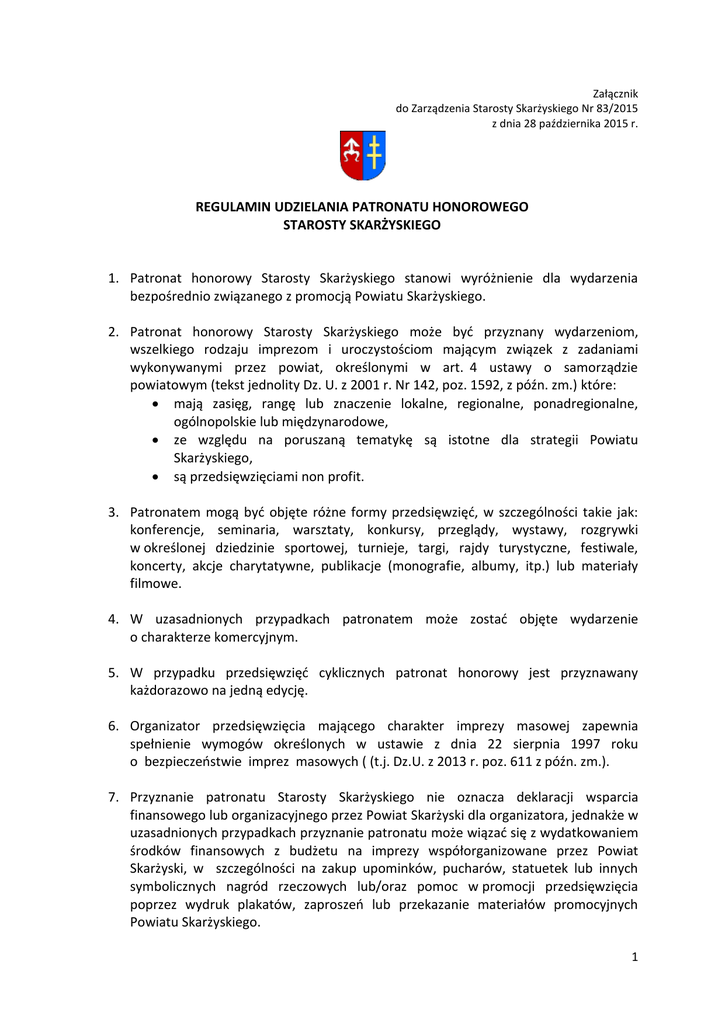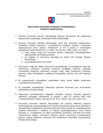 Załącznik do Zarządzenia Starosty Skarżyskiego Nr 83/2015 z dnia 28 października 2015 r. REGULAMIN UDZIELANIA PATRONATU HONOROWEGO STAROSTY SKARŻYSKIEGO 1. Patronat honorowy Starosty Skarżyskiego stanowi wyróżnienie dla wydarzenia bezpośrednio związanego z promocją Powiatu Skarżyskiego. 2. Patronat honorowy Starosty Skarżyskiego może być przyznany wydarzeniom, wszelkiego rodzaju imprezom i uroczystościom mającym związek z zadaniami wykonywanymi przez powiat, określonymi w art. 4 ustawy o samorządzie powiatowym (tekst jednolity Dz. U. z 2001 r. Nr 142, poz. 1592, z późn. zm.) które: mają zasięg, rangę lub znaczenie lokalne, regionalne, ponadregionalne, ogólnopolskie lub międzynarodowe, ze względu na poruszaną tematykę są istotne dla strategii Powiatu Skarżyskiego, są przedsięwzięciami non profit. 3. Patronatem mogą być objęte różne formy przedsięwzięć, w szczególności takie jak: konferencje, seminaria, warsztaty, konkursy, przeglądy, wystawy, rozgrywki w określonej dziedzinie sportowej, turnieje, targi, rajdy turystyczne, festiwale, koncerty, akcje charytatywne, publikacje (monografie, albumy, itp.) lub materiały filmowe. 4. W uzasadnionych przypadkach patronatem może zostać objęte wydarzenie o charakterze komercyjnym. 5. W przypadku przedsięwzięć cyklicznych patronat honorowy jest przyznawany każdorazowo na jedną edycję. 6. Organizator przedsięwzięcia mającego charakter imprezy masowej zapewnia spełnienie wymogów określonych w ustawie z dnia 22 sierpnia 1997 roku o bezpieczeństwie imprez masowych ( (t.j. Dz.U. z 2013 r. poz. 611 z późn. zm.). 7. Przyznanie patronatu Starosty Skarżyskiego nie oznacza deklaracji wsparcia finansowego lub organizacyjnego przez Powiat Skarżyski dla organizatora, jednakże w uzasadnionych przypadkach przyznanie patronatu może wiązać się z wydatkowaniem środków finansowych z budżetu na imprezy współorganizowane przez Powiat Skarżyski, w szczególności na zakup upominków, pucharów, statuetek lub innych symbolicznych nagród rzeczowych lub/oraz pomoc w promocji przedsięwzięcia poprzez wydruk plakatów, zaproszeń lub przekazanie materiałów promocyjnych Powiatu Skarżyskiego. 1 8. Przyznanie patronatu Starosty Skarżyskiego oznacza: uzyskanie przez wnioskującego o patronat logotypu Powiatu Skarżyskiego (graficznego znaku promocyjnego "Skarżyski- Powiat z widokiem nie tylko na góry), umieszczenie informacji o wydarzeniu na stronie internetowej Powiatu Skarżyskiego (www.skarzysko.powiat.pl - zakładka „Patronaty Starosty”), umieszczenie informacji o wydarzeniu w gazecie samorządowej Powiatu Skarżyskiego "Powiat z Widokiem", umieszczenie informacji o wydarzeniu na fanpage Powiatu Skarżyskiego na Facebooku. 9. Informacja o przyznaniu patronatu Starosty Skarżyskiego w formie „Patronat Honorowy: Jerzy Żmijewski Starosta Skarżyski” wraz z logotypem Powiatu musi zostać zamieszczona na stronach internetowych organizatora wydarzenia oraz na plakatach, zaproszeniach i materiałach informacyjnych związanych z wydarzeniem. 10. Logotyp Powiatu Skarżyskiego organizator wydarzenia może pobrać ze strony internetowej Powiatu Skarżyskiego www.skarzysko.powiat.pl zakładka logo powiatu 11. Wniosek o przyznanie patronatu Starosty organizator składa lub przesyła w formie pisemnej zgodnie z obowiązującym formularzem (do pobrania na stronie internetowej Powiatu Skarżyskiego www.skarzysko.powiat.pl zakładka "Patronaty Starosty") w Starostwie Powiatowym w Skarżysku-Kamiennej (ul. Konarskiego 20) 12. Wniosek, o którym mowa w pkt. 11 powinien być wypełniony nie później niż 14 dni przed dniem rozpoczęcia wydarzenia. 13. Prawo do przyznawania patronatu Starosty przysługuje wyłącznie Staroście Skarżyskiemu, natomiast decyzję o ufundowaniu nagród podejmuje Zarząd Powiatu Skarżyskiego na imprezy współorganizowane przez Powiat Skarżyski. 14. Wniosek, który nie spełnia wymogów określonych w pkt. 11 lub złożony został po terminie, nie będzie rozpatrywany. 15. O przyznaniu patronatu Starosty Skarżyskiego albo o odmowie organizator zostanie powiadomiony przez realizujący sprawę zgodnie z kompetencjami wydział Starostwa Powiatowego w Skarżysku-Kamiennej drogą pisemną lub elektroniczną, nie później niż 7 dni przed rozpoczęciem wydarzenia. 16. Organizator wydarzenia jest zobowiązany poinformować współorganizatorów oraz uczestników o przyznanym patronacie honorowym Starosty Skarżyskiego. 17. W przypadku objęcia wydarzenia patronatem Starosty Skarżyskiego, organizator zobowiązany jest: 2 umieścić informację o przyznanym patronacie we wszystkich materiałach promocyjnych i informacyjnych związanych z realizacją wydarzenia wraz z logotypem Powiatu Skarżyskiego, umieścić informację o przyznanym patronacie na stronie internetowej, na której znajdują się informacje o danym wydarzeniu, wzmiankowania faktu otrzymania przyznanego patronatu w przekazach medialnych dotyczących przedsięwzięcia, umieszczenia, w widocznym miejscu, logotypu Powiatu Skarżyskiego znaków promocyjnych Powiatu Skarżyskiego (logotypu powiatu) podczas trwania przedsięwzięcia objętego patronatem. 18. Po zakończeniu wydarzenia organizator jest zobowiązany przesłać na adres mailowy do wydziału realizującego sprawę w Starostwie Powiatowym w Skarżysku-Kamiennej dokumentację fotograficzną (w jakości umożliwiającej ich wykorzystanie w gazecie samorządowej "Powiat z Widokiem oraz na stronie internetowej Powiatu Skarżyskiego www.skarzysko.powiat.pl) wraz z notatką na temat przebiegu wydarzenia (wyeksponowane banery z informacją o patronacie, logo powiatu, wystąpienia przedstawicieli powiatu) – niezwłocznie po zakończeniu wydarzenia. 19. Starosta Skarżyski zastrzega sobie prawo do nieodpłatnego umieszczania dostarczonych zdjęć z przedsięwzięcia na swojej stronie internetowej, fanpagu oraz w publikacjach, folderach, wydawnictwach itp. 20. St