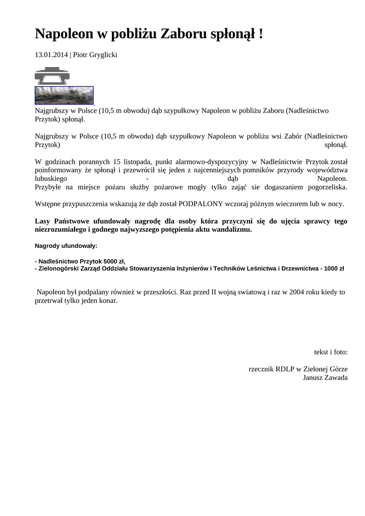 Napoleon w pobliżu Zaboru spłonął ! 13.01.2014 | Piotr Gryglicki Najgrubszy w Polsce (10,5 m obwodu) dąb szypułkowy Napoleon w pobliżu Zaboru (Nadleśnictwo Przytok) spłonął. Najgrubszy w Polsce (10,5 m obwodu) dąb szypułkowy Napoleon w pobliżu wsi Zabór (Nadleśnictwo Przytok) spłonął. W godzinach porannych 15 listopada, punkt alarmowo-dyspozycyjny w Nadleśnictwie Przytok został poinformowany że spłonął i przewrócił się jeden z najcenniejszych pomników przyrody województwa lubuskiego dąb Napoleon. Przybyłe na miejsce pożaru służby pożarowe mogły tylko zająć sie dogaszaniem pogorzeliska. Wstępne przypuszczenia wskazują że dąb został PODPALONY wczoraj póżnym wieczorem lub w nocy. Lasy Państwowe ufundowały nagrodę dla osoby która przyczyni się do ujęcia sprawcy tego niezrozumiałego i godnego najwyzszego potępienia aktu wandalizmu. Nagrody ufundowały: - Nadleśnictwo Przytok 5000 zł, - Zielonogórski Zarząd Oddziału Stowarzyszenia Inżynierów i Techników Leśnictwa i Drzewnictwa - 1000 zł Napoleon był podpalany również w przeszłości. Raz przed II wojną swiatową i raz w 2004 roku kiedy to przetrwał tylko jeden konar. tekst i foto: rzecznik RDLP w Zielonej Górze Janusz Zawada