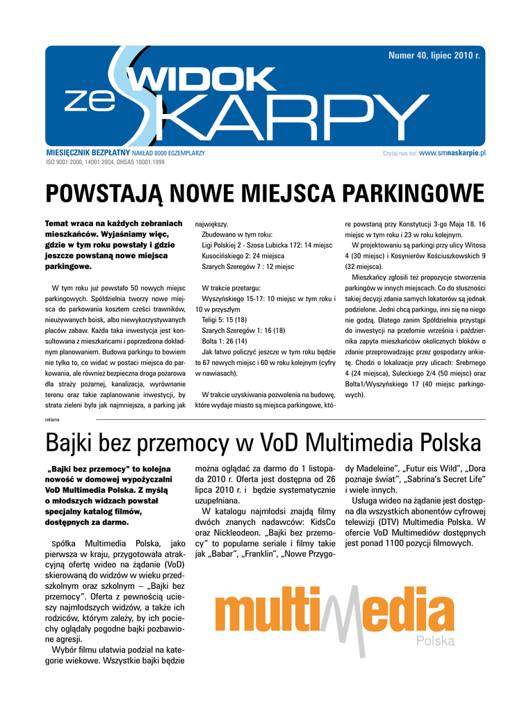 Magazyn mieszkańców SM „Na Skarpie” Numer 40, lipiec 2010 r. MIESIĘCZNIK BEZPŁATNY NAKŁAD 8000 EGZEMPLARZY Czytaj nas też: www.smnaskarpie.pl ISO 9001:2000, 14001:2004, OHSAS 18001:1999 Powstają nowe miejsca parkingowe Temat wraca na każdych zebraniach mieszkańców. Wyjaśniamy więc, gdzie w tym roku powstały i gdzie jeszcze powstaną nowe miejsca parkingowe. największy. Zbudowano w tym roku: Ligi Polskiej 2 - Szosa Lubicka 172: 14 miejsc Kusocińskiego 2: 24 miejsca Szarych Szeregów 7 : 12 miejsc W tym roku już powstało 50 nowych miejsc parkingowych. Spółdzielnia tworzy nowe miejsca do parkowania kosztem cześci trawników, nieużywanych boisk, albo niewykorzystywanych placów zabaw. Każda taka inwestycja jest konsultowana z mieszkańcami i poprzedzona dokładnym planowaniem. Budowa parkingu to bowiem nie tylko to, co widać w postaci miejsca do parkowania, ale również bezpieczna droga pożarowa dla straży pożarnej, kanalizacja, wyrównanie terenu oraz takie zaplanowanie inwestycji, by strata zieleni była jak najmniejsza, a parking jak W trakcie przetargu: Wyszyńskiego 15-17: 10 miejsc w tym roku i 10 w przyszłym Teligi 5: 15 (18) Szarych Szeregów 1: 16 (18) Bolta 1: 26 (14) Jak łatwo policzyć jeszcze w tym roku będzie to 67 nowych miejsc i 60 w roku kolejnym (cyfry w nawiasach). W trakcie uzyskiwania pozwolenia na budowę, które wydaje miasto są miejsca parkingowe, któ- re powstaną przy Konstytucji 3-go Maja 18. 16 miejsc w tym roku i 23 w roku kolejnym. W projektowaniu są parkingi przy ulicy Witosa 4 (30 miejsc) i Kosynierów Kościuszkowskich 9 (32 miejsca). Mieszkańcy zgłosili też propozycje stworzenia parkingów w innych miejscach. Co do słuszności takiej decyzji zdania samych lokatorów są jednak podzielone. Jedni chcą parkingu, inni się na niego nie godzą. Dlatego zanim Spółdzielnia przystąpi do inwestycji na przełomie września i października zapyta mieszkańców okolicznych bloków o zdanie przeprowadzając przez gospodarzy ankietę. Chodzi o lokalizacje przy ulicach: Srebrnego 4 (24 miejsca), Suleckiego 2/4 (50 miejsc) oraz Bolta1/Wyszyńskiego 17 (40 miejsc parkingowych). reklama Bajki bez przemocy w VoD Multimedia Polska „Bajki bez przemocy” to kolejna nowość w domowej wypożyczalni VoD Multimedia Polska. Z myślą o młodszych widzach powstał specjalny katalog filmów, dostępnych za darmo. Spółka Multimedia Polska, jako pierwsza w kraju, przygotowała atrakcyjną ofertę wideo na żądanie (VoD) skierowaną do widzów w wieku przedszkolnym oraz szkolnym – „Bajki bez przemocy”. Oferta z pewnością ucieszy najmłodszych widzów, a także ich rodziców, którym zależy, by ich pociechy oglądały pogodne bajki pozbawione agresji. Wybór filmu ułatwia podział na kategorie wiekowe. Wszystkie bajki będzie można oglądać za darmo do 1 listopada 2010 r. Oferta jest dostępna od 26 lipca 2010 r. i będzie systematycznie uzupełniana. W katalogu najmłodsi znajdą filmy dwóch znanych nadawców: KidsCo oraz Nickleodeon. „Bajki bez przemocy” to popularne seriale i filmy takie jak „Babar”, „Franklin”, „Nowe Przygo- dy Madeleine”, „Futur eis Wild”, „Dora poznaje świat”, „Sabrina’s Secret Life” i wiele innych. Usługa wideo na żądanie jest dostępna dla wszystkich abonentów cyfrowej telewizji (DTV) Multimedia Polska. W ofercie VoD Multimediów dostępnych jest ponad 1100 pozycji filmowych.