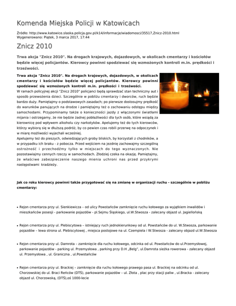Komenda Miejska Policji w Katowicach Źródło: http://www.katowice.slaska.policja.gov.pl/k14/informacje/wiadomosci/35517,Znicz-2010.html Wygenerowano: Piątek, 3 marca 2017, 17:44 Znicz 2010 Trwa akcja "Znicz 2010". Na drogach krajowych, dojazdowych, w okolicach cmentarzy i kościołów będzie więcej policjantów. Kierowcy powinni spodziewać się wzmożonych kontroli m.in. prędkości i trzeźwości. Trwa akcja "Znicz 2010". Na drogach krajowych, dojazdowych, w okolicach cmentarzy i kościołów będzie więcej policjantów. Kierowcy powinni spodziewać się wzmożonych kontroli m.in. prędkości i trzeźwości. W ramach policyjnej akcji "Znicz 2010" policjanci będą sprawdzać stan techniczny aut i sposób przewożenia dzieci. Szczególnie w pobliżu cmentarzy i dworców, ruch będzie bardzo duży. Pamiętajmy o podstawowych zasadach; po pierwsze dostosujmy prędkość do warunków panujących na drodze i pamiętajmy też o zachowaniu odstępu między samochodami. Przypominamy także o konieczności jazdy z włączonymi światłami mijania i ostrzegamy, że nie będzie żadnej pobłażliwości dla tych osób, które wsiądą za kierownicę pod wpływem alkoholu czy narkotyków. Apelujemy też do tych kierowców, którzy wybiorą się w dłuższą podróż, by co pewien czas robili przerwę na odpoczynek i w miarę możliwości wyjechali wcześniej. Apelujemy też do pieszych, odwiedzających groby bliskich, by korzystali z chodników, a w przypadku ich braku - z pobocza. Przed wejściem na jezdnię zachowajmy szczególną ostrożność i przechodźmy tylko w miejscach do tego wyznaczonych. Nie pozostawiajmy cennych rzeczy w samochodach. Złodziej czeka na okazję. Pamiętajmy, że właściwe zabezpieczenie naszego mienia uchroni nas przed przykrymi następstwami kradzieży. Jak co roku kierowcy powinni także przygotować się na zmianę w organizacji ruchu - szczególnie w pobliżu cmentarzy: ● Rejon cmentarza przy ul. Sienkiewicza – od ulicy Powstańców zamknięcie ruchu kołowego za wyjątkiem inwalidów i mieszkańców posesji - parkowanie pojazdów - pl.Sejmu Śląskiego, ul.W.Stwosza - zalecany objazd ul. Jagiellońską ● Rejon cmentarza przy ul. Plebiscytowa – istniejący ruch jednokierunkowy od ul. Powstańców do ul. W.Stwosza, parkowanie pojazdów – lewa strona ul. Plebiscytowej , miejsca postojowe na ul. Czempiela i W.Stwosza - zalecany objazd ul.W.Stwosza ● Rejon cmentarza przy ul. Damrota – zamknięcie dla ruchu kołowego, odcinka od ul. Powstańców do ul.Przemysłowej, parkowanie pojazdów - parking ul. Przemysłowa , parking przy D.H „Belg”, ul.Damrota sieżka rowerowa - zalecany objazd ul. Przemysłowa , ul. Graniczna , ul.Powstańców ● Rejon cmentarza przy ul. Brackiej – zamknięcie dla ruchu kołowego prawego pasa ul. Brackiej na odcinku od ul. Chorzowskiej do ul. Braci Reńców (DTŚ), parkowanie pojazdów – ul. Złota , plac przy stacji paliw , ul.Bracka - zalecany objazd ul. Chorzowską, (DTŚ),oś 1000-lecie ● Rejon cmentarza przy ul. Wróblewskiego – wprowadzenie ruchu jednokierunkowego od ul. Podhalańskiej do ul. Wrocławskiej, parkowanie pojazdów -parking przy cmentarzu , ul. Nowotarska - zalecany objazd ul. Markiefki , ul.Leopolda ● Rejon cmentarza ul. Murckowska – wprowadzenie znaku „zakaz zatrzymywania” na odcinku od wylotu z A-4 do wyjazdu z ul.Porcelanowej oraz wprowadzenie oznakowania określającego wjazd i wyjazd z parkingu przy cmentarzu - parkowanie pojazdów – parking przy cmentarzu , Dolina Trzech Stawów - zalecany objazd – brak – utrzymywana płynność ruchu ● Rejon cmentarza przy ul. Panewnickiej – zamknięcie dla ruchu kołowego odcinka od ul.Medyków do ul. Bronisławy i wprowadzenie ruchu jednokierunkowego na ul. Bronisławy od ul. Panewnickiej do ul. Śląskiej, parkowanie pojazdów – parking pl. Kościelny ,pobliskie ulice - zalecany objazd ul. Piotrowicka , ul.Śląska , ul. Medyków ● Rejon cmentarza przy ul. Cmentarnej – zamknięcie całego odcinka w/w ulicy dla ruchu kołowego, parkowanie pojazdów - ul. Oswobodzenia - zalecany objazd ul. Bagienną ● Rejon cmentarza przy ul. Gliwickiej -zamknięty prawy pas ruchu (miejsca parkingowe) ul. M.Gepert-Meyer w kierunku. ul. Sądowej, parkowanie pojazdów - ul. M.Gepret-Meyer , ul. Gliwicka , ul. Ondraszka - zalecany objazd ul. Bocheńskiego, Chorzowska, DTŚ Kierowcom przypominany także, iż w okresie Wszystkich Świętych na drogach w pobliżu cmentarzy, częściej niż zwykle spotkamy osoby piesze poruszające się poboczem lub jezdnią. Powinniśmy zatem jechać ostrożnie i mieć na uwadze, że pieszy o zmroku dostrzegany jest przez kierującego niemal w ostatniej chwili. Pieszych uczulamy, aby zadbali o własne bezpieczeństwo i jeśli nie jest to absolutnie konieczne nie korzystali z jezdni, a jeśli już muszą pamiętali o zasadzie szczególnej ostrożności. Przypominamy najważniejsze zasady, które pomogą nam w tym czasie: • W miarę możliwości korzystaj ze środków komunikacji publicznej. Specjalne linie autobusowe, tramwajowe, będą „uprzywilejowane” w ruchu i dowiozą nas tam, gdzie samochód prywatny nie będzie mógł wjechać, a tym bardziej zaparkować. • Nie jedź samochodem „na pamięć”. W rejonach cmentarzy, na drogach dojazdowych do nich, zostanie wprowadzona czasowa organizacja ruchu drogowego. Zwracaj uwagę na znaki drogowe! • Pamiętaj - polecenia policjanta kierującego ruchem są ważniejsze od sygnałów świetlnych i znaków drogowych! Jeżeli policjant zabroni wjazdu, to nie ma czasu na dyskusje i wdawanie się w polemikę. Trzeba stosować się do poleceń. • Parkuj samochód zgodnie z przepisami, w dozwolonych miejscach. Nie bądź egoistą, zadbaj o to, aby Twój samochód nie blokował wjazdu lub wyjazdu z drogi bądź dostępu do wcześniej prawidłowo zaparkowanego pojazdu. • Osoby, które postanowią udać się na cmentarz pieszo, powinny korzystać z chodników. Jeże