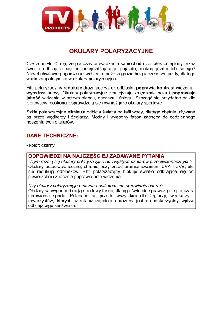 OKULARY POLARYZACYJNE Czy zdarzyło Ci się, że podczas prowadzenia samochodu zostałeś oślepiony przez światło odbijające się od przejeżdżającego pojazdu, mokrej jezdni lub śniegu? Nawet chwilowe pogorszenie widzenia może zagrozić bezpieczeństwu jazdy, dlatego warto zaopatrzyć się w okulary polaryzacyjne. Filtr polaryzacyjny redukuje drażniące wzrok odblaski, poprawia kontrast widzenia i wyostrza barwy. Okulary polaryzacyjne zmniejszają zmęczenie oczu i poprawiają jakość widzenia w ostrym słońcu, deszczu i śniegu. Szczególnie przydatne są dla kierowców, doskonale sprawdzają się również jako okulary sportowe. Szkła polaryzacyjne eliminują odbicia światła od tafli wody, dlatego chętnie używane są przez wędkarzy i żeglarzy. Modny i wygodny fason zachęca do codziennego noszenia tych okularów. DANE TECHNICZNE: - kolor: czarny ODPOWIEDZI NA NAJCZĘŚCIEJ ZADAWANE PYTANIA Czym różnią się okulary polaryzacyjne od zwykłych okularów przeciwsłonecznych? Okulary przeciwsłoneczne, chronią oczy przed promieniowaniem UVA i UVB, ale nie redukują odblasków. Filtr polaryzacyjny blokuje światło odbijające się od powierzchni i znacznie poprawia pole widzenia. Czy okulary polaryzacyjne można nosić podczas uprawiania sportu? Okulary są wygodne i mają sportowy fason, dlatego świetnie sprawdzą się podczas uprawiania sportu. Polecane są przede wszystkim dla żeglarzy, wędkarzy i rowerzystów, których wzrok szczególnie narażony jest na niekorzystny wpływ odbijającego się światła.