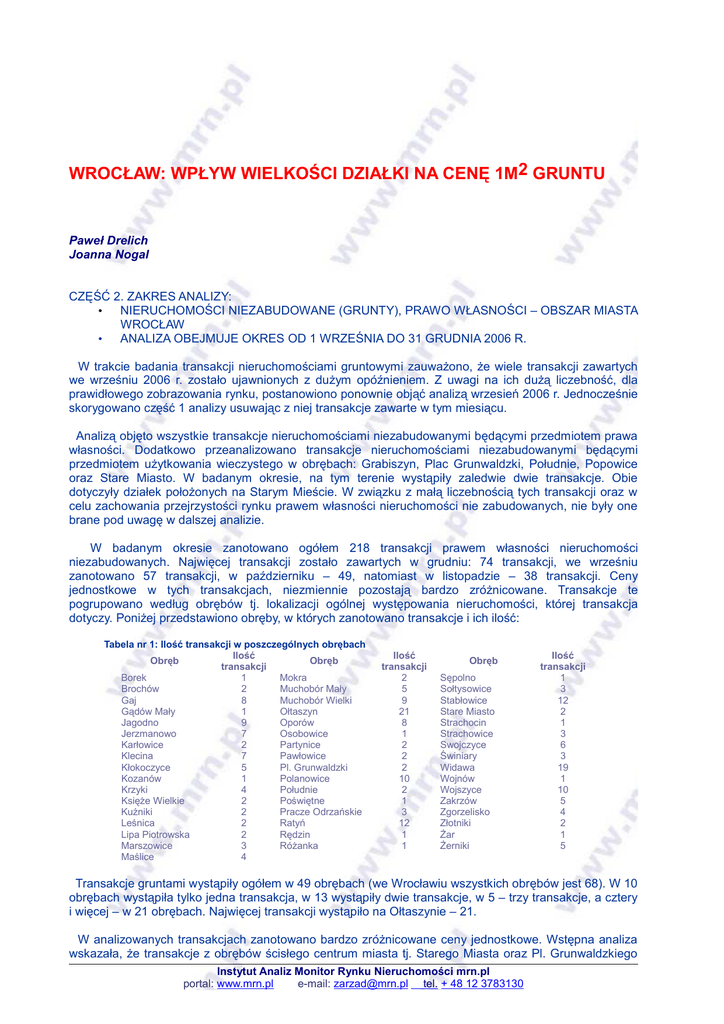 WROCŁAW: WPŁYW WIELKOŚCI DZIAŁKI NA CENĘ 1M2 GRUNTU Paweł Drelich Joanna Nogal CZĘŚĆ 2. ZAKRES ANALIZY: • NIERUCHOMOŚCI NIEZABUDOWANE (GRUNTY), PRAWO WŁASNOŚCI – OBSZAR MIASTA WROCŁAW • ANALIZA OBEJMUJE OKRES OD 1 WRZEŚNIA DO 31 GRUDNIA 2006 R. W trakcie badania transakcji nieruchomościami gruntowymi zauwaŜono, Ŝe wiele transakcji zawartych we wrześniu 2006 r. zostało ujawnionych z duŜym opóźnieniem. Z uwagi na ich duŜą liczebność, dla prawidłowego zobrazowania rynku, postanowiono ponownie objąć analizą wrzesień 2006 r. Jednocześnie skorygowano część 1 analizy usuwając z niej transakcje zawarte w tym miesiącu. Analizą objęto wszystkie transakcje nieruchomościami niezabudowanymi będącymi przedmiotem prawa własności. Dodatkowo przeanalizowano transakcje nieruchomościami niezabudowanymi będącymi przedmiotem uŜytkowania wieczystego w obrębach: Grabiszyn, Plac Grunwaldzki, Południe, Popowice oraz Stare Miasto. W badanym okresie, na tym terenie wystąpiły zaledwie dwie transakcje. Obie dotyczyły działek połoŜonych na Starym Mieście. W związku z małą liczebnością tych transakcji oraz w celu zachowania przejrzystości rynku prawem własności nieruchomości nie zabudowanych, nie były one brane pod uwagę w dalszej analizie. W badanym okresie zanotowano ogółem 218 transakcji prawem własności nieruchomości niezabudowanych. Najwięcej transakcji zostało zawartych w grudniu: 74 transakcji, we wrześniu zanotowano 57 transakcji, w październiku – 49, natomiast w listopadzie – 38 transakcji. Ceny jednostkowe w tych transakcjach, niezmiennie pozostają bardzo zróŜnicowane. Transakcje te pogrupowano według obrębów tj. lokalizacji ogólnej występowania nieruchomości, której transakcja dotyczy. PoniŜej przedstawiono obręby, w których zanotowano transakcje i ich ilość: Tabela nr 1: Ilość transakcji w poszczególnych obrębach Ilość Obręb Obręb transakcji Borek 1 Mokra Brochów 2 Muchobór Mały Gaj 8 Muchobór Wielki Gądów Mały 1 Ołtaszyn Jagodno 9 Oporów Jerzmanowo 7 Osobowice Karłowice 2 Partynice Klecina 7 Pawłowice Kłokoczyce 5 Pl. Grunwaldzki Kozanów 1 Polanowice Krzyki 4 Południe KsięŜe Wielkie 2 Poświętne Kuźniki 2 Pracze Odrzańskie Leśnica 2 Ratyń Lipa Piotrowska 2 Rędzin Marszowice 3 RóŜanka Maślice 4 Ilość transakcji 2 5 9 21 8 1 2 2 2 10 2 1 3 12 1 1 Obręb Sępolno Sołtysowice Stabłowice Stare Miasto Strachocin Strachowice Swojczyce Świniary Widawa Wojnów Wojszyce Zakrzów Zgorzelisko Złotniki śar śerniki Ilość transakcji 1 3 12 2 1 3 6 3 19 1 10 5 4 2 1 5 Transakcje gruntami wystąpiły ogółem w 49 obrębach (we Wrocławiu wszystkich obrębów jest 68). W 10 obrębach wystąpiła tylko jedna transakcja, w 13 wystąpiły dwie transakcje, w 5 – trzy transakcje, a cztery i więcej – w 21 obrębach. Najwięcej transakcji wystąpiło na Ołtaszynie – 21. W analizowanych transakcjach zanotowano bardzo zróŜnicowane ceny jednostkowe. Wstępna analiza wskazała, Ŝe transakcje z obrębów ścisłego centrum miasta tj. Starego Miasta oraz Pl. Grunwaldzkiego Instytut Analiz Monitor Rynku Nieruchomości mrn.pl portal: www.mrn.pl e-mail: [email protected] tel. + 48 12 3783130 od strony północnej oraz Południa od strony południowej mają najwyŜsze ceny jednostkowe. Tak wysokie ceny inwestorzy najczęściej płacą za grunty pod budowę luksusowych apartamentowców. NiŜszy poziom cen zaobserwować moŜna w obrębach połoŜonych w południowej części Wrocławia, równieŜ w tych znajdujących się blisko granic miasta, a więc oddalonych od centrum. W tej samej grupie występują równieŜ transakcje w obrębach znajdujących się w północnej części miasta, ale są to tylko dwa obręby, z czego jeden zaliczany jest do najbardziej prestiŜowych w tej części Wrocławia. NajniŜsze transakcje wystąpiły w obrębach znajdujących się na północnych obrzeŜach Wrocławia: Pracze Odrzańskie – 6,38 zł/m2 oraz Kłokoczycach: 8,00 zł/m 2. NajdroŜsza transakcja wystąpiła w obrębie Południe: 8 242,31 zł/m2. W stosunku do poprzedniego okresu zaobserwowano wzrost cen zarówno minimalnych jak i maksymalnych. Obecnie nie wystąpiła ani jedna transakcja poniŜej 1 zł/m 2 a najniŜsza średnia cena jednostkowa wynosi 24,63 zł/m2 i dotyczy obrębu śar. PoniŜej pogrupowano nieruchomości będące przedmiotem transakcji w poszczególnych obrębach. Przeanalizowano obręby w których wystąpiły 4 i więcej transakcji. Obręby te podzielono na cztery grupy. Kryterium podziału była wysokość średniej ceny jednostkowej w poszczególnych obrębach: • I grupa: przedział średniej ceny jednostkowej od 0 do 99 zł/m2 • II grupa: przedział średniej ceny jednostkowej od 100 do 199 zł/m2 • III grupa: przedział średniej ceny jednostkowej od 200 do 299 zł/m2 • IV grupa: przedział średniej ceny jednostkowej powyŜej 300 do 1 000 zł/m2 W stosunku do poprzedniego okresu podwyŜszono górną granicę grupy IV z 600 do 1 000 zł/m2. Jednocześnie zaznaczyć naleŜy, Ŝe grupa ta powiększyła się o dwa obręby. Grupa V, (średnie ceny jednostkowe powyŜej 1 000 zł/m2), wystąpiła jedynie w obrębach, w których wystąpiły od jednej do trzech transakcji. Ostatecznie powstały następujące grupy: I grupa: przedział średniej ceny od 0 do 99 zł/m2 (ilość transakcji ogółem 49): śar Świniary Lipa Piotrowska Pracze Odrzańskie Pawłowice Kłokoczyce Jerzmanowo Marszowice Brochów Ratyń Złotniki śerniki Rędzin Wojnów 24,63 zł/m2 30,51 zł/m2 46,66 zł/m2 54,29 zł/m2 54,65 zł/m2 58,53 zł/m2 65,32 zł/m2 70,52 zł/m2 71,51 zł/m2 74,22 zł/m2 87,75 zł/m2 94,24 zł/m2 95,55 zł/m2 95,98 zł/m2 II grupa: przedział średniej ceny od 100 do 199 zł/m 2 (ilość transakcji ogółem 84): Zakrzów Strachowice Widawa Polanowice Jagodno Mokra Swojczyce Zgorzelisko Maślice Kozanów Stabłowice Muchobór Wielki 100,75 zł/m2 102,42 zł/m2 103,04 z