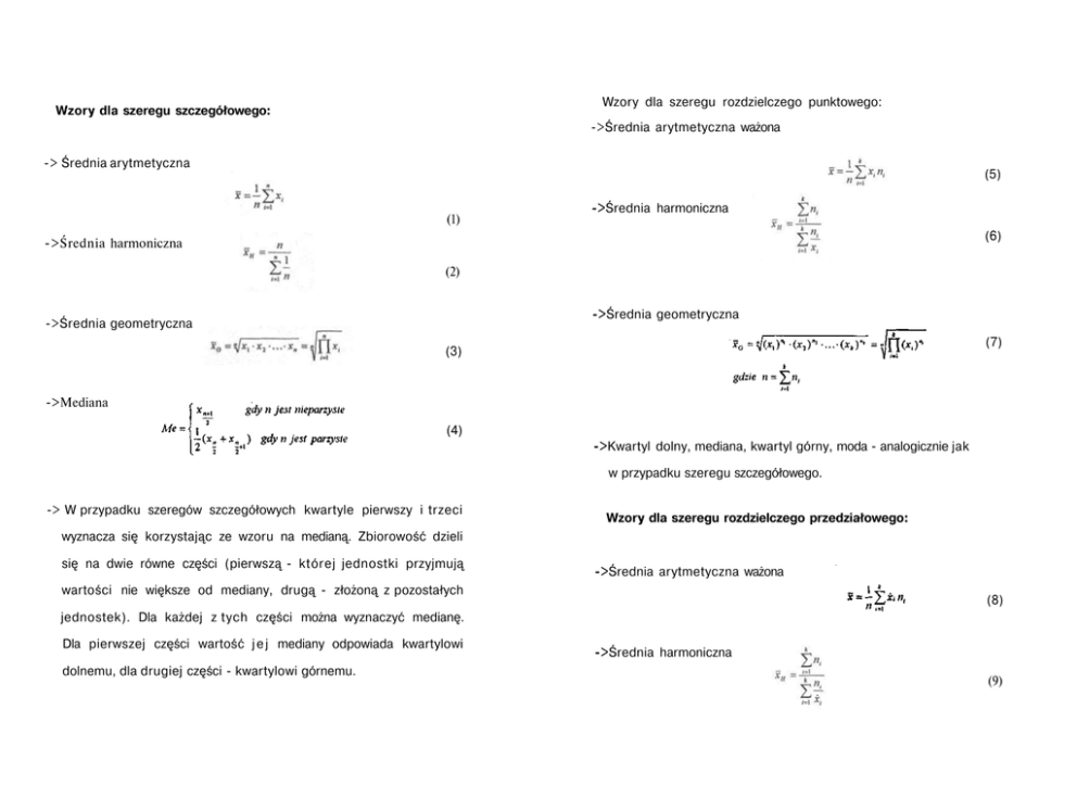 Wzory dla szeregu rozdzielczego punktowego: Wzory dla szeregu szczegółowego: ->Średnia arytmetyczna ważona -> Średnia arytmetyczna (5) (1) ->Średnia harmoniczna (6) ->Średnia harmoniczna (2) ->Średnia geometryczna ->Średnia geometryczna (7) (3) ->Mediana (4) ->Kwartyl dolny, mediana, kwartyl górny, moda - analogicznie jak w przypadku szeregu szczegółowego. -> W przypadku szeregów szczegółowych kwartyle pierwszy i trzeci Wzory dla szeregu rozdzielczego przedziałowego: wyznacza się korzystając ze wzoru na medianą. Zbiorowość dzieli się na dwie równe części (pierwszą - której jednostki przyjmują ->Średnia arytmetyczna ważona wartości nie większe od mediany, drugą - złożoną z pozostałych (8) jednostek). Dla każdej z tych części można wyznaczyć medianę. Dla pierwszej części wartość j e j mediany odpowiada kwartylowi dolnemu, dla drugiej części - kwartylowi górnemu. ->Średnia harmoniczna (9) bezpośrednio poprzedza klasę zawierającą medianą. ->Średnia geometryczna (10) -> Kwartyl górny (13) ->Kwartyl dolny gdzie (11) gdzie dolna granica przedziału zawierającego kwartyl górny, rozpiętość przedziału klasowego, liczebność klasy zawierającej kwartyl górny, - dolna granica przedziału zawierającego kwartyl dolny, rozpiętość przedziału klasowego, - suma liczebności klas od pierwszej do t e j , która - liczebność klasy zawierającej kwartyl dolny, bezpośrednio poprzedza klasę zawierającą kwartyl górny. - suma liczebności klas od pierwszej do t e j , która bezpośrednio poprzedza klasę zawierającą kwartyl dolny ->Moda (14) -> Mediana gdzie (12) gdzie - dolna granica przedziału zawierającego medianę, rozpiętość przedziału klasowego, - liczebność klasy zawierającej medianę, dolna granica przedziału zawierającego modę, rozpiętość przedziału klasowego, liczebność klasy zawierającej modę, liczebność klasy poprzedzającej klasę zawierającą modę, liczebność klasy następującej po klasie zawierającej modę. 3.3. Miary zmienności Miary zmienności (zróżnicowania, dla szeregu szczegółowego rozproszenia, dyspersji) (16) charakteryzują stopień zróżnicowania jednostek zbiorowości pod dla szeregu rozdzielczego punktowego względem badanej cechy. Podstawowe miary zmienności to: rozstęp, wariancja, odchylenie standardowe, współczynnik zmienności, (17) odchylenie ćwiartkowe. Rozstęp (R) charakteryzuje empiryczny obszar dla szeregu rozdzielczego przedziałowego zmienności badanej cechy. Wariancja jest średnią arytmetyczną kwadratów poszczególnych wartości cechy od ich wartości średniej. Dla oznaczenia wariancji w próbie stosuje się s2, -> Odchylenie standardowe (19) natomiast dla ->Typowy klasyczny obszar zmienności cechy oznaczenia wariancji w populacji generalnej Współczynnik zmienności (18) odchyleń (20) (V) - jest wielkością niemianowaną Przyjmuje się, że jeśli V<10%, to cechy wykazują zróżnicowanie ->Współczynnik zmienności (21) statystycznie nieistotne. Duże wartości współczynnika zmienności świadczą o zróżnicowaniu, a więc niejednorodności zbiorowości. Odchylenie ćwiartkowe mierzy poziom zróżnicowania części ->Odchylenie ćwiartkowe (22) jednostek pozostałej po odrzuceniu 25%jednostek o wartościach ->Typowy pozycyjny obszar zmienności cechy najmniejszych i 25% jednostek o wartościach największych. (23) ->Rozstęp (15) ->Wariancja Rys. 6. Rozkhd symetryczny, rozkład lewostronnie asymetryczny i rozkład prawostronnie asymetryczny 3.4. Miary asymetrii Dodatkowym elementem analizy struktury jest badanie asymetrii rozkładu. Jest no wskazane zwłaszcza wtedy, gdy dwie badane zbiorowości charakteryzują się podobnymi charakterystykami liczbowymi (np. dominantą) i rozproszeniem, a jednak dokładniejsza obserwacja szeregu wyklucza podobieństwo struktur rozważanych zbiorowości. położenie O stopniu i kierunku asymetrii wzglądem siebie średniej decyduje wzajemne arytmetycznej, mediany i dominanty. Współczynnik asymetrii (A) - im bliższy zera, tym słabsza asymetria rozkładu. Znak współczynnika mówi o kierunku asymetrii (A<0 - asymetria lewostronna, A>0 - asymetria prawostronna). (24) dla szeregu szczegółowego (25) dla szeregu rozdzielczego punktowego (26) dla szeregu rozdzielczego przedziałowego (27) Rys. 7. Różny stopień koncentracji cechy 3.5. Miary koncentracji Miary asymetrii pozwalają na opis kształtu struktury. Opis ten można uzupełnić poszczególnych o miary obserwacji koncentracji. wokół średniej Miarą jest skupienia współczynnik skupienia K. Im wyższa wartość K, tym bardziej wysmukła krzywa liczebności, czyli większa średniej. Małe wartości koncentracja wartości cechy wokół K wskazują natomiast na spłaszczenie rozkładu badanej cechy. Przyjmuje się, że jeżeli zbiorowość ma rozkład normalny, to K=3, bardziej spłaszczony od normalnego ma K<3, a bardziej wysmukły od normalnego K>3. (28) gdzie . dla szeregu szczegółowego (29) dla szeregu rozdzielczego punktowego (30) dla szeregu rozdzielczego przedziałowego (31) 3.6. Uwagi końcowe Średnia arytmetyczna jest najczęściej wykorzystywaną miarą jednak nie zawsze jest ona dobrym miernikiem tendencji centralnej. Średnia arytmetyczna jest wrażliwa na skrajne wartości cechy. Wartość średniej w przypadku, arytmetycznej kiedy największe może liczebności wprowadzać w błąd skupiają się najniższych lub najwyższych wartości cechy. Podobnie wokół wartość średniej arytmetycznej może wprowadzać w błąd, gdy wyznacza się średnią w przypadku rozkładów niejednorodnych (z kilkoma ośrodkami dominującymi). Ocenę poszczególnych rozkładu (kwartyle - usytuowanie pudełka, a zwłaszcza dzielącej go parametrów uzupełnia tzw. wykres pudełkowy („pudełko z wąsami"). Składa się on z prostokąta, którego dwa pionowe boki wskazują wartość kwartyla dolnego i górnego. Wewnątrz prostokąta zaznacza się media