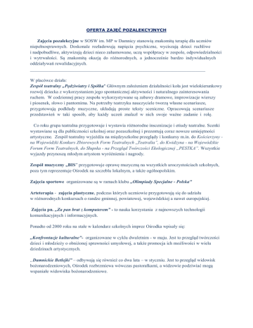 OFERTA ZAJĘĆ POZALEKCYJNYCH Zajęcia pozalekcyjne w SOSW im. MP w Damnicy stanowią znakomitą terapię dla uczniów niepełnosprawnych. Doskonale rozładowują napięcia psychiczne, wyciszają dzieci ruchliwe i nadpobudliwe, aktywizują dzieci nieco zahamowane, uczą współpracy w zespole, odpowiedzialności i wytrwałości. Są znakomitą okazją do różnorodnych, a jednocześnie bardzo indywidualnych oddziaływań rewalidacyjnych. ___________________________________________________________________________ W placówce działa: Zespół teatralny „Pędziwiatry i Spółka" Głównym założeniem działalności koła jest wielokierunkowy rozwój dziecka z wykorzystaniem jego spontanicznej aktywności i naturalnego zainteresowania ruchem. W codziennej pracy zespołu wykorzystywane są zabawy dramowe, improwizacje wierszy i piosenek, słowo i pantomima. Na potrzeby teatrzyku nauczyciele tworzą własne scenariusze, przygotowują podkłady muzyczne, układają proste teksty sceniczne. Opracowują scenariusze przedstawień w taki sposób, aby każdy uczeń znalazł w nich swoje ważne zadanie i rolę. Co roku grupa teatralna przygotowuje i wystawia różnorodne inscenizacje i etiudy teatralne. Scenki wystawiane są dla publiczności szkolnej oraz pozaszkolnej i prezentują coraz nowsze umiejętności artystyczne. Zespół teatralny wyjeżdża na międzyszkolne przeglądy i konkursy m.in. do Kościerzyny na Wojewódzki Konkurs Zbiorowych Form Teatralnych „Teatralia”, do Kwidzyna - na Wojewódzkie Forum Form Teatralnych, do Słupska - na Przegląd Twórczości Ekologicznej „PESTKA”. Wszystkie wyjazdy przynoszą młodym artystom wyróżnienia i nagrody. Zespół muzyczny „BIS” przygotowuje oprawę muzyczną na wszystkich uroczystościach szkolnych, poza tym reprezentuje Ośrodek na szczeblu lokalnym, a także ogólnopolskim. Zajęcia sportowe organizowane są w ramach klubu „Olimpiady Specjalne - Polska" Arteterapia - zajęcia plastyczne, podczas których uczniowie przygotowują się do udziału w różnorodnych konkursach o randze gminnej, powiatowej, wojewódzkiej a nawet europejskiej. Zajęcia pn. „Za pan brat z komputerem” - to nauka korzystania z najnowszych technologii komunikacyjnych i informacyjnych. Ponadto od 2000 roku na stałe w kalendarz szkolnych imprez Ośrodka wpisały się: „Konfrontacje kulturalne”- organizowane w cyklu dwuletnim - w maju. Jest to przegląd twórczości dzieci i młodzieży o obniżonej sprawności umysłowej, a także promocja ich możliwości w wielu dziedzinach artystycznych. „Damnickie Betlejki” – odbywają się również co dwa lata – w styczniu. Jest to przegląd widowisk bożonarodzeniowych, Ośrodek rozbrzmiewa wówczas pastorałkami, a widzowie podziwiać mogą wspaniałe widowiska bożonarodzeniowe.