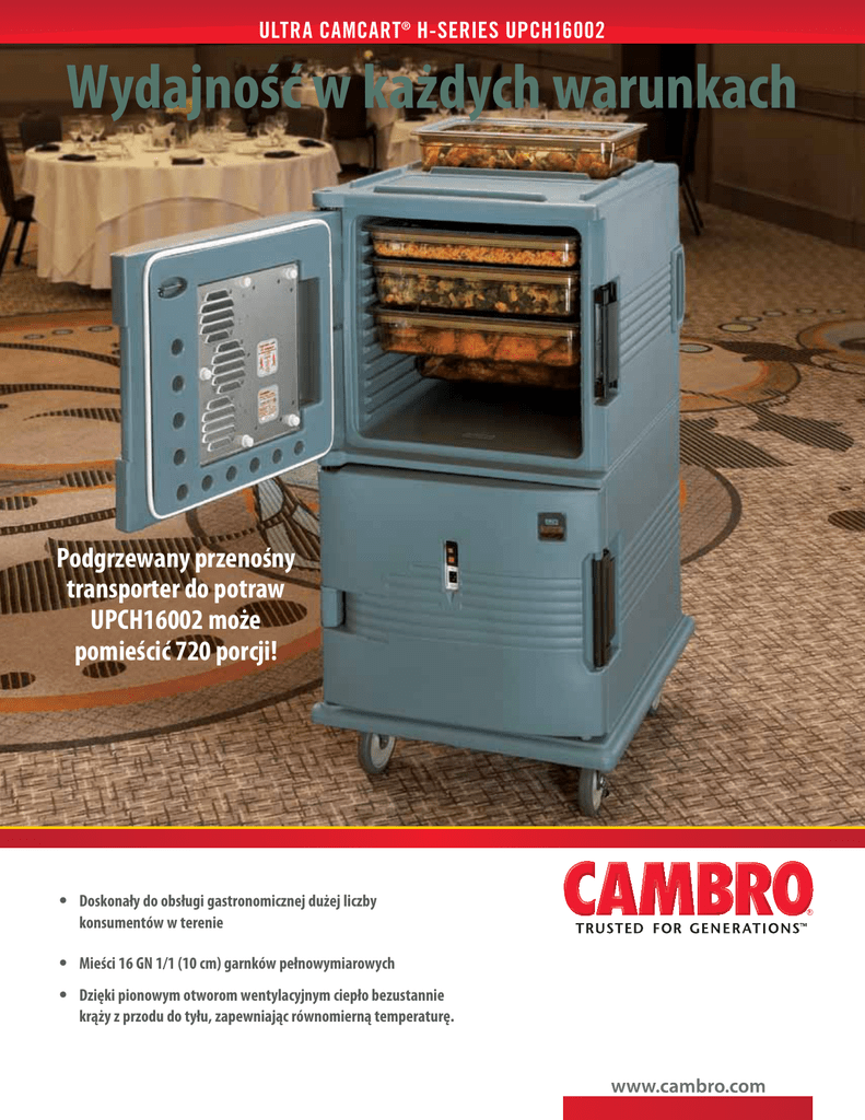 ULTRA CAMCART® H-SERIES UPCH16002 Wydajność w każdych warunkach Podgrzewany przenośny transporter do potraw UPCH16002 może pomieścić 720 porcji! • D oskonały do obsługi gastronomicznej dużej liczby konsumentów w terenie • Mieści 16 GN 1/1 (10 cm) garnków pełnowymiarowych • D zięki pionowym otworom wentylacyjnym ciepło bezustannie krąży z przodu do tyłu, zapewniając równomierną temperaturę. Seria UPCH : Wydajność bez ustępstw K iedy potrzebna jest szafka na potrawy i przenośny izolowany transporter, nie ma potrzeby, aby iść na ustępstwa. Seria izotermicznych transporterów UPCH oferuje niezrównaną trwałość i wydajność. Bez względu na to, ile osób trzeba nakarmić i bez względu na temperaturę otoczenia, któryś model UPCH przekroczy twoje oczekiwania. • Łagodne nie promieniujące ciepło 65˚–74˚C nie gotuje potraw i utrzymuje ich wilgotność. • Pozwala przechowywać różne rodzaje potraw, jak makarony, smażone kurczaki i kruche ciasta z nadzieniem. • Czas podgrzewania od temperatury pokojowej 45 minut. Energy Star Wszystkie modele UPCH mają zatwierdzony znak Energy Star, to znaczy że maksymalnie wykorzystują energię. Wskaźniki zasilania i ogrzewania Wskaźniki UPCH1600(2) informują o stanie zasilania i podgrzewania. Od razu widać, gdy temperatura wewnątrz osiągnie żądaną wartość. • Przywrócenie temperatur po otwarciu i zamknięciu drzwiczek trwa trzy minuty. •Zużycie energii znacznie mniejsze niż w podobnych szafkach metalowych. • Modele z podgrzewanymi tylko górnymi drzwiczkami mają tę zaletę, że szafka górna utrzymuje wysoką temperaturę, podczas gdy dolna jest izolowana i biernie utrzymuje ciepłe lub zimne potrawy. Pionowe żaluzje Dzięki pionowym otworom wentylacyjnym ciepło bezustannie krąży z przodu do tyłu, zapewniając równomierną temperaturę we wnętrzu. • Zestawy drzwiczek podgrzewanych również sprzedawane oddzielnie do zastosowania w UPC400, UPC800 i UPC1600. Odporna powierzchnia zewnętrzna Wszystkie modele UPCH są wykonane z twardego polietylenu, z poliuretanową pianką izolacyjną, która utrzymuje gorąco wewnątrz, gdy zewnętrzna powierzchnia jest chłodna w dotyku. Zastosowania UPCH16002: Duże imprezy Sytuacje, gdy trzeba często otwierać i zamykać drzwiczki Miejsca wymagające trwałości Klienci domagający się stale takiej samej wydajności Klient poszukujący trwałej i niezawodnej alternatywy dla drogich szafek metalowych Izolacja Izolacja z wolnej od freonu, spienianej miejscowo pianki poliuretanowej utrzymuje temperaturę powyżej 65°C przez ponad cztery godziny po odłączeniu zasilania. Modele UPCH4002 i UPCH8002 mają wbudowane termometry, które łatwo można wyjąć i umyć. UPCH16j002 ma termometr wewnętrzny, pokazujący temperaturę we wnętrzu szafki. Top Loaders 2 x 4 in 3 x 2 1/2 in 1 x 6 in Wyłącznik pozwala dowolnie włączać i wyłączać urządzenie bez odłączania kabla zasilania. Front Loaders Wykaz pojemności serii UPCH 1 x 8 in Nadlewane zderzaki zapewniają dodatkową ochronę. 4 x 2 1/2 in 3 x 4 in 2 x 6 in cm in 6 x 26,51/2 4 x410incm cm 3 x 615in 1 x 8 in & 1 x 2 1/2 in Front Loaders ŁADOWANE Z PRZODU UPCH400 UPCH4002 UPCH800 (x2) UPCH8002 (x2) UPCH1600 (x4) UPCH16002 (x4) (na szafkę) (na szafkę) 2 x 820incm (na szafkę) (na szafkę) Liczba porcji w garnkach Garnek GN 1/1 Głębokość: Pojemność Serving Portions Per Pan: (240 mL) 20 cm 25,6 L 80 9/1 15 cm 19,5 L 60 6/1 4/1 10 cm 13 L 40 3/1 6,5 cm 8,5 L 30 2/1 gnol 2/1 lluf Ultra Camcart® serii H MODELE Specyfikacje elektryczne Napięcie zasilania Prąd maks. Moc Częstotliwość Rodzaj wtyczki Odmienne rodzaje wtyków i złączy (dla określonych krajów) Długość sznura zasilania UPCH400 / UPCH800 MODELE 110V UPCH4002 / UPCH8002 MODELE 220V UPCH1600 MODELE 110V UPCH16002 MODELE 220V 100 - 120 V 2,0 A 230 W 50/60 NeMa 5-15P C15 / C16 200 - 230 V 1,2 A 265 W 50/60 wtyczka Euro , CEE7 C15 / C16 2,7m 2,7m 100 - 125 V 4,6 A 529 W 50/60 5-15P na C15RA JIS8303 na C15RA (Japonia) 2,7m 200 - 230 V 2,3 A 506 W 50/60 CEE7/7 na C15RA BS1363 na C15RA (Wielka Brytania, Irlandia i inne) 2,7m UTRZYMANIE CIEPŁA NAGRZEWANIE (Od temp. otoczenia do wysokiej) PODGRZEWANIE* (Powrót do wysokiej temp. po otwarciu drzwi na 30 sekund) CZAS TRANSPORTU* (Czas po nagrzaniu, gdy szafkę można wyłączyć aż wystygnie do 65˚C) 65˚C - 74˚C od 24,4°C do 65°C w 45 min. 3 Minuty ponad 4 godziny Utrzymanie ciepła bez dopływu prądu UPCH16002 87,8˚C 82,8˚C 81,7˚C Temperatura początkowa 1 godz. 2 godz. 80˚C 3 godz. 78,9˚C 4 godz. *Na podstawie testu sześciu pojemników H 15,2 cm w pokrywami GripLids®, napełnionymi ok. 14,2 lwody o temperaturze 87,7˚C. (Jest to temperatura wody, a nie powietrza w wózku). KOD OPIS WYMIARY SZER. x GŁ. x WYS. WYMIARY WNĘTRZA SZER. x GŁ. x WYS. UPCH400 UPCH4002 UPCH800 UPCH8002 UPCH1600 UPCH16002 UPCHT1600 UPCHT16002 UPCHTD1600* UPCHTD16002* UPCHBD1600* UPCHBD16002* UPCHTR1600 UPCHTR16002 Podgrzewany termos Ultra do pojemników, 110 V Podgrzewany termos Ultra do pojemników, 220 V Podgrzewany Ultra Camcart, 110 V Podgrzewany Ultra Camcart, 220 V Podgrzewany Ultra Camcart, 110 V Podgrzewany Ultra Camcart, 220 V Ultra Camcart z podgrzewaniem tylko górnych drzwiczek, 110 V Ultra Camcart z podgrzewaniem tylko górnych drzwiczek, 220 V Podgrzewane ulepszone drzwiczki zamienne do UPC1600, 110 V Podgrzewane ulepszone drzwiczki zamienne do UPC1600, 220 V Podgrzewane ulepszone drzwiczki zamienne do UPC1600, 110 V Podgrzewane ulepszone drzwiczki zamienne do UPC1600, 220 V Podgrzewany Ultra Camcart, model zabezpieczony, 110V Podgrzewany Ultra Camcart, model zabezpieczony, 220V 46 x 67 x 63 cm 46 x 67 x 63 cm 52 x 69 x 137,2 cm 52 x 69 x 137,2 cm 73 x 84,7 x 137,5 cm 73 x 84,7 x 137,5 cm 73 x 84,7 x 137,5 cm 73 x 84,7 x 137,5 cm 66,8 x 10,8 x 53,3 cm 66,8 x 10,8 x 53,3 cm 66,8 x 10,8 x 53,7 cm 66,8 x 10,8 x 53,7 cm 73 x 84,7 x 137,5 cm 73 x 84,7 x 137,5 cm 33,5