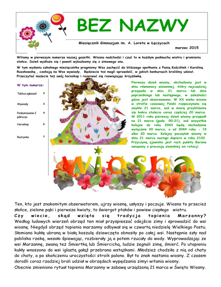 BEZ NAZWY Miesięcznik Gimnazjum im. A. Loreta w Łęczycach marzec 2015 Witamy w pierwszym numerze naszej gazetki. Wiosna nadchodzi i czuć to w każdym podmuchu wiatru i promieniu słońca. Dzień wydłuża się i powoli wybudzamy się z zimowego snu. W tym wydaniu szkolnego miesięcznika pragniemy Was zachęcić do bliższego spotkania z Panią Kościółek i Karoliną Ruszkowską , czekają na Was wywiady. Będziecie też mogli sprawdzić, w jakich konkursach braliśmy udział. Przeczytać możecie też swój horoskop i rozerwać się rozwiązując krzyżówkę. W tym numerze: Tablica ogłoszeń 2 Wywiady 3 Podsumowanie I półrocza 4 Horoskop 6 Rozrywka 7 Pierwszy dzień wiosny, obchodzony jest w dniu równonocy wiosennej, który najczęściej przypada w dniu 21 marca lub dnia poprzedniego lub następnego, w zależności gdzie jest obserwowana. W XX wieku wiosna w strefie czasowej Polski rozpoczynała się zwykle 21 marca, zaś w miarę przybliżania się końca stulecia coraz częściej 20 marca. W 2011 roku pierwszy dzień wiosny przypadł na 21 marca (godz. 00:21), zaś wszystkie kolejne do roku 2043 będą obchodzone wyłącznie 20 marca, a od 2044 roku - 19 albo 20 marca. Kolejny początek wiosny w dniu 21 marca nastąpi dopiero w roku 2102. Przyczyną zjawiska jest ruch punktu Barana związany z precesją ziemskiej osi rotacji. Ten, kto jest znakomitym obserwatorem, ujrzy wiosnę, usłyszy i poczuje. Wiosna to przecież słońce, zielone pąki i pierwsze kwiaty, to świergot ptaków i powiew ciepłego wiatru. Czy wiecie, skąd wzięła się tradycja topienia Marzanny? Według ludowych wierzeń obrzęd ten miał przyspieszać odejście zimy i sprowadzić do wsi wiosnę. Niegdyś obrzęd topienia marzanny odbywał się w czwartą niedzielę Wielkiego Postu. Słomiana kukłę ubraną w białą koszulę dziewczęta obnosiły po całej wsi. Następnie szły nad pobliska rzekę, wesoło śpiewając, rozbierały ją a potem rzucały do wody. Wyprowadzając ze wsi Marzannę, zwaną też Śmiertką lub Śmiercichą, ludzie żegnali zimę, śmierć. Po utopieniu kukły wnoszono do wsi iglastą gałąź przebrana wstążkami. Młodzież chodziła z nią od chaty do chaty, a po skończeniu uroczystości stroik palono. Był to znak nastania wiosny. Z czasem dorośli coraz rzadziej brali udział w obrzędach wypędzania zimyi witania wiosny. Obecnie zmieniono rytuał topienia Marzanny w zabawę urządzoną 21 marca w Święto Wiosny. TABLICA OGŁOSZEŃ GIEŁDA SZKÓŁ 2015 Pragnąc przybliżyć ofertę kształcenia dla młodzieży nasze Gimnazjum organizuje tzw. dni otwarte. W najbliższym czasie 24 marca (wtorek) odbędą się w szkole Dni otwarte dla szkół ponadgimnazjalnych. Giełda rozpocznie się o godz. 9:00. Uczniowie oraz ich rodzice/opiekunowie prawni będą mogli zapoznać się z ofertą edukacyjną szkół z powiatu lęborskiego i wejherowskiego, z realizowanymi przez nie przedsięwzięciami oraz będą mieli możliwość bezpośredniego kontaktu z przedstawicielami szkół ponadgimnazjalnych. Mamy nadzieję, że pomoże to uczniom w wyborze dalszej drogi kształcenia. ZAPRASZAMY I ZACHĘCAMY RODZICÓW do udziału w Giełdzie. Szczegółowy harmonogram przebiegu prezentacji szkół zostanie opublikowany na stronie internetowej szkoły. ******************************************************************************* Zapraszamy wszystkich chętnych do udziału w konkursach. Więcej INFO na stronie internetowej szkoły. *************************************************************************** Zbieramy baterie OGÓLNOPOLSKI PROGRAM EDUKACYJNY - ZBIERAJ BATERIE Gimnazjum im. Adama Loreta w Łęczycach przystąpiło do OGÓLNOPOLSKIEGO PROGRAMU EDUKACYJNEGO - ZBIERAJ BATERIE. Organizatorem programu jest Zakład Gospodarki Komunalnej Organizacja Odzysku BIOSYSTEM S.A. Zbiórka zużytych baterii i akumulatorów odbywa się przez cały rok szkolny. Dwa razy w roku, pod koniec każdego semestru, placówki oświatowe biorą udział w MIESIĄCU FINAŁOWYM ZBIÓRKI ZUŻYTYCH BATERII i AKUMULATORÓW, podczas którego następuje podsumowanie zbiórki zużytych baterii oraz wyłonienie zwycięzców w celu przyznania atrakcyjnych nagród! Zachęcamy wszystkich uczniów, nauczycieli i rodziców do zbierania zużytych baterii i akumulatorów. W tym celu w budynku szkoły zostały umieszczone specjalne pojemniki w salach 16 i 17. Osoby odpowiedzialne: p. W. Piankowska, p. S. Formela. Więcej informacji o programie znajduje się na stronie www.ecowyobraznia.pl/baterie. ************************************************************************************************ PRZYPOMINAMY, ŻE W TYM ROKU SZKOLNYM NA REKOLECJE WIELKOPOSTNE UCZĘSZCZAMY INDYWIDUALNIE W SWOICH PARAFIACH. NIE BĘDZIE DNI WOLNYCH. ************************************************************************************************ SPOTKANIA Z RODZICAMI/OPIEKUNAMI PRAWNYMI UCZNIÓW GIMNAZJUM ODBĘDĄ SIĘ 18.03.2014R. (ŚRODA). GODZINY SPOTKAŃ ZOSTANĄ PODANE UCZNIOM. ************************************************************************************************ W NAJBLIŻSZYM CZASIE ODBĘDZIE SIĘ DEBATA UCZNIOWSKA NA TEMAT ANGAŻOWANIA SIĘ W ŻYCIE SZKOŁY! ADRES STRONY INTERNETOWEJ: www.zs-leczyce.pl 2 Wywiady Dziś dla naszej gazetki wypowiadały się: Pani Barbara Kościółek. R: Opowie nam Pani o swojej pracy? B: Uczę w szkole prawie 31 lat. Na początku przez trzy lata uczyłam geografii. Po powrocie z urlopu macierzyńskiego podjęłam studia i rozpoczęłam pracę jako polonistka. W związku ze swoimi zainteresowaniami później skończyłam studia podyplomowe z historii. R: Co zadecydowało, że została Pani nauczycielem? B: Zawsze chciałam nim być, w dzieciństwie bawiłam się w szkołę. Uczyłam młodszych kolegów, czy im się to podobało, czy nie. R: Czy lubi Pani swoją pracę? B: Bardzo lubię swoją pracę. Uwielbiam pracę z uczniami, ale nie lubię papierologii, która jest z moją pracą związana. R: Coś