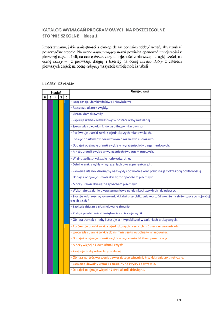 KATALOG WYMAGAŃ PROGRAMOWYCH NA POSZCZEGÓLNE STOPNIE SZKOLNE – klasa 1 Przedstawiamy, jakie umiejętności z danego działu powinien zdobyć uczeń, aby uzyskać poszczególne stopnie. Na ocenę dopuszczający uczeń powinien opanować umiejętności z pierwszej części tabeli; na ocenę dostateczny umiejętności z pierwszej i drugiej części; na ocenę dobry – z pierwszej, drugiej i trzeciej; na ocenę bardzo dobry z czterech pierwszych części; na ocenę celujący wszystkie umiejętności z tabeli. I. LICZBY I DZIAŁANIA Umiejętności Stopień 6 5 4 3 2 • Rozpoznaje ułamki właściwe i niewłaściwe. • Rozszerza ułamek zwykły. • Skraca ułamek zwykły. • Zapisuje ułamek niewłaściwy w postaci liczby mieszanej. • Sprowadza dwa ułamki do wspólnego mianownika. • Porównuje ułamki zwykłe o jednakowych mianownikach. • Stosuje do ułamków porównywanie różnicowe i ilorazowe. • Dodaje i odejmuje ułamki zwykłe w wyrażeniach dwuargumentowych. • Mnoży ułamki zwykłe w wyrażeniach dwuargumentowych. • W zbiorze liczb wskazuje liczby odwrotne. • Dzieli ułamki zwykłe w wyrażeniach dwuargumentowych. • Zamienia ułamek dziesiętny na zwykły i odwrotnie oraz przybliża je z określoną dokładnością. • Dodaje i odejmuje ułamki dziesiętne sposobem pisemnym. • Mnoży ułamki dziesiętne sposobem pisemnym. • Wykonuje działanie dwuargumentowe na ułamkach zwykłych i dziesiętnych. • Stosuje kolejność wykonywania działań przy obliczaniu wartości wyrażenia złożonego z co najwyżej trzech działań. • Zapisuje działania sformułowane słownie. • Podaje przybliżenia dziesiętne liczb. Szacuje wyniki. • Oblicza ułamek z liczby i stosuje ten typ obliczeń w zadaniach praktycznych. • Porównuje ułamki zwykłe o jednakowych licznikach i różnych mianownikach. • Sprowadza ułamki zwykłe do najmniejszego wspólnego mianownika. • Dodaje i odejmuje ułamki zwykłe w wyrażeniach kilkuargumentowych. • Mnoży więcej niż dwa ułamki zwykłe. • Znajduje liczbę odwrotną do danej. • Oblicza wartość wyrażenia zawierającego więcej niż trzy działania arytmetyczne. • Zamienia dowolny ułamek dziesiętny na zwykły i odwrotnie. • Dodaje i odejmuje więcej niż dwa ułamki dziesiętne. 1/1 Stopień 6 5 4 Umiejętności 3 2 • Sprowadza więcej niż dwa ułamki zwykłe do wspólnego mianownika. • Dobiera najdogodniejszą metodę porównywania ułamków zwykłych. • Oblicza liczbę na podstawie jej ułamka. • Oblicza, jaką częścią jednej liczby jest druga liczba. • Porównuje ułamek zwykły i dziesiętny. • Wskazuje okresy rozwinięć dziesiętnych nieskończonych okresowych. • Oblicza niewiadomy składnik, odjemnik, odjemną, dzielnik, dzielną, czynnik. • Rozwiązuje zadania praktyczne prowadzące do porównywania różnicowego i ilorazowego, obliczania ułamka z liczby, liczby na podstawie jej ułamka oraz wartości wyrażenia. • Porządkuje zbiory liczb zawierające ułamki zwykłe i dziesiętne dowolną metodą. • Wstawia nawiasy w wyrażeniu tak, by otrzymać równość. • Zamienia jednostki, np. długości, masy. • Wybiera ze zbioru ułamków zwykłych te, które mają rozwinięcie dziesiętne skończone lub nieskończone okresowe. • Rozwiązuje zadania złożone lub problemowe zadania tekstowe, m.in. z zastosowaniem obliczeń na ułamkach. • Buduje kwadrat magiczny z wykorzystaniem ułamków. • Wyjaśnia, kiedy nie można zamienić ułamka zwykłego na ułamek dziesiętny skończony. • Oblicza wartość wyrażenia zawierającego ułamek wielopiętrowy. • Zamienia ułamek okresowy na zwykły. 2/2 II. PROCENTY Stopień 6 5 4 3 Umiejętności 2 • Zapisuje ułamki o mianownikach np. 100, 25, 4 w postaci procentów. • Zapisuje procent wyrażony liczbą całkowitą w postaci ułamka. • Odczytuje i zaznacza wskazany procent pola figury (25%, 50%). • Stosuje algorytm obliczania procentu danej liczby całkowitej, wykorzystując również kalkulator. • Zamienia każdą liczbę na procent. • Zamienia procenty na liczbę. • Odczytuje i zaznacza wskazany procent figury (20%, 25%, 50%, 75%). • Stosuje obliczanie procentu danej wielkości w zadaniach praktycznych (np. dotyczące ceny). • Stosuje wybrany algorytm obliczania liczby na podstawie danego jej procentu. • Stosuje wybrany algorytm obliczania, jakim procentem jednej liczby jest druga liczba. • Zaznacza dowolny procent figury. • Odczytuje, jaki procent figury jest zaznaczony złożone przypadki. • Oblicza liczbę na podstawie danego jej procentu oraz jakim procentem jednej liczby jest druga liczba. • Rozwiązuje typowe zadania tekstowe dotyczące obliczeń procentowych – obniżki, podwyżki, oprocentowanie lokat i kredytów, stężenia procentowe, próby złota i srebra. • Stosuje wzór na odsetki od kapitału (bez jego przekształcania) przy dowolnej lokacie terminowej. • Stosuje podstawowe obliczenia procentowe w zadaniach złożonych, problemach. • Stosuje w sytuacjach praktycznych wzór na kapitalizację odsetek. • Zdobyte wiadomości stosuje w praktyce np. potrafi efektywnie oszacować oprocentowania w różnych bankach, określić stężenie roztworu. • Swobodnie stosuje pojęcie promila w zadaniach praktycznych z zakresu jubilerstwa. • Stosuje w sytuacjach praktycznych wzór na procent składany. 3/3 III. FIGURY GEOMETRYCZNE Stopień 6 5 4 3 Umiejętności 2 • Wskazuje i nazywa podstawowe figury geometryczne. • Mierzy odcinki. • Rozróżnia rodzaje kątów i mierzy kąty ostre i rozwarte. • Rozróżnia kąty: wierzchołkowe, przyległe, naprzeciwległe i odpowiadające. • Rozróżnia i nazywa trójkąty ze względu na boki i kąty. • Stosuje twierdzenie o sumie miar kątów wewnętrznych trójkąta. • Rozróżnia czworokąty. • Rozróżnia okrąg, koło, promień, średnicę, cięciwę. Rysuje okrąg o podanym promieniu. • Wskazuje trójkąty przystające. • St