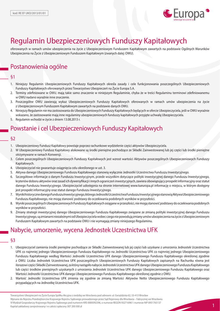 kod: RE EF UKO/2013/01/01 Regulamin Ubezpieczeniowych Funduszy Kapitałowych oferowanych w ramach umów ubezpieczenia na życie z Ubezpieczeniowym Funduszem Kapitałowym zawartych na podstawie Ogólnych Warunków Ubezpieczenia na Życie z Ubezpieczeniowym Funduszem Kapitałowym (zwanych dalej: OWU). Postanowienia ogólne §1 1. Niniejszy Regulamin Ubezpieczeniowych Funduszy Kapitałowych określa zasady i cele funkcjonowania poszczególnych Ubezpieczeniowych Funduszy Kapitałowych oferowanych przez Towarzystwo Ubezpieczeń na Życie Europa S.A. 2. Terminy zdefiniowane w OWU, mają takie samo znaczenie w niniejszym Regulaminie, chyba że w treści Regulaminu terminowi zdefiniowanemu w OWU nadano wyraźnie inne znaczenie. 3. Poszczególne OWU zawierają wykaz Ubezpieczeniowych Funduszy Kapitałowych oferowanych w ramach umów ubezpieczenia na życie z Ubezpieczeniowym Funduszem Kapitałowym zawartych na podstawie danych OWU. 4. Niniejszy Regulamin nie ma zastosowania do Ubezpieczeniowych Funduszy Kapitałowych będących w ofercie Ubezpieczyciela, jeśli w OWU wyraźnie wskazano, że zastosowanie mają inne regulaminy ubezpieczeniowych funduszy kapitałowych przyjęte uchwałą Ubezpieczyciela. 5. Regulamin wchodzi w życie z dniem 13.08.2013 r. Powstanie i cel Ubezpieczeniowych Funduszy Kapitałowych §2 1. Ubezpieczeniowy Fundusz Kapitałowy powstaje poprzez rachunkowe wydzielenie części aktywów Ubezpieczyciela. 2. W Ubezpieczeniowy Fundusz Kapitałowy alokowane są środki pieniężne pochodzące ze Składki Zainwestowanej lub jej części lub środki pieniężne otrzymywane w ramach Konwersji. 3. Celem poszczególnych Ubezpieczeniowych Funduszy Kapitałowych jest wzrost wartości Aktywów poszczególnych Ubezpieczeniowych Funduszy Kapitałowych. 4. Ubezpieczyciel nie gwarantuje osiągnięcia celu określonego w ust. 3. 5. Aktywa danego Ubezpieczeniowego Funduszu Kapitałowego stanowią wyłącznie Jednostki Uczestnictwa Funduszu Inwestycyjnego. 6. Szczegółowe informacje o danym Funduszu Inwestycyjnym, przede wszystkim dotyczące polityki inwestycyjnej danego Funduszu Inwestycyjnego, kryteriów doboru aktywów oraz zasad ich dywersyfikacji i innych ograniczeń inwestycyjnych, zawiera obowiązujący prospekt informacyjny oraz statut danego Funduszu Inwestycyjnego. Ubezpieczyciel udostępnia na stronie internetowej www.tueuropa.pl informację o miejscu, w którym dostępny jest prospekt informacyjny oraz statut danego Funduszu Inwestycyjnego. 7. Wyniki historyczne danego Funduszu Inwestycyjnego, którego Jednostki Uczestnictwa Funduszu Inwestycyjnego stanowią Aktywa Ubezpieczeniowego Funduszu Kapitałowego, nie mogą stanowić podstawy do oczekiwania podobnych wyników w przyszłości. 8. Wyniki poszczególnych Ubezpieczeniowych Funduszy Kapitałowych osiągane w przeszłości, nie mogą stanowić podstawy do oczekiwania podobnych wyników w przyszłości. 9. Zmiany strategii inwestycyjnej danego Ubezpieczeniowego Funduszu Kapitałowego związane ze zmianą polityki inwestycyjnej danego Funduszu Inwestycyjnego, są zmianami niezależnymi od Ubezpieczyciela wobec czego nie powodują zmiany umów ubezpieczenia na życie z Ubezpieczeniowym Funduszem Kapitałowym zawartych na podstawie OWU i nie wymagają zmiany niniejszego Regulaminu. Nabycie, umorzenie, wycena Jednostek Uczestnictwa UFK §3 1. Ubezpieczyciel zamienia środki pieniężne pochodzące ze Składki Zainwestowanej lub jej części lub uzyskane z umorzenia Jednostek Uczestnictwa UFK co najmniej jednego Ubezpieczeniowego Funduszu Kapitałowego na Jednostki Uczestnictwa UFK co najmniej jednego Ubezpieczeniowego Funduszu Kapitałowego według Wartości Jednostki Uczestnictwa UFK danego Ubezpieczeniowego Funduszu Kapitałowego określonej zgodnie z OWU. Liczba Jednostek Uczestnictwa UFK poszczególnych Ubezpieczeniowych Funduszy Kapitałowych zapisanych na Rachunku równa jest ilorazowi części Składki Zainwestowanej, za którą nastąpiło nabycie Jednostek Uczestnictwa UFK danego Ubezpieczeniowego Funduszu Kapitałowego lub części środków pieniężnych uzyskanych z umorzenia Jednostek Uczestnictwa UFK danego Ubezpieczeniowego Funduszu Kapitałowego oraz Wartości Jednostki Uczestnictwa UFK danego Ubezpieczeniowego Funduszu Kapitałowego określonej zgodnie z OWU. 2. Wartość Jednostki Uczestnictwa UFK zmienia się zgodnie ze zmianą Wartości Aktywów Netto Ubezpieczeniowego Funduszu Kapitałowego przypadających na Jednostkę Uczestnictwa UFK. Towarzystwo Ubezpieczeń na Życie Europa Spółka Akcyjna z siedzibą we Wrocławiu pod adresem: ul. Gwiaździsta 62, 53-413 Wrocław Wpisane do Rejestru Przedsiębiorców Krajowego Rejestru Sądowego prowadzonego przez Sąd Rejonowy dla Wrocławia – Fabrycznej we Wrocławiu VI Wydział Gospodarczy Krajowego Rejestru Sądowego pod numerem KRS 0000092396, o numerze REGON 932716961 i numerze NIP 8951765137 Kapitał zakładowy zarejestrowany i w całości opłacony 307 200 000 zł 1 3. Wartość Jednostki Uczestnictwa UFK równa jest wartości danej Jednostki Uczestnictwa Funduszu Inwestycyjnego, wchodzącej w Aktywa Ubezpieczeniowego Funduszu Kapitałowego. 4. Wartość Jednostki Uczestnictwa UFK ustalana jest na każdy Dzień Wyceny, przy czym tak ustalona wartość obowiązuje do kolejnego Dnia Wyceny. Jeżeli w Dniu Wyceny nie została opublikowana wartość Jednostki Funduszu Inwestycyjnego, wówczas za Wartość Jednostki Uczestnictwa UFK przyjmuje się ostatnią opublikowaną wartość Jednostki Uczestnictwa Funduszu Inwestycyjnego, chyba że z zapisów OWU wynika inaczej. 5. Umorzenie Jednostek Uczestnictwa UFK polega na zamianie Jednostek Uczestnictwa UFK na środki pieniężne według Wartości Jednostki Uczestnictwa UFK określonej zgodnie z OWU i jest równoznaczna ze zmniejszeniem Aktywów Ubezpieczeniowego Funduszu Kapitałowego. 6. Umorzenie wszystkich Jednostek Uczestnictwa UFK każdego z Ubezpieczeniowych Funduszy Kapitałowych zapisanych na Rachunku następuje w