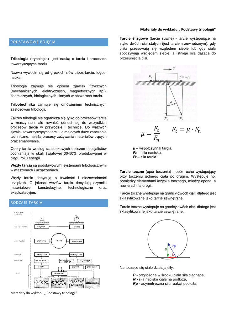 Materiały do wykładu „ Podstawy tribologii” PODSTAWOWE POJĘCIA Tribologia (trybologia) towarzyszących tarciu. jest nauką o tarciu i procesach Tarcie ślizgowe (tarcie suwne) - tarcie występujące na styku dwóch ciał stałych (jest tarciem zewnętrznym), gdy ciała przesuwają się względem siebie lub gdy ciała spoczywają względem siebie, a istnieje siła dążąca do przesunięcia ciał. Nazwa wywodzi się od greckich słów tribos-tarcie, logosnauka. Tribologia zajmuje się opisem zjawisk fizycznych (mechanicznych, elektrycznych, magnetycznych itp.), chemicznych, biologicznych i innych w obszarach tarcia. Tribotechnika zajmuje się omówieniem technicznych zastosowań tribologii. Zakres tribologii nie ogranicza się tylko do procesów tarcia w maszynach, ale również odnosi się do wszystkich procesów tarcia w przyrodzie i technice. Do ważnych zjawisk towarzyszących tarciu, a mających duże znaczenie techniczne, należą procesy zużywania materiałów trących oraz smarowanie. Opory tarcia według szacunkowych obliczeń specjalistów pochłaniają w skali światowej 30-50% produkowanej w ciągu roku energii. Węzły tarcia są podstawowymi systemami tribologicznymi w maszynach i urządzeniach. Węzły tarcia decydują o trwałości i niezawodności urządzeń. O jakości węzłów tarcia decydują czynniki materiałowe, konstrukcyjne, technologiczne oraz eksploatacyjne. ∙ µ – współczynnik tarcia, Fn – siła nacisku, Ft – siła tarcia. Tarcie toczne (opór toczenia) - opór ruchu występujący przy toczeniu jednego ciała po drugim. Występuje np. pomiędzy elementami łożyska tocznego, między oponą, a nawierzchnią drogi. Tarcie toczne występuje na granicy dwóch ciał i dlatego jest sklasyfikowane jako tarcie zewnętrzne. RODZAJE TARCIA Tarcie toczne występuje na granicy dwóch ciał i dlatego jest sklasyfikowane jako tarcie zewnętrzne. Na toczące się ciało działają siły: P - przyłożona w środku ciała siła ciągnąca, N - siła nacisku ciała na podłoże, Rp - asymetryczna siła reakcji podłoża. Materiały do wykładu „ Podstawy tribologii” Materiały do wykładu „ Podstawy tribologii” Oznacza to że składowa pionowa siły reakcji równoważy siłę nacisku, a składowa pozioma równoważy siłę ciągnącą, przeciwdziałając ruchowi walca, a przez analogię do tarcia ślizgowego nazywana jest siłą tarcia tocznego. Z czego wynika: gdzie: Ft- siła tarcia tocznego, f - współczynnik tarcia tocznego,[m], R - promień toczonego walca, N - siła nacisku ciała na podłoże. Zjawisko „stic-slip” - można opisać jako naprzemienne przywieranie do siebie i przesuwanie powierzchni trących czemu towarzyszy odpowiednio zmiana siły tarcia. Zazwyczaj siła tarcia statycznego jest większa niż siła tarcia kinetycznego. Jeśli przyłożona do ciała siła jest wystarczająco duża, aby przezwyciężyć tarcie statyczne następuje poślizg (tarcie kinetyczne) co powoduje znaczną redukcję siły tarcia . Efektem jest nagły wzrost prędkości poślizgu, a następnie ponowne zatrzymanie ciała trącego. Tarcie wewnętrzne - tarcie między poruszającymi się względem siebie cząsteczkami materii (cieczy, gazów lub ciała stałego). Tarcie zewnętrzne - tarcie występujące na styku dwóch ciał stałych będących w ruchu lub w spoczynku. Wartości współczynnika tarcia łożysk tocznych Wartość obliczeniowego współczynnika tarcia tocznego µobl (określonego jako stosunek siły popychającej łożysko P do obciążenia normalnego N). Współczynnik tarcia tocznego łożysk zależy nie tylko od obciążeń normalnych, ale także od obciążeń osiowych, wywołujących częściowo tarcie między kulkami a bocznymi powierzchniami bieżni. Ze wzrostem prędkości względnej toczenia kulek wartość współczynnika tarcia µobl maleje. Tarcie statyczne (spoczynkowe) - tarcie występujące w skojarzeniu trącym wówczas, gdy dwa stykające się ciała są względem siebie w spoczynku. Tarcie kinetyczne (ruchowe) - tarcie występujące w skojarzeniu trącym podczas względnego przemieszania się dwóch różnych ciał, jako tzw. tarcie zewnętrzne lub różnych części jednego ciała, jako tzw. tarcie wewnętrzne. a). tarcie wewnętrzne, b).tarcie zewnętrzne, c).tarcie płynne, d). tarcie graniczne, e). tarcie suche A- tarcie suche; B - tarcie graniczne; C - tarcie półsuche; D - tarcie płynne, 1 - środek smarny, 2 - film smarny Materiały do wykładu „ Podstawy tribologii” Materiały do wykładu „ Podstawy tribologii” Tarcie suche – tarcie występujące w skojarzeniu trącym, gdy współpracujące powierzchnie nie są rozdzielone całkowicie lub częściowo środkiem smarnym. Charakterystyka nierówności powierzchni: Styk dwóch ciał odbywa się jedynie na drobnej części powierzchni nominalnej Tarcie suche jest opisane prawami, dla których wyjaśnienie jest ujmowane następującymi teoriami: Tomilsona – tarcie jest rezultatem wzajemnego oddziaływania sił międzycząsteczkowych, jakie występują na trących się powierzchniach; Dieragina – tarcie jest wynikiem pokonywania nierówności na powierzchniach trących ciał; Kragielskiego – tarcie jest wynikiem odkształcania materiału (spęcznianie spotęgowane powstawaniem fal odkształceniowych) w pobliżu powierzchni; Bowdena-Tabora – tarcie jest spowodowane powstawaniem i zrywaniem mikrospoin, występujących w punktach styku mikronierówności. ↓ ↓ ↑ \ Re – Granica plastyczności warstwy wierzchniej s/h > 1000 – odchyłka kształtu, 50 < s/h < 1000 – falistość, 5 < s/h< 50 – chropowatość. Mały współczynnika tarcia mają materiały które charakteryzują się małą wytrzymałością na ścinanie i dużą twardością. Np. PTFE, grafit, MoS2 Konturowa powierzchnia styku AC występuje wówczas, gdy stykające się powierzchnie są faliste. Powierzchnia konturowa jest sumą obszarów styku na szczytach fal. Rodzaje styku Rzeczy