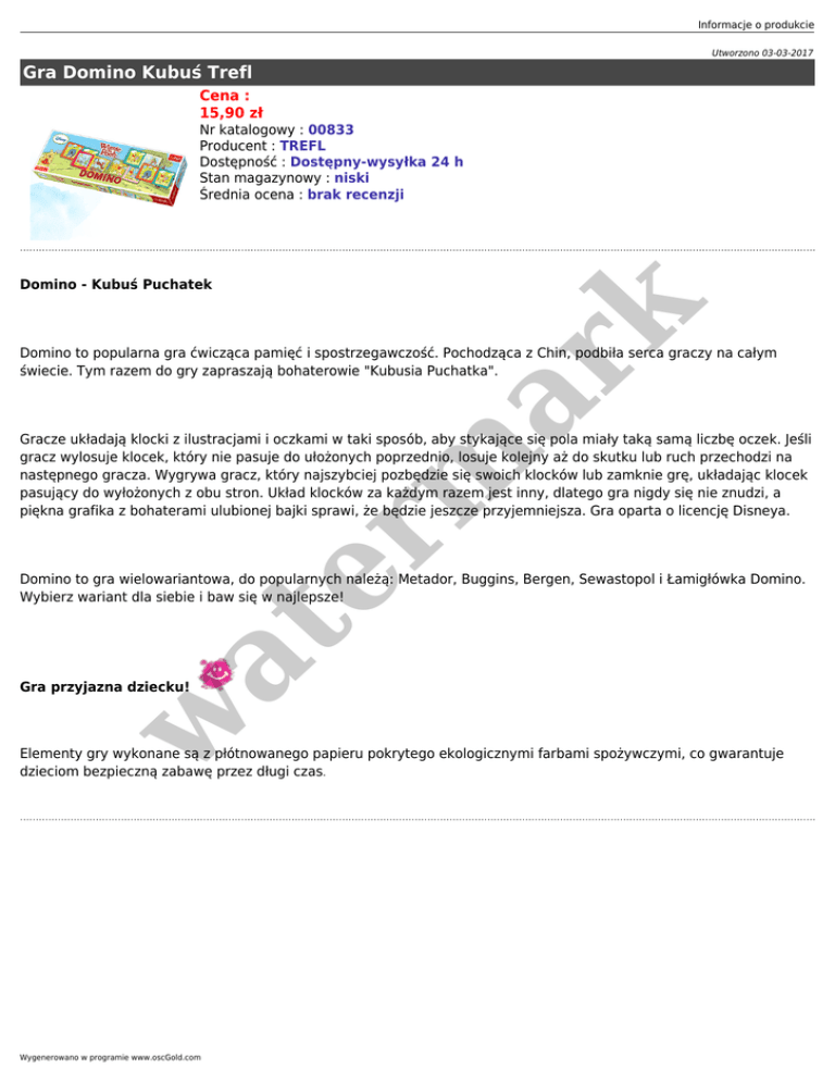 Informacje o produkcie Utworzono 03-03-2017 Gra Domino Kubuś Trefl Cena : 15,90 zł Nr katalogowy : 00833 Producent : TREFL Dostępność : Dostępny-wysyłka 24 h Stan magazynowy : niski Średnia ocena : brak recenzji er m ar k Domino - Kubuś Puchatek Domino to popularna gra ćwicząca pamięć i spostrzegawczość. Pochodząca z Chin, podbiła serca graczy na całym świecie. Tym razem do gry zapraszają bohaterowie "Kubusia Puchatka". Gracze układają klocki z ilustracjami i oczkami w taki sposób, aby stykające się pola miały taką samą liczbę oczek. Jeśli gracz wylosuje klocek, który nie pasuje do ułożonych poprzednio, losuje kolejny aż do skutku lub ruch przechodzi na następnego gracza. Wygrywa gracz, który najszybciej pozbędzie się swoich klocków lub zamknie grę, układając klocek pasujący do wyłożonych z obu stron. Układ klocków za każdym razem jest inny, dlatego gra nigdy się nie znudzi, a piękna grafika z bohaterami ulubionej bajki sprawi, że będzie jeszcze przyjemniejsza. Gra oparta o licencję Disneya. at Domino to gra wielowariantowa, do popularnych należą: Metador, Buggins, Bergen, Sewastopol i Łamigłówka Domino. Wybierz wariant dla siebie i baw się w najlepsze! w Gra przyjazna dziecku! Elementy gry wykonane są z płótnowanego papieru pokrytego ekologicznymi farbami spożywczymi, co gwarantuje dzieciom bezpieczną zabawę przez długi czas. Wygenerowano w programie www.oscGold.com