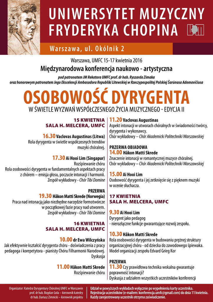 UNIWERSYTET MUZYCZNY FRYDERYKA CHOPINA Wa r s z awa , u l. O kó l n i k 2 Warszawa, UMFC 15-17 kwietnia 2016 Międzynarodowa konferencja naukowo - artystyczna pod patronatem JM Rekatora UMFC prof. dr hab. Ryszarda Zimaka oraz honorowym patronatem Jego Ekscelencji Ambasadora Republiki Litewskiej w Rzeczypospolitej Polskiej Šarūnasa Adomavičiusa OSOBOWOŚĆ DYRYGENTA W ŚWIETLE WYZWAŃ WSPÓŁCZESNEGO ŻYCIA MUZYCZNEGO - EDYCJA II 15 KWIETNIA 11.20 Vaclovas Augustinas SALA H. MELCERA, UMFC Aspekt intonacji w utworach chóralnych w świadomości twórcy, dyrygenta i wykonawcy. 16.30 Vaclovas Augustinas (Litwa) Chór wykładowy – Chór Akademicki Politechniki Warszawskiej Rola dyrygenta w świetle współczesnych trendów muzyki chóralnej. PRZERWA OBIADOWA 14.00 Håkon Matti Skrede 17.30 Ai Hooi Lim (Singapur) Znaczenie intonacji w romantycznej muzyce chóralnej. Rozśpiewanie chóru Chór wykładowy – Chór Akademicki Politechniki Warszawskiej Rola osobowości dyrygenta w fundamentalnych aspektach pracy z chórem – emisja głosu, poczucie intonacji i harmonii. 15.00 Ai Hooi Lim Zespół wykładowy - Chór Tibi Domine Osobowość dyrygenta i jej zetknięcie się z pięknem muzyki w ocenie słuchacza. PRZERWA 19.30 Håkon Matti Skrede (Norwegia) 17 KWIETNIA Praca nad intonacją jako niezbędne narzędzie formotwórcze SALA H. MELCERA, UMFC w początkowej fazie pracy nad utworem. Zespół wykładowy - Chór Tibi Domine 9.30 Ai Hooi Lim Dyrygent jako pedagog 16 KWIETNIA - nierozłączne funkcje gwarantujące rozwój zespołu. SALA H. MELCERA, UMFC 10.30 Håkon Matti Skrede 10.00 dr Ewa Wilczyńska Rola osobowości dyrygenta w budowaniu prężnej struktury Jak efektywnie kształcić dyrygenta chóru - doświadczenia z pracy organizacyjnej chóru - od dziecka do zawodowego śpiewaka. pedagoga i korepetytora - pianisty Chóru Filharmonii Narodowej. Model organizacji zespołu Edvard Grieg Kor Dyskusja PRZERWA 11.00 Håkon Matti Skrede 11.30 Czy prawidłowa technika wokalna gwarantuje Rozśpiewanie chóru poprawność intonacji? Dyskusja z udziałem wszystkich uczestników konferencji Organizator: Katedra Dyrygentury Chóralnej UMFC w Warszawie prof. dr hab. Bogdan Gola – kierownik katedry dr hab. Dariusz Zimnicki – kierownik projektu Udział w powyższych wykładach wyłącznie po wypełnieniu karty uczestnika. Rejestracja uczestników (e-mailem: [email protected]) do dnia 11 kwietnia. Każdy zarejestrowany uczestnik otrzyma zaświadczenie. wstęp wolny – zapraszamy