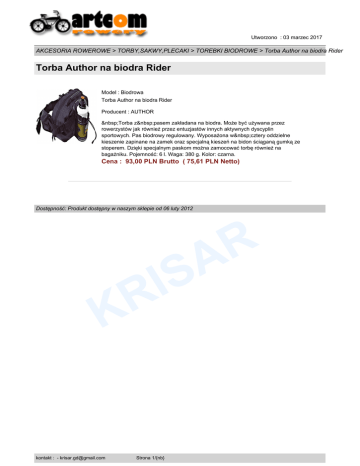 Utworzono : 03 marzec 2017 AKCESORIA ROWEROWE > TORBY,SAKWY,PLECAKI > TOREBKI BIODROWE > Torba Author na biodra Rider Torba Author na biodra Rider Model : Biodrowa Torba Author na biodra Rider Producent : AUTHOR Torba z pasem zakładana na biodra. Może być używana przez rowerzystów jak również przez entuzjastów innych aktywnych dyscyplin sportowych. Pas biodrowy regulowany. Wyposażona w cztery oddzielne kieszenie zapinane na zamek oraz specjalną kieszeń na bidon ściąganą gumką ze stoperem. Dzięki specjalnym paskom można zamocować torbę również na bagażniku. Pojemność: 6 l. Waga: 380 g. Kolor: czarna. Cena : 93,00 PLN Brutto ( 75,61 PLN Netto) Dostępność: Produkt dostępny w naszym sklepie od 06 luty 2012 R A K kontakt : - [email protected] S I R Strona 1/{nb}