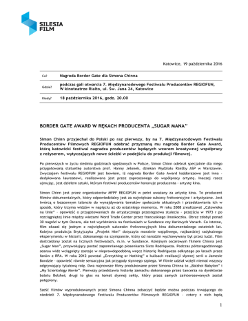 Katowice, 19 października 2016 Co? Nagroda Border Gate dla Simona Chinna Gdzie? podczas gali otwarcia 7. Międzynarodowego Festiwalu Producentów REGIOFUN, W kinoteatrze Rialto, ul. Św. Jana 24, Katowice Kiedy? 18 października 2016, godz. 20.00 BORDER GATE AWARD W RĘKACH PRODUCENTA „SUGAR MANA” Simon Chinn przyjechał do Polski po raz pierwszy, by na 7. Międzynarodowym Festiwalu Producentów Filmowych REGIOFUN odebrać przyznaną mu nagrodę Border Gate Award, którą katowicki festiwal nagradza producentów będących wzorem kreatywnej współpracy z reżyserem, wytyczających nowe ścieżki w podejściu do produkcji filmowej. Po pierwszych w życiu siedmiu godzinach spędzonych w Polsce, Simon Chinn odebrał specjalnie dla niego przygotowaną statuetkę autorstwa prof. Hanny Jelonek, dziekan Wydziału Rzeźby ASP w Warszawie. Zwyczajem festiwalu REGIOFUN jest bowiem, iż nagroda Border Gate Award każdorazowo jest inna dedykowana laureatowi, realizowana jest przez zaproszonego do współpracy artystę. Inaczej rzecz ujmując, jest dziełem sztuki, którym festiwal producentów honoruje producenta - artystę kina. Simon Chinn jest przez organizatorów MFPF REGIOFUN w pełni uważany za artystę kina. To producent filmów dokumentalnych, który odpowiedzialny jest za największe sukcesy frekwencyjne i artystyczne. Jest twórcą o bezcennym talencie do wynajdywania tematów społecznie aktualnych i przedstawiania ich w sposób, który trzyma widzów w napięciu aż do ostatniego momentu. W roku 2008 zrealizował „Człowieka na linie” – opowieść o przygotowaniach do artystycznego przestępstwa stulecia - przejścia w 1973 r po rozciągniętej linie między wieżami Word Trade Center przez francuskiego linoskoczka. Obraz zdobył ponad 30 nagród w tym Oscara, ale też wyróżnienia na festiwalach w Sundance czy Karlovych Varach. Co istotne, film okazał się jednym z największych sukcesów frekwencyjnych kina dokumentalnego ostatnich lat. Kolejna produkcja Brytyjczyka „Projekt Nim” dotyczyła moralnie wątpliwego, najbardziej radykalnego eksperymentu w historii, dokonanego na szympansie, który od narodzin wychowywany był przez ludzi. Film dostrzeżony został na licznych festiwalach, m.in. w Sundance. Kolejnym oscarowym filmem Chinna jest „Sugar Man”, przywołujący postać zapomnianego piosenkarza Sixto Rodriqueza. Podczas półtoragodzinnego seansu widz wciągnięty zostaje w nieprawdopodobną wręcz historię Rodrigueza odkrytego po latach przez fanów z RPA. W roku 2012 powstał „Everything or Nothing” o kulisach realizacji słynnej serii o Jamesie Bondzie – opowieść równie sensacyjna jak przygody słynnego szpiega. W filmie udział wzięli niemal wszyscy odgrywający tytułową rolę. Dwa najnowsze filmy produkowane przez Simona Chinna to „Balshoi Babylon” i „My Scientology Movie”. Pierwszy przedstawia historię zamachu dokonanego przez tancerza na dyrektorze baletu Bolshoi; drugi to głos na temat słynnej sekty, który przez samych zainteresowanych został potępiony. Sześć filmów wyprodukowanych przez Simona Chinna zobaczyć będzie można podczas trwającego do niedzieli 7. Międzynarodowego Festiwalu Producentów Filmowych REGIOFUN – cztery z nich będą 1 pokazywane w Polsce premierowo. Z widzami festiwalu Simon Chinn spotka się w Kinoteatrze Rialto dzisiaj, 19 października po projekcji filmu „My Scientology Movie” (pokaz filmu rozpocznie się o godzinie 16.30, spotkanie w Ogrodzie Gwiazd przewidziane jest na godzinę 18.10). Nagroda Border Gate Award przyznawana jest wybitnym osobowościom z branży producenckiej. Po raz pierwszy została przyznana podczas 5. edycji MFPF Regiofun - otrzymał ją Peter Aalbaeck Jensen, producent filmów Larsa von Triera. Rok później wyróżnienie przyznano Piotrowi Dzięciołowi, założycielowi firmy Opus Film, która wyprodukowała nagrodzoną Oskarem „Idę”. Kontakt dla dziennikarzy — Magdalena Gościniak rzecznik prasowy Instytucji Filmowej SILESIA FILM K. 502 752 296 @. [email protected] 2