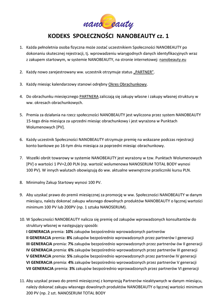 KODEKS SPOŁECZNOŚCI NANOBEAUTY cz. 1 1. Każda pełnoletnia osoba fizyczna może zostać uczestnikiem Społeczności NANOBEAUTY po dokonaniu skutecznej rejestracji, tj. wprowadzeniu wiarygodnych danych identyfikacyjnych wraz z zakupem startowym, w systemie NANOBEAUTY, na stronie internetowej: nanobeauty.eu 2. Każdy nowo zarejestrowany ww. uczestnik otrzymuje status „PARTNER”. 3. Każdy miesiąc kalendarzowy stanowi odrębny Okres Obrachunkowy. 4. Do obrachunku miesięcznego PARTNERA zaliczają się zakupy własne i zakupy własnej struktury w ww. okresach obrachunkowych. 5. Premia za działania na rzecz społeczności NANOBEAUTY jest wyliczona przez system NANOBEAUTY 15-tego dnia miesiąca za uprzedni miesiąc obrachunkowy i jest wyrażona w Punktach Wolumenowych [PV]. 6. Każdy uczestnik Społeczności NANOBEAUTY otrzymuje premię na wskazane podczas rejestracji konto bankowe po 16-tym dniu miesiąca za poprzedni miesiąc obrachunkowy. 7. Wszelki obrót towarowy w systemie NANOBEAUTY jest wyrażony w tzw. Punktach Wolumenowych [PV] o wartości 1 PV=2,00 PLN (np. wartość wolumenowa NANOSERUM TOTAL BODY wynosi 100 PV). W innych walutach obowiązują do ww. aktualne wewnętrzne przeliczniki kursu PLN. 8. Minimalny Zakup Startowy wynosi 100 PV. 9. Aby uzyskać prawo do premii miesięcznej za promocję w ww. Społeczności NANOBEAUTY w danym miesiącu, należy dokonać zakupu własnego dowolnych produktów NANOBEAUTY o łącznej wartości minimum 100 PV lub 200PV (np. 1 sztuka NANOSERUM). 10. W Społeczności NANOBEAUTY nalicza się premię od zakupów wprowadzonych konsultantów do struktury własnej w następujący sposób: I GENERACJA premia: 10% zakupów bezpośrednio wprowadzonych partnerów II GENERACJA premia: 8% zakupów bezpośrednio wprowadzonych przez partnerów I generacji III GENERACJA premia: 7% zakupów bezpośrednio wprowadzonych przez partnerów ów II generacji IV GENERACJA premia: 6% zakupów bezpośrednio wprowadzonych przez partnerów III generacji V GENERACJA premia: 5% zakupów bezpośrednio wprowadzonych przez partnerów IV generacji VI GENERACJA premia: 4% zakupów bezpośrednio wprowadzonych przez partnerów V generacji VII GENERACJA premia: 3% zakupów bezpośrednio wprowadzonych przez partnerów VI generacji 11. Aby uzyskać prawo do premii miesięcznej z kompresją Partnerów nieaktywnych w danym miesiącu, należy dokonać zakupu własnego dowolnych produktów NANOBEAUTY o łącznej wartości minimum 200 PV (np. 2 szt. NANOSERUM TOTAL BODY KODEKS SPOŁEC ZNOŚCI NANOBEAUTY cz. 2 obowiązuje od 01 – 03 – 2016 r. Każda osoba fizyczna może zostać Menadżerem i VIP Społeczności NANOBEAUTY . Decyduje o tym comiesięcznie odpowiedni poziom obrotu własnej struktury oraz obrót własnej struktury menedżerskiej. MENADŻER I Stopnia otrzymuje bonus menadżerski 1% obrotu całej struktury, liczonego w PV wraz z zakupami własnymi. Warunkiem podstawowym jest całkowity ww. obrót struktury w wysokości 10.000 PV. W przypadku powstania tzw. potokowej linii menadżerskiej warunkiem uzyskania nominacji jest jednoczesne posiadanie „z boku” obrotu 2.500 PV własnej struktury menedżerskiej. MENADŻER II Stopnia otrzymuje bonus menadżerski 2% obrotu całej struktury, liczonego w PV wraz z zakupami własnymi. Warunkiem podstawowym jest całkowity ww. obrót struktury w wysokości 25.000 PV oraz jednocześnie posiadanie „z boku” obrotu 5.000 PV własnej struktury menedżerskiej. MENADŻER III Stopnia otrzymuje bonus menadżerski 3% obrotu całej struktury, liczonego w PV wraz z zakupami własnymi. Warunkiem podstawowym jest całkowity ww. obrót struktury w wysokości 50.000 PV oraz jednocześnie posiadanie „z boku” obrotu 10.000 PV własnej struktury menedżerskiej. MENADŻER IV Stopnia otrzymuje bonus menadżerski 4% obrotu całej struktury, liczonego w PV wraz z zakupami własnymi. Warunkiem podstawowym jest całkowity ww. obrót struktury w wysokości 100.000 PV oraz jednocześnie posiadanie „z boku” obrotu 15.000 PV własnej struktury menedżerskiej. Ponadto: Każdy aktywny* menadżer stopnia IV otrzymuje automatycznie status VIP i uzyskuje prawo do dodatkowej miesięcznej premii VIP wyliczanej z koszyka VIP (2% miesięcznego obrotu całej światowej struktury NANOBEAUTY), liczonej proporcjonalnie wg zasad tzw. średniej ważonej. Status menadżera jest obliczany comiesięcznie z całego obrotu własnych grup menadżerskich, jego własnej grupy menadżerskiej oraz zakupów własnych. *Aktywność menadżera stopnia IV polega na samodzielnym zorganizowaniu i prowadzeniu w danym miesiącu minimum czterech spotkań informacyjnych Akademii NanoBeauty. Każdy aktywny* menadżer stopnia III otrzymuje automatycznie status VIP i uzyskuje prawo do dodatkowej miesięcznej premii VIP wyliczanej z koszyka VIP (1% miesięcznego obrotu całej światowej struktury NANOBEAUTY), liczonej proporcjonalnie wg zasad tzw. średniej ważonej. Status menadżera jest obliczany comiesięcznie z całego obrotu własnych grup menadżerskich, jego własnej grupy menadżerskiej oraz zakupów własnych. *Aktywność menadżera stopnia IV polega na samodzielnym zorganizowaniu i prowadzeniu w danym miesiącu minimum trzech spotkań informacyjnych Akademii NanoBeauty. Każdy aktywny* menadżer stopnia II otrzymuje automatycznie status VIP i uzyskuje prawo do dodatkowej miesięcznej premii VIP wyliczanej z koszyka VIP (0,5% miesięcznego obrotu całej światowej struktury NANOBEAUTY), liczonej proporcjonalnie wg zasad tzw. średniej ważonej. Status menadżera jest obliczany comiesięcznie z całego obrotu własnych grup menadżerskich, jego własnej grupy menadżerskiej oraz zakupów własnych. *Aktywność menadżera stopnia II polega na samodzielnym zorganizowaniu i prowadzeniu w danym miesiącu minimum dwóch spotkań informacyjnych Akademii NanoBeauty. W sytuacji gdy pod danym menadżerem pojawi się menadżer stopnia równego lub wyższego, wypłacone będą: pełna pr