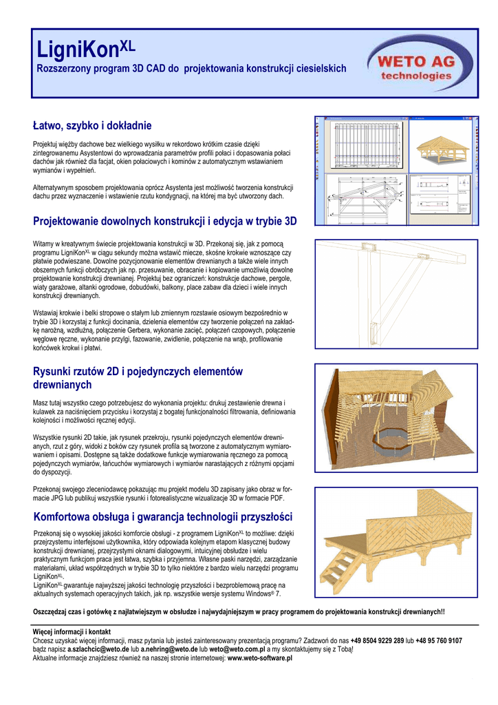 LigniKonXL Rozszerzony program 3D CAD do projektowania konstrukcji ciesielskich Łatwo, szybko i dokładnie Projektuj więźby dachowe bez wielkiego wysiłku w rekordowo krótkim czasie dzięki zintegrowanemu Asystentowi do wprowadzania parametrów profili połaci i dopasowania połaci dachów jak równieŜ dla facjat, okien połaciowych i kominów z automatycznym wstawianiem wymianów i wypełnień. Alternatywnym sposobem projektowania oprócz Asystenta jest moŜliwość tworzenia konstrukcji dachu przez wyznaczenie i wstawienie rzutu kondygnacji, na której ma być utworzony dach. Projektowanie dowolnych konstrukcji i edycja w trybie 3D Witamy w kreatywnym świecie projektowania konstrukcji w 3D. Przekonaj się, jak z pomocą programu LigniKonXL w ciągu sekundy moŜna wstawić miecze, skośne krokwie wznoszące czy płatwie podwieszane. Dowolne pozycjonowanie elementów drewnianych a takŜe wiele innych obszernych funkcji obróbczych jak np. przesuwanie, obracanie i kopiowanie umoŜliwią dowolne projektowanie konstrukcji drewnianej. Projektuj bez ograniczeń: konstrukcje dachowe, pergole, wiaty garaŜowe, altanki ogrodowe, dobudówki, balkony, place zabaw dla dzieci i wiele innych konstrukcji drewnianych. Wstawiaj krokwie i belki stropowe o stałym lub zmiennym rozstawie osiowym bezpośrednio w trybie 3D i korzystaj z funkcji docinania, dzielenia elementów czy tworzenie połączeń na zakładkę naroŜną, wzdłuŜną, połączenie Gerbera, wykonanie zacięć, połączeń czopowych, połączenie węglowe ręczne, wykonanie przylgi, fazowanie, zwidlenie, połączenie na wrąb, profilowanie końcówek krokwi i płatwi. Rysunki rzutów 2D i pojedynczych elementów drewnianych Masz tutaj wszystko czego potrzebujesz do wykonania projektu: drukuj zestawienie drewna i kulawek za naciśnięciem przycisku i korzystaj z bogatej funkcjonalności filtrowania, definiowania kolejności i moŜliwości ręcznej edycji. Wszystkie rysunki 2D takie, jak rysunek przekroju, rysunki pojedynczych elementów drewnianych, rzut z góry, widoki z boków czy rysunek profila są tworzone z automatycznym wymiarowaniem i opisami. Dostępne są takŜe dodatkowe funkcje wymiarowania ręcznego za pomocą pojedynczych wymiarów, łańcuchów wymiarowych i wymiarów narastających z róŜnymi opcjami do dyspozycji. Przekonaj swojego zleceniodawcę pokazując mu projekt modelu 3D zapisany jako obraz w formacie JPG lub publikuj wszystkie rysunki i fotorealistyczne wizualizacje 3D w formacie PDF. Komfortowa obsługa i gwarancja technologii przyszłości Przekonaj się o wysokiej jakości komforcie obsługi - z programem LigniKonXL to moŜliwe: dzięki przejrzystemu interfejsowi uŜytkownika, który odpowiada kolejnym etapom klasycznej budowy konstrukcji drewnianej, przejrzystymi oknami dialogowymi, intuicyjnej obsłudze i wielu praktycznym funkcjom praca jest łatwa, szybka i przyjemna. Własne paski narzędzi, zarządzanie materiałami, układ współrzędnych w trybie 3D to tylko niektóre z bardzo wielu narzędzi programu LigniKonXL. LigniKonXL gwarantuje najwyŜszej jakości technologię przyszłości i bezproblemową pracę na aktualnych systemach operacyjnych takich, jak np. wszystkie wersje systemu Windows® 7. Oszczędzaj czas i gotówkę z najłatwiejszym w obsłudze i najwydajniejszym w pracy programem do projektowania konstrukcji drewnianych!! Więcej informacji i kontakt Chcesz uzyskać więcej informacji, masz pytania lub jesteś zainteresowany prezentacją programu? Zadzwoń do nas +49 8504 9229 289 lub +48 95 760 9107 bądz napisz [email protected] lub [email protected] lub [email protected] a my skontaktujemy się z Tobą! Aktualne informacje znajdziesz równieŜ na naszej stronie internetowej: www.weto-software.pl