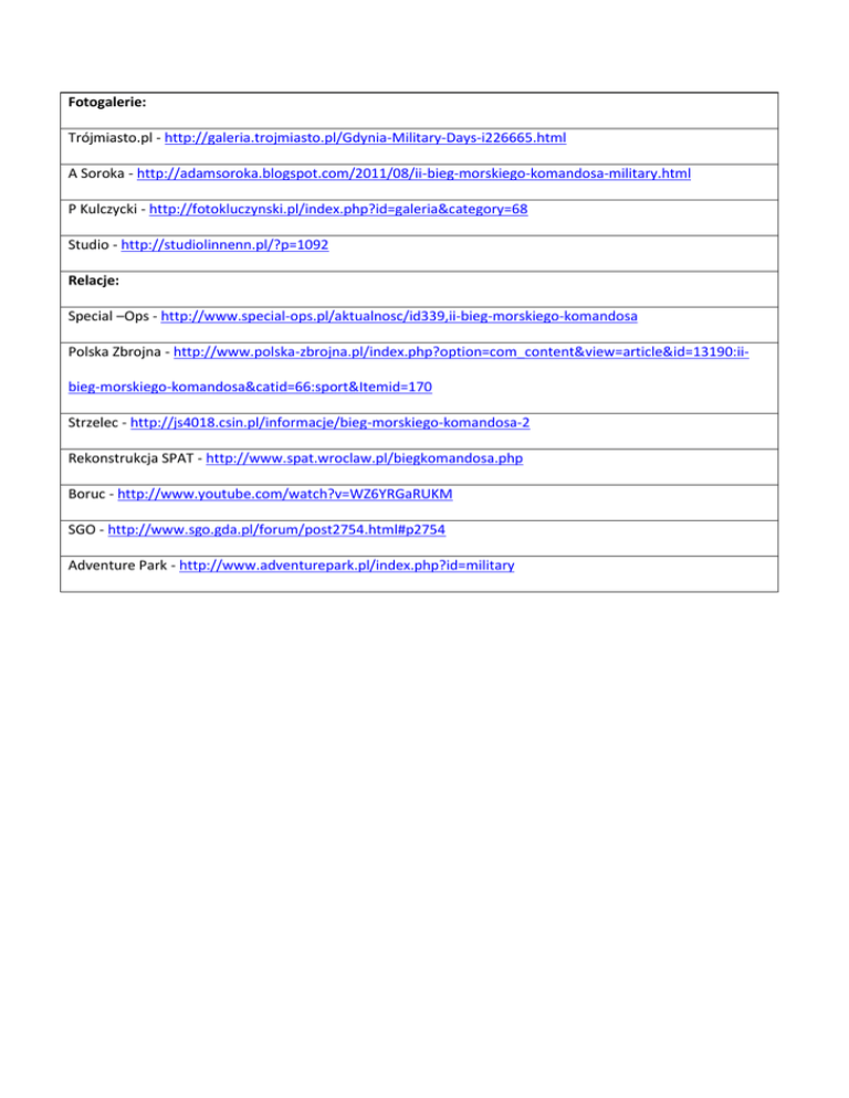 Fotogalerie: Trójmiasto.pl - http://galeria.trojmiasto.pl/Gdynia-Military-Days-i226665.html A Soroka - http://adamsoroka.blogspot.com/2011/08/ii-bieg-morskiego-komandosa-military.html P Kulczycki - http://fotokluczynski.pl/index.php?id=galeria&category=68 Studio - http://studiolinnenn.pl/?p=1092 Relacje: Special –Ops - http://www.special-ops.pl/aktualnosc/id339,ii-bieg-morskiego-komandosa Polska Zbrojna - http://www.polska-zbrojna.pl/index.php?option=com_content&view=article&id=13190:iibieg-morskiego-komandosa&catid=66:sport&Itemid=170 Strzelec - http://js4018.csin.pl/informacje/bieg-morskiego-komandosa-2 Rekonstrukcja SPAT - http://www.spat.wroclaw.pl/biegkomandosa.php Boruc - http://www.youtube.com/watch?v=WZ6YRGaRUKM SGO - http://www.sgo.gda.pl/forum/post2754.html#p2754 Adventure Park - http://www.adventurepark.pl/index.php?id=military