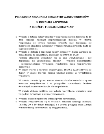 PROCEDURA SKŁADANIA I ROZPATRYWANIA WNIOSKÓW O DOTACJĘ I ZAPOMOGE Z BUDŻETU FUNDACJI „BRATNIAK” 1. Wnioski o dotacje należy składać w nieprzekraczanym terminie do 10 dnia każdego miesiąca poprzedzającego miesiąc, w którym rozpoczyna się termin realizacji projektu (nie dopuszcza się możliwości składania wniosków w trakcie trwania projektu bądź po jego zakończeniu). 2. Wnioski o dotację i zapomogi należy składać w Biurze Zarządu od poniedziałku do czwartku w godzinach od 10.00 do 14.00. Podczas składania wniosków nie są one weryfikowane i nie dopuszcza się uzupełniania braków – wnioski niekompletne i nieodpowiadające wymogom regulaminu będą rozpatrywane odmownie. 3. W każdy wtorek i czwartek między godz. 10.30 a 12.00 odbywa się dyżur, w czasie którego można uzyskać pomoc w wypełnianiu wniosków. W trakcie trwania dyżuru można również składać wnioski – są one wówczas weryfikowane i w przypadku stwierdzenia braków formalnych istnieje możliwość ich uzupełnienia. W trakcie dyżuru możliwa jest jedynie weryfikacja wniosków pod względem formalnym a nie merytorycznym. 4. Wnioski o zapomogi można składać przez cały miesiąc. 5. Wnioski rozpatrywane są w ostatniej dekadzie każdego miesiąca (między 20 a 30 dniem miesiąca) i o decyzji podjętej przez Zarząd wnioskodawcy informowani są drogą mailową.