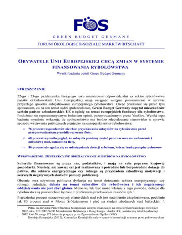 G R E E N B U D G E T G E R M A N Y FORUM ÖKOLOGISCH-SOZIALE MARKTWIRTSCHAFT O BYWATELE U NII E UROPEJSKIEJ CHCĄ ZMIAN W SYSTEMIE FINANSOWANIA RYBOŁÓWSTWA Wyniki badania opinii Green Budget Germany STRESZCZENIE 22-go i 23-go października bieżącego roku ministrowie odpowiedzialni za sektor rybołówstwa państw członkowskich Unii Europejskiej mają osiągnąć wstępne porozumienie w sprawie przyszłego sposobu subsydiowania europejskiego rybołówstwa. Chcąc przekonać się przed tym spotkaniem, co na ten temat sądzi społeczeństwo, Green Budget Germany zapytał mieszkańców sześciu państw członkowskich UE o opinię na temat europejskich funduszy dla rybołówstwa. Posłużono się reprezentatywnym badaniem opinii, przeprowadzonym przez YouGov. Wyniki tego badania wyraźnie wskazują, że społeczeństwo ma bardzo zdecydowane stanowisko w sprawie sposobu wydawania publicznych pieniędzy na europejski sektor rybołówstwa: • 76 procent respondentów nie chce przyznawania subsydiów na rybołówstwo przed przeprowadzeniem prawidłowej oceny floty. • 68 procent wyraziło pogląd, że subsydia powinny zostać przeznaczone na zachowanie i odbudowę stad, zamiast na flotę. • 80 procent nie zgadza się na udostępnianie dotacji rybakom, którzy łamią przepisy połowowe. WPROWADZENIE: DESTRUKCYJNE ODDZIAŁYWANIE SUBSYDIÓW NA RYBOŁÓWSTWO Subsydia finansowane są przez nas, podatników, i mają na celu poprawę krajowej gospodarki. Niestety, nie zawsze cel jest realizowany i pośrednie lub bezpośrednie dotacje do paliwa, dla sektora energetycznego czy rolnego są przykładem szkodliwej motywacji i szerszych negatywnych skutków pomocy publicznej. Obecnie trwa ożywiona publiczna dyskusja na temat dotowania sektora energetycznego czy rolnego, jednakże, debata na temat subsydiów dla rybołówstwa i ich negatywnego oddziaływania nie jest zbyt głośna. Mimo to, lub być może właśnie z tego powodu, dotacje dla rybołówstwa są powszechnie łączone z problemem przełowienia zasobów ryb 1. Pięćdziesiąt procent oszacowanych atlantyckich stad ryb jest nadmiernie eksploatowana, podobnie jak 80 procent stad w Morzu Śródziemnym i pięć na siedem zbadanych stad bałtyckich 2. 1 2 Patrz, na przykład Plan wdrażania postanowień szczytu światowego na temat zrównoważonego rozwoju z 2002 roku, 31f; 2005 WTO Ministerialna Deklaracja z Hong Kongu , Aneks D 9; i ostateczny tekst Konferencji 2012 Rio+20, ustęp 173 (obecnie przyjęty przez Zgromadzenie Ogólne ONZ). Komisja Europejska (2012), Komunikat Komisji dla rady w sprawie konsultacji na temat praw połowowych na G R E E N B U D G E T G E R M A N Y FORUM ÖKOLOGISCH-SOZIALE MARKTWIRTSCHAFT Powszechnie uznaje się, że dotowanie rybołówstwa przyczyniło się do przełowienia, w związku z pogłębianiem strukturalnych problemów wynikających z nadmiernych mocy połowowych 3. W celu zbadania poziomu wiedzy społeczeństwa na temat subsydiów dla rybołówstwa i ich skutków w obecnym okresie reformy wspólnej polityki rybołówstwa (WPRyb) oraz przyszłości Europejskiego Funduszu Morskiego i Rybackiego, organizacja Green Budget Europe przeprowadziła badania opinii publicznej w szeregu państw członkowskich UE. METODOLOGIA Od 14 do 20 września 2012 roku zadano cztery pytania na temat możliwych skutków dotowania rybołówstwa oraz o to, jak publiczne środki powinny być wydawane, grupie ponad 7 tys. osób 4 z sześciu państw UE: Niemiec, Francji, Wielkiej Brytanii, Polski, Włoch i Hiszpanii, Reprezentatywne badanie opinii publicznej zostało przeprowadzone przez instytut badania opinii publicznej YouGov i bazowało na jednopanelowym badaniu omnibusowym. Zebrane dane grupowane były według płci, wieku i regionu. PYTANIA I WYNIKI Pytanie 1 Respondenci mieli się zgodzić lub nie zgodzić z następującymi stwierdzeniami: • Unijna pomoc publiczna przyczynia się do przełowienia • Unijna pomoc publiczna gwarantuje stabilność ekonomiczną sektora rybołówstwa • Unijna pomoc publiczna sprawia, że ryby w supermarkecie są tańsze. Związki przyczynowo-skutkowe między dotowaniem rybołówstwa, a przełowieniem są doskonale udokumentowane. Rentowność wielu segmentów unijnej floty połowowej jest całkowicie uzależniona od publicznej pomocy.5 Jednakże respondenci z sześciu państw członkowskich uznali w 44%, że unijna pomoc publiczna 3 4 5 2013 rok, COM(2012) 278 final. Patrz na przykład dokument roboczy Komisji UE (2008): Refleksje na temat dalszej reformy wspólnej polityki rybołówstwa; Sumaila, R. & Pauly, D. (2006) Więcej przynęty: Dogłębne przeszacowanie globalnych subsydiów na rybołówstwo (druga wersja), Raport Centrum Badawczego Rybołówstwa 2006 Vol. 14 No. 6, University of British Columbia 1.000 we Francji, 1.002 we Włoszech, 1.003 w Hiszpanii, 1.001 w Polsce, 1.086 w Niemczech i 2.001 osób w Wielkiej Brytanii. Patrz, na przykład Poseidon (2010), FIFG 2000–2006 Shadow Evaluation, dostępna na http://www.pewtrusts.org/uploadedFiles/wwwpewtrustsorg/Reports/Protecting_ocean_life/FIFG-evaluation.pdf, lub Sumaila et. al. (2009), Subsydia dla floty łodzi trałowych i zrównoważenie głębokomorskich stad ryb dennych, dostępne na http://www.ecomarres.com/downloads/subsid3.pdf G R E E N B U D G E T G E R M A N Y FORUM ÖKOLOGISCH-SOZIALE MARKTWIRTSCHAFT dla rybaków przyczynia się do przełowienia, podczas gdy 36% nie zgodziło się z tym twierdzeniem. 56% respondentów zgodziło się, że pomoc publiczna gwarantuje stabilność ekonomiczną sektora rybołówstwa, a tylko 28% nie zgodziło się z takim twierdzeniem. I na koniec, jedynie 35% respondentów zgodziło się, że pomoc publiczna sprawia, że ryby w supermarkecie są tańsze, a 47% nie zgodziło się z tym poglądem.67. Odpowiedzi na pierwsze pytanie różniły się w zależności od państwa. Większość respondentów w Polsce i Hiszpanii nie zgodziła się z twierdzeniem, że „unijna pomoc publiczna dla rybak