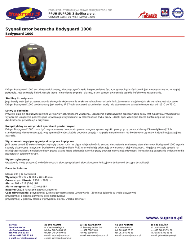 PRODUKCJA, DYSTRYBUCJA I SERWIS SPRZĘTU PPOŻ. I BHP PPUH SUPRON 3 Spółka z o.o. Certyfikat jakości wg PN-EN ISO 9001:2009 Sygnalizator bezruchu Bodyguard 1000 Bodyguard 1000 Dräger Bodyguard 1000 został wyprodukowany, aby przyczynić się do bezpieczeństwa życia, w sytuacji gdy użytkownik jest nieprzytomny lub w nagłej potrzebie. Jest on trwały i lekki, wysyła jasne i niezmienne sygnały i alarmy, a tym samym gwarantuje szybkie i efektywne rozpoznanie. Stabilny i trwały wzór Jego trwały wzór jest przeznaczony do stałego funkcjonowania w ekstremalnych warunkach funkcjonowania, obojętnie jak ekstremalne jest otoczenie. Dräger Bodyguard 1000 produkowany jest według IP 67 ochrony przed strumieniem wody i do stosowania w zakresie temperatur od -15°C do 75°C. Łatwy w obsłudze Przyciski dają się obsługiwać również w rękawicy ochronnej. Po włączeniu, urządzenie automatycznie przeprowadza pełny test funkcyjny. Przypadkowe wyłączenie urządzenia podczas jego używania jest wykluczone, w zależności od trybu pracy - dzięki opcji wsunięcia klucza kontrolnego lub dzięki dwukrotnemu przyciśnięciu przycisku. Kompatybilny ze wszystkimi aparatami powietrznymi Dräger Bodyguard 1000 może być przymocowany do aparatu powietrznego w sposób szybki i pewny, przy pomocy klamry \"krokodylkowej\" lub standardowej klamry mocującej. Przy tym możliwa jest każda dogodna pozycja - na pasie naramiennym lub biodrowym czy też w każdej innej pozycji na aparacie. Wyraźne ostrzegające sygnały akustyczne i optyczne Jeśli przez ponad 25 sekund nie jest wykryty żaden ruch i w ciągu kolejnych ośmiu sekund nie zostanie anulowany stan alarmowy, Bodyguard 1000 wysyła sygnały akustyczne i optyczne. Dodatkowo podwójne diody FASCIA umożliwiają orientację w warunkach złej widoczności. Migające w ciągły sposób na niskiej częstotliwości niebieskie diody, pozwalają na łatwą orientację członka grupy podczas normalnej aktywności i umożliwiają pozostanie widocznym dla pozostałych członków grupy. Wybór trybu pracy Urządzenie może pracować w dwóch trybach: albo z przyciskami albo z kluczem funkcyjnym do kontroli dostępu do aplikacji. Dane techniczne Masa: 230 g (z bateriami) Wymiary: W x Sz x D 100 x 70 x 40 mm Górna częstotliwość: 2900 (± 200) Hz Alarm: 102 – 112 (30s) dBA Alarm wstępny: 86 – 102 (6s) dBA Baterie: CR123 Panasonic Litowa (2 baterie) Czas użytkowania: przynajmniej 12 miesięcy normalnego użytkowania (30 minut dziennie w trybie aktywnym) przynajmniej 8 godzin alarmu (w pełni naładowany) przynajmniej 2 godziny alarmu w przypadku alarmu \"słaba bateria\") www.supron.pl Serwis: 26-600 RADOM ul. Czachowskiego 4 tel. 048 363 21 85 tel./fax 048 363 21 86 e-mail: [email protected] 26-600 RADOM ul. Czachowskiego 4 tel./fax 048 363 89 98 tel./fax 048 363 99 65 e-mail: [email protected] e-mail: [email protected] 03-481 WARSZAWA ul. Szanajcy 16 lok. 56 tel. 022 618 93 63 fax 022 619 80 05 e-mail: [email protected] 61-003 POZNAŃ ul. Chlebowa 4/8 tel. 061 842 23 00 fax 061 840 06 88 e-mail: [email protected] 80-530 GDAŃSK ul. Uczniowska 52 tel. 058 340 03 55, 56 tel./fax 058 342 91 75 e-mail: [email protected]