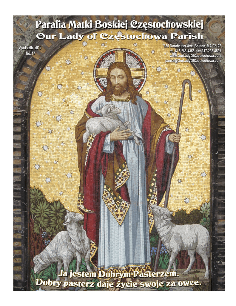 BIURO PARAFIALNE / PARISH OFFICE Tel: 617-268-4355; Fax: 617-268-4599 Monday - Friday - 8:00 am - 2:00 pm Saturday: 10:00 am - 12:00 pm Evenings and weekends - by appointment only. PORZĄDEK MSZY ŚWIĘTYCH MASS SCHEDULE Mon. - Wed. 7:00 am (English); 8:00 am (Polish) Thursday 7:00 am (English) 7:00 pm (Polish) Friday 7:00 am (English) 6:00 pm - 7:00 pm - Adoracja Najśw. Sakr. - Koronka Spowiedź - Adoration, Divine Mercy Chaplet, Confession 7:00 pm (Polish) Saturday 8:00 am (Polish) 4:00 pm (English) 7:00 pm (Polish) Sunday 8:00 am (Polish) 9:30 am (English) 11:00 am (Polish) Holydays - as announced SPOWIEDŹ / CONFESSIONS Friday 6:00 pm and every day 30 min. before Masses. CHRZEST / BAPTISM By arrangement with the priest. Instruction for parents and godparents is required. SAKRAMENT MAŁŻEŃSTWA / MARRIAGE Please, make arrangement with the parish office at least six months in advance. Instruction is required. SAKRAMENT CHORYCH/SACRAMENT OF THE SICK Parishioners who are seriously ill should call the office to arrange for a priest to visit and administer the Sacraments. ŻYCIE JEST DAREM OD BOGA Jeżeli odkryłaś, że pod Twym sercem poczęło się życie, przyjdź do nas sama lub z najbliższą osobą i podziel się tą wspaniałą nowiną. Będziemy Ci błogosławić, a jeśli trzeba - służyć pomocą. Nie lękaj się! - Ojcowie franciszkanie PASTORAL STAFF - FRANCISCAN FRIARS OJCOWIE FRANCISZKANIE (OFM Conv.) Fr. Jan Łempicki OFMConv. - pastor Fr. Józef Brzozowski OFMConv. - parochial vicar Fr. Józef Błaszak OFMConv. - hospital chaplain Fr. Aloysius Minyong Hong OFMConv. - in residence KATECHECI / CATECHISTS Diakon Paweł Sawiak - bierzmowanie; Urszula Boryczka - kl. 0 Elżbieta Sokołowska - kl. 0; Danuta Surowiec-Ramos - kl. 2; Zofia Fiedorczyk - kl. 3; Monika Danek - kl. 4; Anna Maziarz - kl. 5; Piotr Goszczynski - kl. 6; Danuta Daniels - kl. 6; Eugeniusz Bramowski - kl. 7; Alicja Szewczyk - zastępstwa; Beata Kozak - zastępstwa; Małgorzata Sokołowski - zastępstwa; Iwona Gajczak - koordynatorka PRACOWNICY PARAFII / OFFICE STAFF Secretary & Religious Education Coordinator - Mrs. Iwona Gajczak Bookkeeper & Office Assistant - Ms. Connie Bielawski RADA PARAFIALNA / PARISH COUNCIL Mr. Szymon Biegański, Mr. Grzegorz Boryczka, Mr. Eugeniusz Bramowski, Mr. Czesław Kilian, Mr. Jan Kozak, Ms. Maryann Sadowski, Mr. Zbigniew Saletnik, Ms. Danuta Urbaniak, Mrs. Lucy Willis, Mrs. Władzia Wygonowska RADA FINANSOWA / FINANCE COUNCIL Ms. Constance Bielawski, Mr. Grzegorz Boryczka, Mr. Maks Gradziuk, Mr. Rafał Jabłonka, Mr. Richard Rolak, Mr. Wiesław Wierzbowski SŁUŻBA MUZYCZNA / MUSIC MINISTRY Organist & Psalmist: Mrs. Marta Saletnik ZAKRYSTIA/SACRISTAN – KWIATY/FLOWERS Mrs. Beata Kozak & Mrs. Renata Marshall Misją Parafii Matki Bożej Częstochowskiej jest dawanie świadectwa wiary rzymsko-katolickiej i polskiego dziedzictwa. Ofiarnie i nieustannie służymy Bogu i sobie nawzajem zachowując i dzieląc się naszymi polskimi tradycjami w otwarciu się na wszystkich ludzi. Parafię obsługują Ojcowie Franciszkanie. The mission of the Parish of Our Lady of Czestochowa is to bear witness to our Roman Catholic faith and our Polish heritage. We strive to continue to serve God and each other, celebrating and sharing our Polish traditions, welcoming and reaching out to all people. The parish is served by Conventual Franciscan Friars. LIFE IS A GIFT FROM GOD If you discovered that a new life began under your heart, come to us alone or with someone you love, and share this wonderful news. We will bless you, and - if necessary - offer you help. Do not be afraid! - Franciscan Fathers ACTIVITIES & ORGANIZATIONS ♦ Sala św. Jana Pawła II — St. John Paul II Hall Kontakt w sprawie wynajmu sali: tel: 617-268-4355 W sprawie sprzętu audio-wizualnego tel. 617-922-3691 Contact for renting the hall: tel: 617-268-4355 For audio-visual equipment tel. 617-922-3691 (Mariusz) ♦ Ministranci / Altar Servers - Eugeniusz Bramowski Spotkania w pierwsze niedziele miesiąca w sali świętego Jana Pawła II o godz. 10:00 am (781-871-2991) ♦ Fundacja Kultury Polskiej - Polish Cultural Foundation, Inc. - Mr. Andrzej Pronczuk - tel. 617-859-9910 ♦ Polska Szkoła Sobotnia - Polish Saturday School - Mr. Jan Kozak - tel. 617-464-2485 ♦ Chór Parafialny i Chórek Dziecięcy Promyki św. Jana Pawła II - Parish Choir & Children Choir - Mrs. Marta Saletnik, tel. kom. 857-212-7962 ♦ Stowarzyszenie Weteranów Armii Polskiej - SWAP #37 Mr. Wincenty Wiktorowski - tel. 617-288-1649 Grupa AA - Stanisław, tel. 508 283 4262 Sala pod kościołem. 2 Spotkania odbywają się w każdy czwartek o godz. 7:00 pm ♦ Krakowiak - Wednesdays at 7:30 pm - St. John Paul II hall www.krakowiak.org,: Eric Pierce: Tel. 508-320-2344 ♦ Żywy Różaniec / Rosary Society - Mrs. Genowefa Lisek tel. 617-436-5779 ♦ Siostry Matki Bożej Miłosierdzia Sisters of Our Lady of Mercy: tel. 617-288-1202 ♦ Polski Amatorski Teatr w Bostonie / Polish Theater - Mrs. Małgorzata Tutko: tel. 617-325-2208 ♦ Harcerze / Polish Scouts - The meetings will be conducted in Polish for young boys and girls. Contact information: Mateusz Wozny, tel. 347-749-5867, email: [email protected] ♦ Klub Polski Polish American Citizens Club - Mr. Christopher Lisek Club: 617-436-2786; Cell: 617-436-2686 The Shepherd's Voice In today's Gospel, Jesus says that He is the good shepherd the prophets had promised to Israel. He is the shepherd-prince, the new David who frees people from bondage to sin and gathers them into one flock, the Church, under a new covenant made in His blood (see Ezekiel 34:10-13, 23-31). His flock includes other sheep, He says, far more than the dispersed children of Israel (see Isaiah 56:8; John 11:52). And He gave His Church the mission of shepherding all peoples to the Father. In today's First Reading, we see the beginnings of that mission in the testimony of Peter, whom the Lord appointed shepherd of His Church (see John 21:15-17)