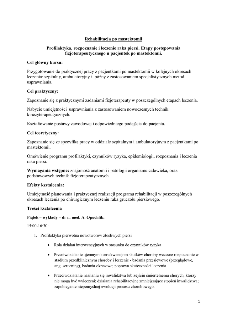 Rehabilitacja po mastektomii Profilaktyka, rozpoznanie i leczenie raka piersi. Etapy postępowania fizjoterapeutycznego u pacjentek po mastektomii. Cel główny kursu: Przygotowanie do praktycznej pracy z pacjentkami po mastektomii w kolejnych okresach leczenia: szpitalny, ambulatoryjny i późny z zastosowaniem specjalistycznych metod usprawniania. Cel praktyczny: Zapoznanie się z praktycznymi zadaniami fizjoterapeuty w poszczególnych etapach leczenia. Nabycie umiejętności usprawniania z zastosowaniem nowoczesnych technik kinezyterapeutycznych. Kształtowanie postawy zawodowej i odpowiedniego podejścia do pacjenta. Cel teoretyczny: Zapoznanie się ze specyfiką pracy w oddziale szpitalnym i ambulatoryjnym z pacjentkami po mastektomii. Omówienie programu profilaktyki, czynników ryzyka, epidemiologii, rozpoznania i leczenia raka piersi. Wymagania wstępne: znajomość anatomii i patologii organizmu człowieka, oraz podstawowych technik fizjoterapeutycznych. Efekty kształcenia: Umiejętność planowania i praktycznej realizacji programu rehabilitacji w poszczególnych okresach leczenia po chirurgicznym leczeniu raka gruczołu piersiowego. Treści kształcenia Piątek – wykłady – dr n. med. A. Opuchlik: 15:00-16:30: 1. Profilaktyka pierwotna nowotworów złośliwych piersi Rola działań interwencyjnych w stosunku do czynników ryzyka Przeciwdziałanie ujemnym konsekwencjom skutków choroby wczesne rozpoznanie w stadium przedklinicznym choroby i leczenie - badania przesiewowe (przeglądowe, ang. screening), badania okresowe; poprawa skuteczności leczenia Przeciwdziałanie nasilaniu się inwalidztwa lub zejściu śmiertelnemu chorych, którzy nie mogą być wyleczeni; działania rehabilitacyjne zmniejszające stopień inwalidztwa; zapobieganie niepomyślnej ewolucji procesu chorobowego. 1 16:30-16:45 przerwa 16:45-17:30: 2. Epidemiologia, etiologia i czynniki ryzyka raka piersi Dane epidemiologiczne z Polski i świata Czynniki ryzyka zachorowań: płeć, geograficzne, genetyczne, wiek, styl życia i inne 3. Objawy kliniczne i patomorfologia Podział kliniczny i histopatologiczny raka piersi Łagodne i złośliwe zmiany gruczołu piersiowego 17:30-17:45 przerwa 17:45-21:15: 4. Rozpoznanie raka sutka Badanie podmiotowe i przedmiotowe Badanie przesiewowe Badania obrazowe (mammografia, ultrasonografia i inne) Badania mikroskopowe (biopsja aspiracyjna) 5. Kompleksowe postępowanie w przypadku obrzęku limfatycznego kończyny górnej po stronie operowanej Definicja obrzęku limfatycznego, rozpoznanie, postacie niewydolności układu limfatycznego i podział obrzęków chłonnych Metodyka Kompleksowej Fizycznej Terapii Udrażniającej oraz innych zabiegów fizjoterapeutycznych wspomagających terapię Sobota – wykłady – dr n. med. A. Włoch: 9:00-12:00: 1. Zapoznanie się metodami leczenia chirurgicznego i rodzajami zabiegów odtwórczych piersi ● operacje oszczędzające ● operacje radykalne ● zabiegi paliatywne ● techniki zabiegów odtwórczych 2. Leczenie miejscowe i systemowe po zabiegu chirurgicznym 2 ● radioterapia ● chemioterapia ● hormonoterapia 12:00-12:30 przerwa 12:30-14:45: 3. Szczegółowe omówienie programu rehabilitacji obejmującego fizjoterapię w następujących okresach leczenia ● szpitalny (przed i pooperacyjny) ● ambulatoryjny 14:45-15:00 przerwa 15:00-17:15: ● późny (zajęcia ogólno usprawniające w klubie Amazonek) Niedziela – ćwiczenia – dr n. med. A.Włoch: 9:00-10:30 4. Zapoznanie się z praktycznymi zadaniami fizjoterapii w poszczególnych okresach leczenia pacjentek po mastektomii 10:30-10:45 przerwa 10:45-13:00 5. Przedstawienie modelu postępowania fizjoterapeutycznego w zastosowaniu specjalistycznych metod usprawniania. ● PIR mobilizacje i masaż blizny ● elementy metody PNF 13:00-13:30 przerwa 13:30-17:15: ● elementy aplikacji metody KINESIOLOGY TAPING ● elementy terapii manualnej i metody uwalniania mięśniowo-powięziowego 6.Ocena umiejętności praktycznych uczestników – zakończenie kursu. 3