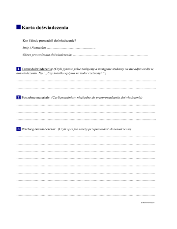 Karta doświadczenia 1 Kto i kiedy prowadził doświadczenie? 2 Imię i Nazwisko: ……………………………..…….. 3 Okres prowadzenia doświadczenia: ……………………………………………………….. 4 1 Temat doświadczenia: (Czyli pytanie jakie zadajemy a następnie szukamy na nie odpowiedzi w doświadczeniu. Np.: „Czy światło wpływa na kolor rzeżuchy?” ) ………………………………………………………………………………………………….……… ……………………………………………………………………………………………….………… 2 Potrzebne materiały: (Czyli przedmioty niezbędne do przeprowadzenia doświadczenia) ………………………………………………………………………………………………………… ………………………………………………………………………………………………………… ………………………………………………………………………………………………….……… 3 Przebieg doświadczenia: (Czyli opis jak należy przeprowadzić doświadczenie) ………………………………………………………………………………………………………… ………………………………………………………………………………………………………… ………………………………………………………………………………………………………… ………………………………………………………………………………………………………… ………………………………………………………………………………………………………… ………………………………………………………………………………………………………… ………………………………………………………………………………………………………… ………………………………………………………………………………………………………… ………………………………………………………………………………………………………… © Barbara Kozyra 4 Obserwacje: (Codziennie obserwuj i zapisuj co się dzieje) …………………………………………………………………………………………….…………… …………………………………………………………………………………………….…………… ……………………………………………………………………………………………….………… ……………………………………………………………………………………………….………… ……………………………………………………………………………………………….………… ……………………………………………………………………………………………….………… ……………………………………………………………………………………………….………… …………………………………………………………………………………………………………. 5 Wynik doświadczenia: (Napisz jaki jest ostateczny wynik doświadczenia) ………………………………………………………………………………………………………… ………………………………………………………………………………………………………… ………………………………………………………………………………………………………… ………………………………………………………………………………………………………… ………………………………………………………………………………………………………… 7 Wnioski: (Sformułuj wnioski z doświadczenia) ………………………………………………………………………………………………………… ………………………………………………………………………………………………………… ………………………………………………………………………………………………………… ………………………………………………………………………………………………………… ………………………………………………………………………………………………………… …………………………………………………………………………………………………………. ………………………………………………………………………………………………………… © Barbara Kozyra