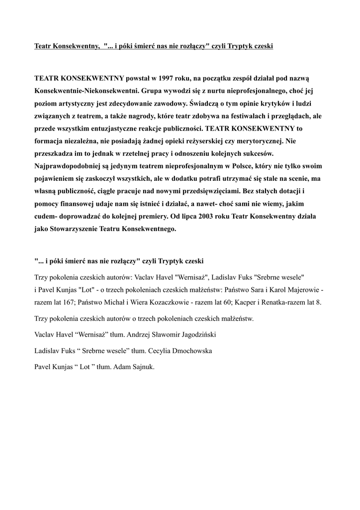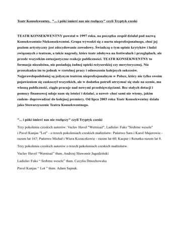 Teatr Konsekwentny, "... i póki śmierć nas nie rozłączy" czyli Tryptyk czeski TEATR KONSEKWENTNY powstał w 1997 roku, na początku zespół działał pod nazwą Konsekwentnie-Niekonsekwentni. Grupa wywodzi się z nurtu nieprofesjonalnego, choć jej poziom artystyczny jest zdecydowanie zawodowy. Świadczą o tym opinie krytyków i ludzi związanych z teatrem, a takŜe nagrody, które teatr zdobywa na festiwalach i przeglądach, ale przede wszystkim entuzjastyczne reakcje publiczności. TEATR KONSEKWENTNY to formacja niezaleŜna, nie posiadają Ŝadnej opieki reŜyserskiej czy merytorycznej. Nie przeszkadza im to jednak w rzetelnej pracy i odnoszeniu kolejnych sukcesów. Najprawdopodobniej są jedynym teatrem nieprofesjonalnym w Polsce, który nie tylko swoim pojawieniem się zaskoczył wszystkich, ale w dodatku potrafi utrzymać się stale na scenie, ma własną publiczność, ciągle pracuje nad nowymi przedsięwzięciami. Bez stałych dotacji i pomocy finansowej udaje nam się istnieć i działać, a nawet- choć sami nie wiemy, jakim cudem- doprowadzać do kolejnej premiery. Od lipca 2003 roku Teatr Konsekwentny działa jako Stowarzyszenie Teatru Konsekwentnego. "... i póki śmierć nas nie rozłączy" czyli Tryptyk czeski Trzy pokolenia czeskich autorów: Vaclav Havel "WernisaŜ", Ladislav Fuks "Srebrne wesele" i Pavel Kunjas "Lot" - o trzech pokoleniach czeskich małŜeństw: Państwo Sara i Karol Majerowie razem lat 167; Państwo Michał i Wiera Kozaczkowie - razem lat 60; Kacper i Renatka-razem lat 8. Trzy pokolenia czeskich autorów o trzech pokoleniach czeskich małŜeństw. Vaclav Havel “WernisaŜ” tłum. Andrzej Sławomir Jagodziński Ladislav Fuks “ Srebrne wesele” tłum. Cecylia Dmochowska Pavel Kunjas “ Lot ” tłum. Adam Sajnuk.