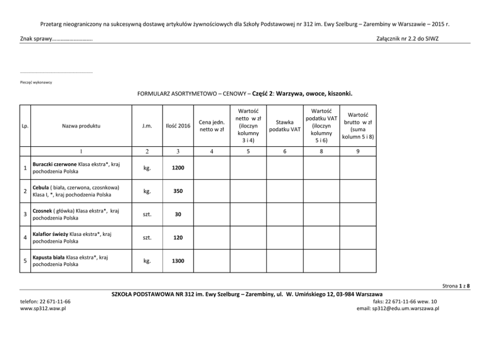 Przetarg nieograniczony na sukcesywną dostawę artykułów żywnościowych dla Szkoły Podstawowej nr 312 im. Ewy Szelburg – Zarembiny w Warszawie – 2015 r. Znak sprawy………………………. Załącznik nr 2.2 do SIWZ ........................................................................ Pieczęć wykonawcy FORMULARZ ASORTYMETOWO – CENOWY – Część 2: Warzywa, owoce, kiszonki. Lp. Nazwa produktu J.m. Ilość 2016 Cena jedn. netto w zł Wartość netto w zł (iloczyn kolumny 3 i 4) 1 2 3 4 5 1 Buraczki czerwone Klasa ekstra*, kraj pochodzenia Polska kg. 1200 2 Cebula ( biała, czerwona, czosnkowa) Klasa I, *, kraj pochodzenia Polska kg. 350 3 Czosnek ( główka) Klasa ekstra*, kraj pochodzenia Polska szt. 30 4 Kalafior świeży Klasa ekstra*, kraj pochodzenia Polska szt. 120 5 Kapusta biała Klasa ekstra*, kraj pochodzenia Polska kg. 1300 Wartość Wartość podatku VAT Stawka brutto w zł (iloczyn podatku VAT (suma kolumny kolumn 5 i 8) 5 i 6) 6 8 9 Strona 1 z 8 SZKOŁA PODSTAWOWA NR 312 im. Ewy Szelburg – Zarembiny, ul. W. Umińskiego 12, 03-984 Warszawa telefon: 22 671-11-66 www.sp312.waw.pl faks: 22 671-11-66 wew. 10 email: [email protected] Przetarg nieograniczony na sukcesywną dostawę artykułów żywnościowych dla Szkoły Podstawowej nr 312 im. Ewy Szelburg – Zarembiny w Warszawie – 2015 r. Znak sprawy………………………. Lp. Załącznik nr 2.2 do SIWZ Nazwa produktu J.m. Ilość 2016 Cena jedn. netto w zł Wartość netto w zł (iloczyn kolumny 3 i 4) 1 2 3 4 5 6 Kapusta czerwona Klasa ekstra*, kraj pochodzenia Polska kg. 350 7 Kapusta pekińska Klasa ekstra*, kraj pochodzenia Polska kg. 600 8 Kapusta włoska Klasa ekstra*, kraj pochodzenia Polska kg 200 9 Koperek - pęczek Klasa ekstra*, kraj pochodzenia Polska szt. 710 10 Marchew Klasa ekstra*, kraj pochodzenia Polska kg. 3500 11 Natka pietruszki-pęczek Klasa ekstra*, kraj pochodzenia Polska szt. 620 12 Ogórek świeży Klasa ekstra*, kraj pochodzenia Polska kg. 1050 Wartość Wartość podatku VAT Stawka brutto w zł (iloczyn podatku VAT (suma kolumny kolumn 5 i 8) 5 i 6) 6 8 9 Strona 2 z 8 SZKOŁA PODSTAWOWA NR 312 im. Ewy Szelburg – Zarembiny, ul. W. Umińskiego 12, 03-984 Warszawa telefon: 22 671-11-66 www.sp312.waw.pl faks: 22 671-11-66 wew. 10 email: [email protected] Przetarg nieograniczony na sukcesywną dostawę artykułów żywnościowych dla Szkoły Podstawowej nr 312 im. Ewy Szelburg – Zarembiny w Warszawie – 2015 r. Znak sprawy………………………. Załącznik nr 2.2 do SIWZ Nazwa produktu J.m. Ilość 2016 Cena jedn. netto w zł Wartość netto w zł (iloczyn kolumny 3 i 4) 1 2 3 4 5 Papryka świeża –żółta, czerwona, biała, 13 zielona Klasa ekstra*, kraj pochodzenia Polska kg. 160 14 Pieczarki Klasa ekstra*, kraj pochodzenia Polska kg. 420 15 Pietruszka korzeń Klasa ekstra*, kraj pochodzenia Polska kg. 1500 16 Pomidory ( żółty, czerwony) Klasa ekstra*, kraj pochodzenia Polska kg. 800 17 Pomidory koktajlowe ( cherry) 500g Klasa ekstra*, kraj pochodzenia Polska szt. 250 18 Por Klasa ekstra*, kraj pochodzenia Polska kg. 870 19 Rzodkiewki- pęczki Klasa ekstra*, kraj pochodzenia Polska szt. 250 20 Sałata lodowa-główka Klasa ekstra*, kraj pochodzenia Polska szt. 1200 Lp. Wartość Wartość podatku VAT Stawka brutto w zł (iloczyn podatku VAT (suma kolumny kolumn 5 i 8) 5 i 6) 6 8 9 Strona 3 z 8 SZKOŁA PODSTAWOWA NR 312 im. Ewy Szelburg – Zarembiny, ul. W. Umińskiego 12, 03-984 Warszawa telefon: 22 671-11-66 www.sp312.waw.pl faks: 22 671-11-66 wew. 10 email: [email protected] Przetarg nieograniczony na sukcesywną dostawę artykułów żywnościowych dla Szkoły Podstawowej nr 312 im. Ewy Szelburg – Zarembiny w Warszawie – 2015 r. Znak sprawy………………………. Lp. Załącznik nr 2.2 do SIWZ Nazwa produktu J.m. Ilość 2016 Cena jedn. netto w zł Wartość netto w zł (iloczyn kolumny 3 i 4) 1 2 3 4 5 21 Sałata mix fantazja 180g Klasa ekstra*, kraj pochodzenia Polska szt. 400 22 Sałata zielona-główka Klasa ekstra*, kraj pochodzenia Polska szt. 1200 23 Seler Klasa ekstra*, kraj pochodzenia Polska kg. 1000 24 Szczypiorek gruby pęczek Klasa ekstra*, kraj pochodzenia Polska szt. 520 25 Kiełki różnego rodzaju Klasa ekstra*, kraj pochodzenia Polska szt 150 26 Rucola Klasa ekstra*, kraj pochodzenia Polska szt 210 27 Szpinak świeży Klasa ekstra*, kraj pochodzenia Polska kg 20 Wartość Wartość podatku VAT Stawka brutto w zł (iloczyn podatku VAT (suma kolumny kolumn 5 i 8) 5 i 6) 6 8 9 Strona 4 z 8 SZKOŁA PODSTAWOWA NR 312 im. Ewy Szelburg – Zarembiny, ul. W. Umińskiego 12, 03-984 Warszawa telefon: 22 671-11-66 www.sp312.waw.pl faks: 22 671-11-66 wew. 10 email: [email protected] Przetarg nieograniczony na sukcesywną dostawę artykułów żywnościowych dla Szkoły Podstawowej nr 312 im. Ewy Szelburg – Zarembiny w Warszawie – 2015 r. Znak sprawy………………………. Lp. Załącznik nr 2.2 do SIWZ Nazwa produktu J.m. Ilość 2016 Cena jedn. netto w zł Wartość netto w zł (iloczyn kolumny 3 i 4) 1 2 3 4 5 kg 80 szt 60 28 Cukinia średniej wielkości, ok 20 cm Wartość Wartość podatku VAT Stawka brutto w zł (iloczyn podatku VAT (suma kolumny kolumn 5 i 8) 5 i 6) 6 8 9 Świeże zioła ( bazylia, oregano, mięta , 29 tymianek, lubczyk), Klasa ekstra*, kraj pochodzenia Polska 30 Ziemniaki Irga – sortowane, Klasa ekstra*, kraj pochodzenia Polska kg. 27000 31 Ziemniaki młode Irga sortowane - Klasa ekstra*, kraj pochodzenia Polska kg. 4000 kg. 1500 kg 160 kg. 250 Ziemniaki obierane pakowane 32 próżniowo – 5 kg Klasa ekstra*, kraj pochodzenia Polska, Irga 33 Biała rzodkiew Klasa ekstra*,kraj pochodzenia Polska 34 Arbuz Klasa ekstra* Strona 5 z 8 SZKOŁA PODSTAWOWA NR 312 im. Ewy Szelburg – Zarembiny, ul. W. Umińskiego 12, 03-984 Warszawa telefon: 22 671-11-66 www.sp312.waw.pl faks: 22 671-11-66 wew. 10 email: [email protected] Przetarg nieograniczony na sukcesywną dostawę artykułów żywnościowych dla Szkoły P
