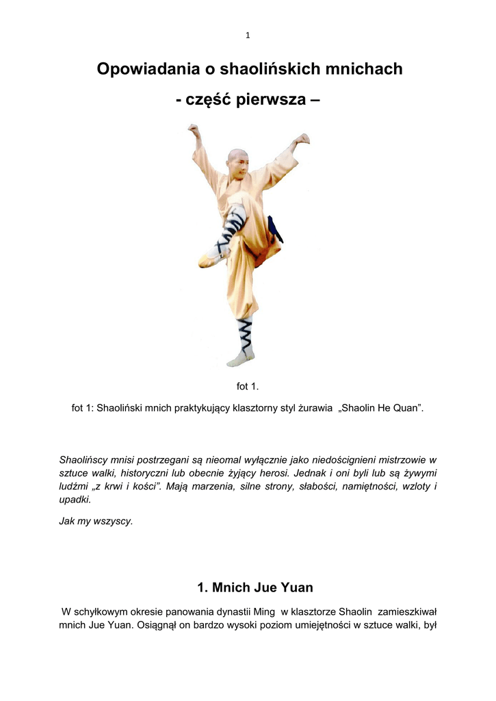1 Opowiadania o shaolińskich mnichach - część pierwsza – fot 1. fot 1: Shaoliński mnich praktykujący klasztorny styl żurawia „Shaolin He Quan”. Shaolińscy mnisi postrzegani są nieomal wyłącznie jako niedoścignieni mistrzowie w sztuce walki, historyczni lub obecnie żyjący herosi. Jednak i oni byli lub są żywymi ludźmi „z krwi i kości”. Mają marzenia, silne strony, słabości, namiętności, wzloty i upadki. Jak my wszyscy. 1. Mnich Jue Yuan W schyłkowym okresie panowania dynastii Ming w klasztorze Shaolin zamieszkiwał mnich Jue Yuan. Osiągnął on bardzo wysoki poziom umiejętności w sztuce walki, był 2 szczery i bezpośredni w mowie oraz uczynkach. Posiadał bystry i „otwarty” umysł. Nieustannie odczuwał potrzebę samodoskonalenia się, postępował więc zgodnie ze słowami starego porzekadła: „Poza niebem które dostrzegamy, istnieją także inne niebiosa”. Pragnąc pogłębić swoją wiedzę oraz powiększyć umiejętności z zakresu sztuki walki, w dziewiątym roku okresu panowania Tian Qi ( tj. w latach od 1621 do 1628 n.e.) udał się on do przeora klasztoru Shaolin prosząc o wyrażenie zgody na opuszczenie świątyni i udanie się w pielgrzymkę po Chinach w celu odnalezienia wysoko wykwalifikowanego mistrza sztuki walki. Przeor wyraził zgodę. Nie chcąc być rozpoznanym w swej podróży jako buddyjski mnich, przed opuszczeniem klasztoru Jue Yuan przebrał się w ubiór prostego wiejskiego chłopa. Poszukując mistrza sztuki walki przemierzył prowincje: Guizhou, Yunan i Syczuan, docierając ostatecznie do miasta Lanzhou w prowincji Gansu. Gdy o brzasku spacerował po mieście, dotarł do targowiska mieszczącego się przy skrzyżowaniu dwóch wąskich, nędznych uliczek. Pomimo, że był dopiero wczesny świt, i światło dnia zaczynało nieśmiało rozpraszać nocne ciemności, targowisko tętniło już życiem. Wielu ludzi kupowało na nim warzywa i owoce, jako produkty do przygotowania posiłków w nadchodzącym dniu. Gdy Jue Yuan zatrzymał się ogarniając wzrokiem targowisko, jego uwagę przykuł widok starego człowieka przechodzącego dziarsko długimi i zdecydowanymi krokami przez tłum interesantów. Miał długie, prawie białe włosy, związane z tyłu głowy w mały, zgrabny kok, i choć Jue Yuan ocenił jego wiek na około sześćdziesiąt lat, twarz staruszka wyglądała młodo, wciąż była pełna kolorów, promieniując zdrowiem i witalnością. Idąc, trzymał on w lewej ręce dużą butlę oleju, a w prawej podobnych rozmiarów butlę wypełnioną sosem sojowym. Gdy miał już skręcić w mniejszą, z dwóch uliczek łączących się na skrzyżowaniu, niespodziewanie od północnej strony miasta wpadł na skrzyżowanie konny oddział żołnierzy, którzy na galopujących wierzchowcach próbowali przejechać przez tłum robiących zakupy ludzi. Kupujący widząc rozpędzonych jeźdźców, rozpierzchli się w panice na boki, starając się uniknąć stratowania. Obserwowany przez Jue Yuana staruszek również pospiesznie i zwinnie uskoczył przed galopującymi końmi, jednak gwałtowny ruch jego ciała spowodował, iż olej oraz sos z trzymanych przez niego butli chlusnął na stojącego obok niego mężczyznę, plamiąc jego długą szatę. Rozwścieczony, oblany sosem sojowym i oliwą człowiek, klnąc i plując z wściekłości zamachnął się ręką i zadał cios otwartą dłonią, wymierzając go w twarz starca. Ten jednak z zadziwiającą łatwością uniknął ciosu, jak również dwóch następnych, zadanych w jednej serii. Starzec wyciągnął prawą rękę w kierunku wzburzonego kupca, kładąc jednocześnie lewą dłoń na własnej piersi, i wielokrotnie kłaniając się, pokornie przepraszał rozsierdzonego człowieka, błagając o wybaczenie. Słowa oraz uniżona postawa starca przyniosły niestety odwrotny od zamierzonego skutek: Ubrudzony oliwą oraz sosem człowiek tylko jeszcze bardziej się rozwścieczył. W emocjonalnym szale wykonał kopnięcie w kierunku staruszka, ten jednak i tym razem zwinnie uniknął ataku, wołając w rozpaczy: 3 „Szlachetny panie! Wiem, że poplamiłem ci ubranie. Uczyniłem to niechcący, bardzo przepraszam. Skrzyczałeś mnie i prawie uderzyłeś, więc proszę, nie karz mnie już więcej. Okaż wspaniałomyślnie litość staremu człowiekowi. Wybacz mi proszę, wybacz!” Wypowiadając te słowa starzec stał w narożniku skrzyżowania, tuż przy ścianie starego budynku. Cały czas kłaniał się ciałem zgiętym w łuk, z wyciągniętymi przed siebie rękami, złączywszy dłonie w błagalnym geście. Ubrudzony człowiek sprawiał jednak wrażenie, jakby w ogóle nie usłyszał jego słów. Jeszcze bardziej rozwścieczony rzucił się na niego, chwycił i przycisnął do ściany. Widząc wzbierający tłum gapiów, którego członkowie mruczeli z oburzeniem i dezaprobatą na widok silnego mężczyzny atakującego staruszka, zazgrzytał zębami i w furii ponownie wykonał w jego kierunku kopnięcie, zadawszy je za całej siły. Jednakże, w związku z tym, że wykonał je w stanie silnego wzburzenia, a przez to bez opanowania, uczynił to zbyt mocno. Starzec uniknął go zwinnie odskakując, natomiast kopiący trafił stopą w ścianę domu z taką siłą, że chmura pyłu opadła mu na głowę. Obawiając się, że wyszedł na głupca, rozłościł się jeszcze bardziej. Nie panując nad sobą, ponownie zaatakował starca z furią za pomocą kopnięć. Ten zwinnie uniknął kolejnych trzech kopnięć, jednak, gdy furiat wykonał w jego kierunku kopnięcie po raz czwarty, starzec zmienił taktykę obrony; wysunął prawą rękę i dotknął dwoma palcami dłoni punkt usytuowany na podeszwie stopy napastnika. Mężczyzna wykonujący kopnięcie padł natychmiast na ziemię „jak rażony gromem”. Leżąc, wił się z bólu, jego usta stały się sine, a kredowo biała twarz wyrażała psychiczny szok. Oszołomiony widokiem tłum zamarł i zamilkł, gdyż wszyscy 