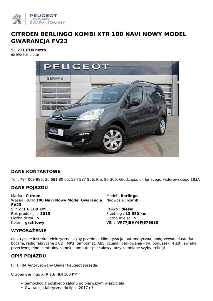 CITROEN BERLINGO KOMBI XTR 100 NAVI NOWY MODEL GWARANCJA FV23 51 211 PLN netto 62 990 PLN brutto DANE KONTAKTOWE Tel.: 784 069 986, 56 681 80 05, 534 537 856, Ria, 86-300, Grudziądz, ul. Ignacego Paderewskiego 183A DANE POJAZDU Marka : Citroen Wersja : XTR 100 Navi Nowy Model Gwarancja FV23 Silnik :1.6 100 KM Rok produkcji : 2015 Liczba drzwi : 5 Kolor : grafitowy Model : Berlingo Nadwozie : kombi Paliwo : diesel Przebieg : 13 580 km Liczba miejsc : 5 VIN : VF77JBHY6FJ676630 WYPOSAŻENIE elektryczne lusterka, elektryczne szyby przednie, klimatyzacja: automatyczna, podgrzewane lusterka boczne, radio fabryczne z CD i MP3, tempomat, ABS, czujniki parkowania - tył, poduszek: 4 szt., światła przeciwmgielne, centralny zamek, komputer pokładowy, przyciemniane szyby, relingi OPIS POJAZDU F. H. RIA Autoryzowany Dealer Peugeot sprzeda: Citroen Berlingo XTR 1.6 HDI 100 KM Samochód z polskiego salonu po pierwszym właścicielu Gwarancja fabryczna do lipca 2017 r.! Bogate wyposażenie z kamerą cofania Miejsce eksponowania pojazdu: RiA Autoryzowany Dealer Peugeot Grudziądz Paderewskiego 183a 86-300 Grudziądz pn-pt 9:00 - 17:00 so 9:00 - 15:30 Grzegorz: 784 069 986 Michał: 534 537 856 Pojazd oferowany w programie PEUGEOT UŻYWANY GWARANTOWANY - PREMIUM Certyfikat jakości DEKRA Pakiet Assistance 24/7 (Na terenie całej UE) Samochód zastępczy na czas ewentualnej naprawy Oferta ubezpieczeniowa na warunkach dealerskich Dlaczego warto nam zaufać? Jesteśmy Autoryzowanym Dealerem PEUGEOT, liderem sprzedaży aut w programie PEUGEOT UŻYWANY GWARANTOWANY Drobiazgowo sprawdziliśmy stan techniczny i prawny samochodu Każde auto ma gwarantowany przebieg Zawsze wystawiamy faktury na pełną wartość pojazdu Możliwość wykonania jazdy próbnej przez zakupem oraz wgłądu w dokumentację pojazdu Każdy samochód posiada ważną polisę OC oraz aktualne badania techniczne Auta zostały przygotowane do rejestracji Jeśli pojazd nie posiada gwarancji fabrycznej - udzielamy nawet 36 miesięcznej GWARANCJI Możliwość pozostawienia auta w rozliczeniu - wycena na miejscu Kupując używany samochód masz prawo być wymagający! Sprawdż naszą ofertę Peugeot Używany Gwarantowany: - Oferujemy pełną paletę dodatkowych produktów: LE.ASING w ofercie większość firm lea.singowych od 1 procent wpłaty wstępnej bez zbędnych formalności do 84 miesięcy formalności w max. 24 godziny, włącznie z rejestracją na miejscu również nowe działalności finansowanie także bez BIK i KRD w promocyjnej cenie DAS - opieka prawna KRE.DYT zawsze najciekawsze oferty finansowania do 100 procent wartości pojazdu do 8 lat formalności nawet w 15 minut również nowe działalności i zatrudnieni za granicą finansowanie również bez BIK i KRD UBEZP.IECZENIA specjalne pakiety dealerskie promocyjne pakiety od 2,99 procent konkurencyjne ceny, pełny pakiet od 999,dodatkowe zniżki dla stałych klientów QR CODE DLA OGŁOSZENIA W SERWISIE UZYWANYGWARANTOWANY.PL Powered by TCPDF (www.tcpdf.org)