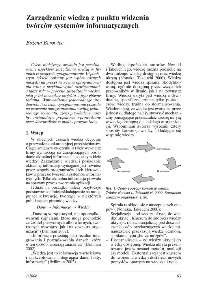 Zarządzanie wiedzą z punktu widzenia twórców systemów informatycznych Bożena Borowiec Celem niniejszego artykułu jest przedstawienie aspektów zarządzania wiedzą w firmach tworzących oprogramowanie. W poniższym tekście opisany jest wpływ różnych narzędzi na proces tworzenia oprogramowania wraz z przykładowymi rozwiązaniami, a także rola w procesie zarządzania wiedzą, jaką pełni menadżer projektu, i jego główne zadania. Wprowadzenie jednorodnego śro dowiska tworzenia oprogramowania pozwala na tworzenie oprogramowania według jednorodnego schematu, czego przykładem mogą być metodologie projektowe wprowadzane przez kierowników zespołów programistów. 1. Wstęp W obecnych czasach wiedza decyduje o przewadze konkurencyjnej przedsiębiorstw. Ciągłe zmiany w otoczeniu, a także wewnątrz firmy wymuszają na zarządzających posia danie aktualnej informacji, a co za tym idzie wiedzy. Zarządzanie wiedzą i posiadanie aktualnej informacji wymagane jest również przez zespoły programistów i ich kierowni ków w procesie tworzenia systemów informa tycznych. Tylko aktualna informacja pozwala na sprawny proces tworzenia aplikacji. Jednak na początku należy przytoczyć podstawowe definicje składające się na nastę pującą sekwencję, tworzące w niektórych publikacjach piramidę wiedzy. Dane → Informacje → Wiedza „Dane są szczątkowymi, nie uporządko wanymi sygnałami, które mogą pochodzić ze źródeł pierwotnych albo wtórnych, two rzonych wewnątrz, jak i na zewnątrz orga nizacji” (Brillman 2002). „Informacje powstają jako rezultat inte growania i porządkowania danych, które w ten sposób nabierają znaczenia” (Brillman 2002). „Wiedza jest to informacja wartościowa i zaakceptowana, integrująca dane, fakty, informacje” (Brillman 2002). 1/2006 Według japońskich autorów Nonaki i Takeuchi’ego, wiedzę można podzielić na dwa rodzaje: wiedzę dostępną oraz wiedzę ukrytą (Nonaka, Takeuchi 2000). Wiedza dostępna jest wiedzą spisaną, skodyfiko waną, ogólnie dostępną przez wszystkich pracowników w firmie, jak i na zewnątrz firmy. Wiedza ukryta jest wiedzą indywi dualną, specyficzną, znaną tylko posiada czowi wiedzy, trudną do sformalizowania. Wiadome jest, że wiedza jest tworzona przez jednostki, dlatego należy stworzyć mechani zmy pomagające przekształcić wiedzę ukrytą w wiedzę dostępną dla każdego w organiza cji. Wspomniani autorzy wyróżnili cztery sposoby konwersji wiedzy, układające się w spiralę wiedzy. Socjalizacja Eksternalizacja Internalizacja Kombinacja Rys. 1. Cztery sposoby konwersji wiedzy. Źródło: Nonaka I., Takeuchi H. 2000. Kreowanie wiedzy w organizacji, s. 96. Spirala ta składa się z następujących eta pów ( Nonaka, Takeuchi 2000): – Socjalizacja – od wiedzy ukrytej do wie dzy ukrytej. Kluczem do zdobycia wiedzy ukrytej w ramach socjalizacji jest doświad czenie osób przekazujących wiedzę np. nauczyciele przekazują wiedzę uczniom, spotkania typu „burze mózgów”. – Eksternalizacja – od wiedzy ukrytej do wiedzy dostępnej. Wiedza ukryta prezen towana jest w postaci metafor, analogii czy modeli. Eksternalizacja jest kluczem do tworzenia wiedzy i dostarcza nowych pomysłów opartych na wiedzy ukrytej. 63 – Kombinacja – od wiedzy dostępnej do wiedzy dostępnej. Poziom kombinacji pozwala na usystematyzowanie wiedzy dostępnej poprzez kategoryzowanie, ujednolicanie posiadanej informacji. – Internalizacja – od wiedzy dostępnej do wiedzy ukrytej. Internalizacja pozwala na przyswajanie wiedzy dostępnej wob ręb wiedzy ukrytej, tzw. „uczenie się przez działanie”. Jak wiadomo, produkcja oprogramowa nia jest procesem bardzo złożonym i czaso chłonnym. Pisanie aplikacji zajmuje bardzo często miesiące, a nawet lata. Dawniej wie dza osób pracujących w organizacjach przez wiele lat gromadzona była na papierze lub w głowach osób posiadających ją. Informacja zgromadzona w formie papierowej była więc trudna do uaktualnienia, natomiast informacja zgromadzona w głowach osób była trudno dostępna, zwłaszcza jeśli te osoby pracowały w dużych i rozproszonych organizacjach. Cześć z ważnych informacji nie była przechowywana czy zarchiwizo wana, a w przypadku gdy osoby posiadające ją opuszczały daną firmę, była bezpowrotnie utracona (Falbo, Arantes, Natali 2004). Ze względu na złożoność procesu two rzenia oprogramowania jego twórcy są naj bardziej narażeni na brak aktualnych infor macji, np. niewiedza wynikająca ze słabej analizy systemowej, niezrozumienia potrzeb klienta czy złego zaprojektowania systemu. Braki te powodować mogą przestoje w pro cesie tworzenia oprogramowania. Może też ono nie spełniać wymagań klienta. Aby uniknąć problemów wynikających z braku aktualnej wiedzy w zespołach programistycz nych, należy wprowadzić system lub systemy zarządzania wiedzą w danym zespole czy w danej organizacji. Istnienie wspólnej plat formy wiedzy pozwoli na sprawne zarządza nie procesem tworzenia oprogramowania. 2. Zarządzanie wiedzą w zespołach programistycznych Zarządzanie wiedzą jest to zintegrowany zestaw działań, którego celem jest odpo wiednie kształtowanie zasobów wiedzy znaj dującej się w głowach pracowników, co pozwala na zwiększenie wartości danej organizacji. Jest to proces identyfikowania, zdobywania i wykorzystania wiedzy mający na celu zapewnienie organizacji przewagi konkurencyjnej (Rojek-Mikołajczak 2004). 64 W procesie tworzenia oprogramowania zarządzanie wiedzą powinno następować na każdym etapie tego procesu. Zarządzanie wiedzą może zostać zaimplementowanie dzięki wprowadzeniu odpowiednich narzę dzi zarządzania wiedzą, jak i właściwej współpracy pomiędzy osobami w danym zespole. Proces tworzenia oprogramowania przedstawiony jest w skrócie na rysunku 2. Analiza systemu Projektowanie systemu Kodowanie aplikacji Testowanie aplikacji Ramy czasowe Implementacja U