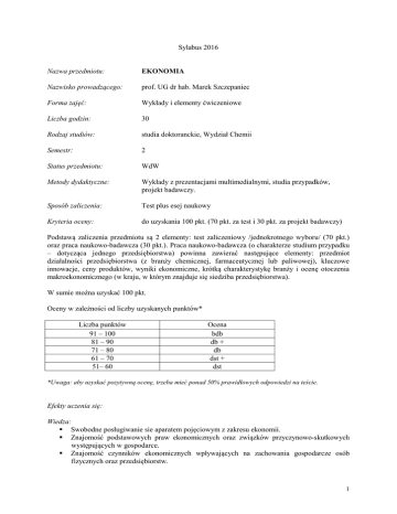 Sylabus 2016 Nazwa przedmiotu: EKONOMIA Nazwisko prowadzącego: prof. UG dr hab. Marek Szczepaniec Forma zajęć: Wykłady i elementy ćwiczeniowe Liczba godzin: 30 Rodzaj studiów: studia doktoranckie, Wydział Chemii Semestr: 2 Status przedmiotu: WdW Metody dydaktyczne: Wykłady z prezentacjami multimedialnymi, studia przypadków, projekt badawczy. Sposób zaliczenia: Test plus esej naukowy Kryteria oceny: do uzyskania 100 pkt. (70 pkt. za test i 30 pkt. za projekt badawczy) Podstawą zaliczenia przedmiotu są 2 elementy: test zaliczeniowy /jednokrotnego wyboru/ (70 pkt.) oraz praca naukowo-badawcza (30 pkt.). Praca naukowo-badawcza (o charakterze studium przypadku – dotycząca jednego przedsiębiorstwa) powinna zawierać następujące elementy: przedmiot działalności przedsiębiorstwa (z branży chemicznej, farmaceutycznej lub paliwowej), kluczowe innowacje, ceny produktów, wyniki ekonomiczne, krótką charakterystykę branży i ocenę otoczenia makroekonomicznego (w kraju, w którym znajduje się siedziba przedsiębiorstwa). W sumie można uzyskać 100 pkt. Oceny w zależności od liczby uzyskanych punktów* Liczba punktów 91 – 100 81 – 90 71 – 80 61 – 70 51– 60 Ocena bdb db + db dst + dst *Uwaga: aby uzyskać pozytywną ocenę, trzeba mieć ponad 50% prawidłowych odpowiedzi na teście. Efekty uczenia się: Wiedza: Swobodne posługiwanie sie aparatem pojęciowym z zakresu ekonomii. Znajomość podstawowych praw ekonomicznych oraz związków przyczynowo-skutkowych występujących w gospodarce. Znajomość czynników ekonomicznych wpływających na zachowania gospodarcze osób fizycznych oraz przedsiębiorstw. 1 Umiejętności: Umiejętność prowadzenia analiz otoczenia mikro i makroekonomicznego (gromadzenia, opisu i interpretacji danych, wnioskowania na bazie literatury naukowej oraz na bazie danych statystycznych). Umiejętność prowadzenia analiz sytuacji finansowej przedsiębiorstw. Kompetencje społeczne: Upowszechnianie wiedzy ekonomicznej w różnych środowiskach. Reagowanie na próby manipulowania danymi ekonomicznymi. Treści programowe: PROGRAM PRZEDMIOTU: EKONOMIA WYKŁADY 30 GODZ., Wydział Chemii, Studia doktoranckie, 2016 1. EKONOMICZNE PODSTAWY GOSPODAROWANIA Rzadkość. Ekonomiczne myślenie i wybór ekonomiczny. Granica możliwości produkcyjnych. Ekonomia jako nauka. Narzędzia analizy ekonomicznej. Modele ekonomiczne. Zakres zainteresowań makro- i mikroekonomii. Rynek. Uczestnicy gry rynkowej. Zalety i wady mechanizmu rynkowego. Prawa popytu i podaży. Cena równowagi. Ruch okrężny. 2. EKONOMICZNE ASPEKTY ZACHOWAŃ GOSPODARSTW DOMOWYCH Potrzeby ludzkie. Dochody, majątek a poziom życia. Źródła bogactwa. Dochody a zadowolenie z życia. Nierówności i ich skutki. Wykluczenie społeczne. Teoria wyboru konsumenta. Racjonalność zachowań. Stosowane heurystyki. Ograniczenia poznawcze. Zachowania pod wpływem emocji. Determinanty konsumpcji. Keynesowska funkcja konsumpcji. Teoria konsumpcji AndoModiglianiego. Teoria konsumpcji Friedmana. Cykl życia a oszczędności. 3. ROLA KAPITAŁU LUDZKIEGO W GOSPODARCE Wzrost i rozwój gospodarczy. Czynniki wzrostu. Wzrost gospodarczy w krajach OECD. Teoria kapitału ludzkiego T. Schultza i G. Beckera. Pomiar kapitału ludzkiego. Rola kapitału ludzkiego w procesie wzrostu. Kapitał ludzki a zatrudnienie i bezrobocie. Kapitał ludzki w Polsce i innych krajach OECD. Wpływ kapitału ludzkiego na innowacyjność i wyniki firm. 4. ZBRODNIA I KARA – EKONOMICZNA ANALIZA PRZESTĘPCZOŚCI Racjonalność i nieracjonalność zachowań przestępczych. Korzyści i koszty związane z przestępczością. Teoria przestępczości Beckera (cost-benefit analysis). Wysokość kar a przestępczość. Przestępstwa o podłożu ekonomicznym. Ofiary przestępstw. Przestępczość narkotykowa. 5. EKONOMICZNE ASPEKTY ZACHOWAŃ FIRM Pojęcie przedsiębiorstwa. Cykl życia przedsiębiorstw. Cele działania. Przychody i koszty. Podstawy informacyjne decyzji gospodarczych. Decyzje inwestycyjne w przedsiębiorstwie. Warunki instytucjonalno-prawne prowadzenia biznesu. Wyniki ekonomiczne firm w przemyśle chemicznym, farmaceutycznym i surowcowo-energetycznym. 2 6. INFORMACJA JAKO CZYNNIK PRODUKCJI Epoka informacyjna - przemiany w życiu społeczno-gospodarczym. Rola informacji w gospodarce (wpływ sektora informacyjnego na PKB, dochody, zatrudnienie, inflacje, eksport). Gospodarka cyfrowa. Procesy gospodarcze przebiegające w warunkach asymetrii informacji (analizy Akerlofa i Stiglitza). Rola internetu w gospodarce. Społeczeństwo informacyjne. Cyberprzestępczość. 7. ANALIZA STRUKTUR RYNKOWYCH I MECHANIZMY KSZTAŁTOWANIA CEN Otoczenie rynkowe firm. Warunki konkurencji. Konkurencja doskonała i niedoskonała. Metody wynagradzania menedżerów korporacji. Przestępstwa „białych kołnierzyków”. Bankructwa korporacji. Prawo antymonopolowe. Zmowy cenowe. Struktury rynkowe w przemyśle chemicznym, farmaceutycznym i surowcowo-energetycznym. Mechanizmy kształtowania cen w gospodarce. Inflacja i jej rodzaje. Przyczyny inflacji. Wpływ inflacji na dochody realne oraz wartość zgromadzonych oszczędności. Wpływ inflacji na działalność gospodarczą. 8. SEKTOR SUROWCOWO-ENERGETYCZNY I JEGO ROLA W GOSPODARCE Zasoby naturalne a bogactwo w skali mikro i makroekonomicznej. Źródła energii. Rola ropy, gazu i węgla w bilansie energetycznym. Gaz łupkowy. OZE. Ceny energii. Polityka energetyczna. Wyniki finansowe firm z sektora surowcowo-energetycznego. Studia przypadków: KGHM, ExxonMobil, BP, Energa. 9. KONIUNKTURA GOSPODARCZA Pojęcie i wskaźniki koniunktury gospodarczej. Sposób pomiaru produktu krajowego brutto. PKB a poziom życia. Zastosowanie rachunku PKB w polityce makroekonomicznej. Cykl koniunkturalny. Przegląd głównych teorii cyklu koniunkturalnego. Kurs walutowy i jego znaczenie w procesach wymiany. Zmiany koniunktury a sytuacja gospodarstw domowych oraz przedsiębiorców. 10. FUNKCJONOWANIE RYNKU PRACY Determinanty 