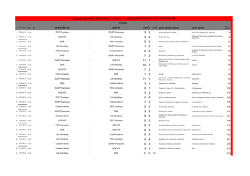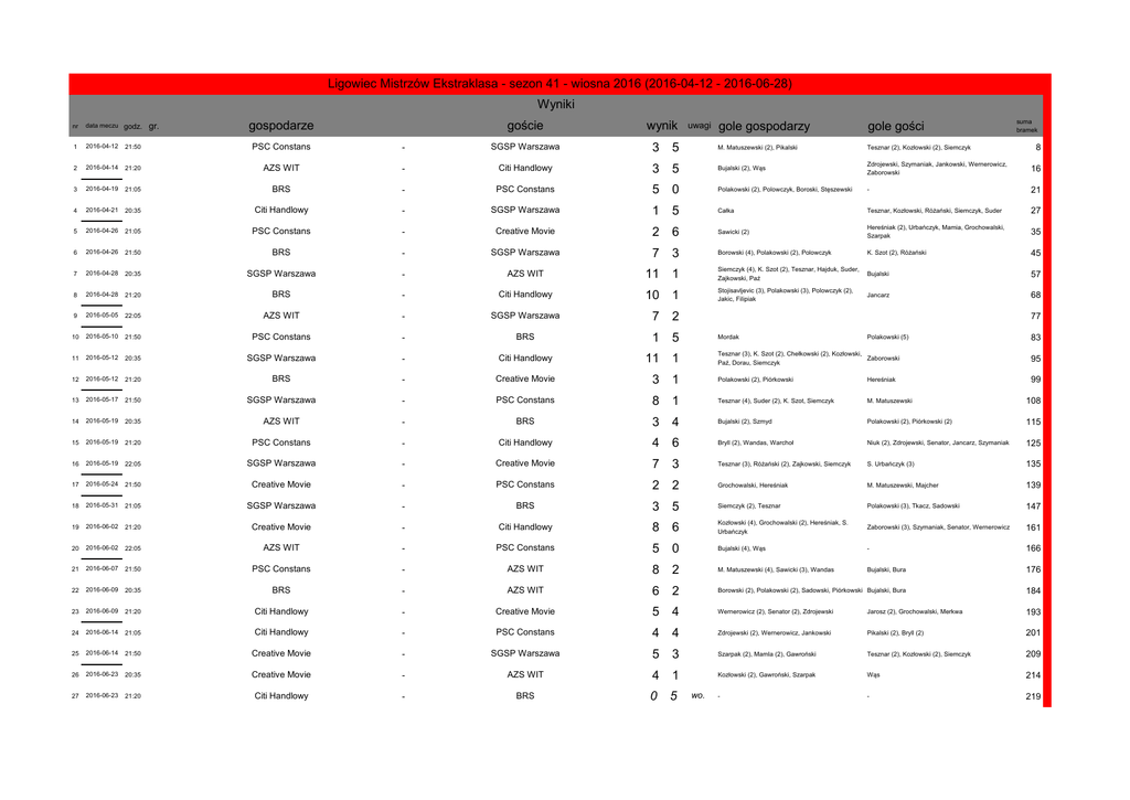 Ligowiec Mistrzów Ekstraklasa - sezon 41 - wiosna 2016 (2016-04-12 - 2016-06-28) Wyniki goście gospodarze gole gospodarzy gole gości 5 M. Matuszewski (2), Pikalski Tesznar (2), Kozłowski (2), Siemczyk 3 5 Bujalski (2), Wąs Zdrojewski, Szymaniak, Jankowski, Wernerowicz, Zaborowski 16 5 0 Polakowski (2), Polowczyk, Boroski, Stęszewski - 21 1 5 Całka Tesznar, Kozłowski, Różański, Siemczyk, Suder 27 35 wynik nr data meczu godz. gr. 1 2016-04-12 21:50 PSC Constans - SGSP Warszawa 3 2 2016-04-14 21:20 AZS WIT - Citi Handlowy 3 2016-04-19 21:05 BRS - PSC Constans 4 2016-04-21 20:35 Citi Handlowy - SGSP Warszawa uwagi suma bramek 8 5 2016-04-26 21:05 PSC Constans - Creative Movie 2 6 Sawicki (2) Hereśniak (2), Urbańczyk, Mamia, Grochowalski, Szarpak 6 2016-04-26 21:50 BRS - SGSP Warszawa 7 3 Borowski (4), Polakowski (2), Polowczyk K. Szot (2), Różański 45 1 Siemczyk (4), K. Szot (2), Tesznar, Hajduk, Suder, Zajkowski, Paź Bujalski 57 10 1 Stojisavljevic (3), Polakowski (3), Polowczyk (2), Jakic, Filipiak Jancarz 68 7 2016-04-28 20:35 SGSP Warszawa - AZS WIT 11 8 2016-04-28 21:20 BRS - Citi Handlowy 9 2016-05-05 22:05 AZS WIT - SGSP Warszawa 7 2 10 2016-05-10 21:50 PSC Constans - BRS 1 5 Mordak 95 99 77 Polakowski (5) 83 11 2016-05-12 20:35 SGSP Warszawa - Citi Handlowy 11 1 Tesznar (3), K. Szot (2), Chełkowski (2), Kozłowski, Zaborowski Paź, Dorau, Siemczyk 12 2016-05-12 21:20 BRS - Creative Movie 3 1 Polakowski (2), Piórkowski Hereśniak 13 2016-05-17 21:50 SGSP Warszawa - PSC Constans 8 1 Tesznar (4), Suder (2), K. Szot, Siemczyk M. Matuszewski 108 14 2016-05-19 20:35 AZS WIT - BRS 3 4 Bujalski (2), Szmyd Polakowski (2), Piórkowski (2) 115 15 2016-05-19 21:20 PSC Constans - Citi Handlowy 4 6 Bryll (2), Wandas, Warchoł Niuk (2), Zdrojewski, Senator, Jancarz, Szymaniak 125 16 2016-05-19 22:05 SGSP Warszawa - Creative Movie 7 3 Tesznar (3), Różański (2), Zajkowski, Siemczyk S. Urbańczyk (3) 135 17 2016-05-24 21:50 Creative Movie - PSC Constans 2 2 Grochowalski, Hereśniak M. Matuszewski, Majcher 139 18 2016-05-31 21:05 SGSP Warszawa - BRS 3 5 Siemczyk (2), Tesznar Polakowski (3), Tkacz, Sadowski 147 Zaborowski (3), Szymaniak, Senator, Wernerowicz 161 19 2016-06-02 21:20 Creative Movie - Citi Handlowy 8 6 Kozłowski (4), Grochowalski (2), Hereśniak, S. Urbańczyk 20 2016-06-02 22:05 AZS WIT - PSC Constans 5 0 Bujalski (4), Wąs - 166 21 2016-06-07 21:50 PSC Constans - AZS WIT 8 2 M. Matuszewski (4), Sawicki (3), Wandas Bujalski, Bura 176 22 2016-06-09 20:35 BRS - AZS WIT 6 2 Borowski (2), Polakowski (2), Sadowski, Piórkowski Bujalski, Bura 184 23 2016-06-09 21:20 Citi Handlowy - Creative Movie 5 4 Wernerowicz (2), Senator (2), Zdrojewski Jarosz (2), Grochowalski, Merkwa 193 24 2016-06-14 21:05 Citi Handlowy - PSC Constans 4 4 Zdrojewski (2), Wernerowicz, Jankowski Pikalski (2), Bryll (2) 201 25 2016-06-14 21:50 Creative Movie - SGSP Warszawa 5 3 Szarpak (2), Mamla (2), Gawroński Tesznar (2), Kozłowski (2), Siemczyk 209 26 2016-06-23 20:35 Creative Movie - AZS WIT 4 1 Kozłowski (2), Gawroński, Szarpak Wąs 214 27 2016-06-23 21:20 Citi Handlowy - BRS 0 5 - - 219 wo. 28 2016-06-23 22:05 AZS WIT 29 2016-06-28 19:35 Creative Movie 30 2016-06-28 20:20 Citi Handlowy 2 10 Szeląg, M. Szot Kozłowski (5), Grochowalski (2), Szarpak (2), Gawroński 231 BRS 3 2 Hereśniak (2), Szarpak Borowski, Piórkowski 236 AZS WIT 2 8 Niuk, Jancarz Bujalski (5), M. Szot, Wąs, Szeląg 246 - Creative Movie - Tabela: poz zespół m z r p 1. BRS 10 9 0 1 52 17 27 2. Creative Movie 10 6 1 3 46 33 19 SGSP 3. Warszawa 10 6 0 4 58 34 18 Król strzelców: 4. Citi Handlowy 10 3 1 6 31 62 10 Rafał Polakowski (BRS, 21 goli) 5. AZS WIT 10 3 0 7 34 52 9 6. PSC Constans 10 1 2 7 25 48 5 30 28 4 28 średnio b+ 246 b- pkt 14 521 Suma goli: 14 767 246 goli 246 8,20 Poprzednie sezony: g/m Ligowiec Mistrzów Ekstraklasa - statystyki po sezonie 41. Czołówka klasyfikacji strzelców wszech czasów: Klasyfikacja medalowa: poz drużyna m z s b poz 1. Grospol.pl 11 9 1 1 1. 303 2. BRS 8 8 2. 3. PKO BP 9 3 3 3 4. Toyota Radość 8 3 1 4 5. SMA 4 3 1 6. Citi Handlowy 12 2 4 7. Muniak i Synowie 5 2 8. AZS WIT 4 9. Securitas 10. gole zespół nazwisko sezony Piotr Jarosiewicz Aspen (12), Pilot (2), BobiRed.pl (48), Securitas (133), Toyota Radość (81), Dream Team (27) 21 273 Jarosław Senator Citi Handlowy 24 3. 186 Rafał Polakowski BRS (155), GrECo JLT Polska (31) 10 4. 152 Karol Bujalski AZS WIT 15 5. 127 Janusz Zaborowski Citi Handlowy (118), Pilot (9) 26 6 6. 126 Damian Majewski Citi Handlowy 13 1 2 7. 121 Tomasz Zdrojewski Citi Handlowy 18 1 2 1 8. 118 Krzysztof Zbyrasz Toyota Motor Poland 9 4 1 1 2 9. 114 Paweł Tarnowski Auto Plaza 8 Casino Olympic 2 1 1 10. 112 Marcin Turowski Citi Handlowy 13 Jimmy Bradley's Irish Bar 2 1 1 11. 111 Krzysztof Bogacki SMA 4 TVN 2 1 1 12. 108 Damian Niuk Citi Handlowy 16 13. Garaż 2 1 13. 107 Jakub Ignaczewski Pilot 12 14. Bysiory 1 1 14. 106 Dominik Skorża Grospol.pl 10 1 Patryk Polowczyk BRS (83), GrECo JLT Polska (21) 10 99 Paweł Ereminowicz PKO BP (3), Toyota Radość (92), FC Ursynów (4) 8 17. 93 Adam Wielgołaski PKO BP (89), ZBM IZ (4) 11 18. 91 Piotr Rasztawicki Grospol.pl 11 1 19. 87 Artur Lepianka Bosch/Siemens 7 1 20. 85 Marek Bis USP Zdrowie (47), BobiRed.pl (38) 11 21. 83 Konrad Maniak Pilot 11 1 22. 82 Paweł Zawadil Toyota Radość 11 1 23. 78 Wojciech Borowiec Casino Olympic 4 La Grande (17), Muniak i Synowie (28), Reuters (32) 8 Fritolay B.G. 1 1 15. Kolporter S.A. 1 1 16. Natra 1 1 Temple Villa London 1 1 Desperado 3 2 Wodociągi 3 2 21. Dowództwo Garnizonu Warszawa 2 2 22. Auto Plaza 2 1 BobiRed.pl 2 1 19. 28. 40. 43. 104 La Grande 2 1 1 24. 77 Marcin Pietrzycki Orco Group 2 1 1 25. 76 Łukasz Błaszczyk Garaż 5 Tomasz Jasiński Muniak i Synowie (5), Desperado (71) 5 Andrzej Krzystek Quantum 6 Paweł Rakoczy Dowództwo Garnizonu Warszawa (44), Bysiory (28) 11 Polcar 2 1 1 Stroer 2 1 1 27. 74 Africa Sport 1 1 Aspen 1 1 Michał Sadowski BRS 8 BP Arbit