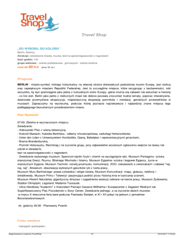 Travel Shop „DO WYBORU, DO KOLORU” Berlin, Niemcy Atrakcje: zwiedzanie miasta, muzea, test na spostrzegawczość z nagrodami ilość godzin: 14h grupa wiekowa: - szkoła podstawowa - gimnazjum - szkoła średnia cena od: 80 PLN (przy 45 os.) Program BERLIN - miasto-symbol, którego mieszkańcy na własnej skórze doświadczyli podzielonej murem Europy, jest stolicą oraz największym miastem Republiki Federalnej. Jest to szczególne miejsce, które rezygnując z bezbarwności, robi wszystko, by być postrzegane jako jedna z kulturalnych stolic Europy, gdzie można się zabawić lub wsłuchać w historię - co kto woli. Berlin jako jedno z nielicznych miast tak dobrze pozwala zrozumieć trudne tematy, poprzez interaktywne, doskonale przemyślane ekspozycje, majestatyczną ekspresję pomników i instalacji, genialnych przewodników w muzeach. Zapraszamy na wycieczkę, podczas której poznacie najciekawsze i najbardziej znane miejsca tego podlegającego bezustannym przeobrażeniom miasto. Plan Wycieczki: 07:00- Zbiórka w wyznaczonym miejscu. Zwiedzanie: - Aleksander Plaz z wieżą telewizyjną, - Kościól Mariacki, Katedra Berlińska - odłamy chrześcijaństwa, sarkofagi Hohenzollerów, - Unter den Liden z Uniwersytetem Humboldta, Operą, Bebelplaz i reprezentacyjnymi gmachami, - Brama Brandenburska, - Pomnik Holocaustu, Reichstag ( na życzenie grupy, przy odpowiednio wczesnym zgłoszeniu wejście na tarasy lub udział w obradach), test na spostrzegawczość z nagrodami, - Zwiedzanie wybranego muzeum: Spectrum-tajniki fizyki i chemii na wyciągnięcie ręki, Muzeum Pentagonu- sztuka starożytnej Grecji, Rzymu, Bliskiego Wschodu i Islamu, Muzeum Egipskie- sztuka i bogowie Egipscy, życie w starożytnym Egipcie, Muzeum Techniki- rozwój przemysłu, komunkiacji, ZOO- ciekawostki o zwierzakach i zabawa "naj, naj, naj", Akwarium- obserwacja wybranych gatunków ryb z karta pracy, Muzeum Muru Berlińskiego- prawa człowieka i religie świata, Muzeum Komunikacji- mapy, globusy, telefony i światłowody, Muzeum Filmu i Telewizji- pasjonująca podróż przez historią kina w lustrzanej scenerii, Muzeum Historii Naturalnej- gigantyczny dinozaur i zagadnienia ewolucji zebrane na karcie pracy, Muzeum Żydowskie, Stadion Olimpijski, Legoland, Madame Tussauds. - Ulica Handlowa "Kudamm" z Kościołem Pamięci Cesarza Willhelma i Europacenter z Zegarem Wodnym lub SuperNowoczesny Plac Poczdamski z Sony Center. Zwiedzanie jednego, a na życzenie dwóch muzeów. w marcu X wieczorna feria barw podczas Festiwalu Świateł, w XI i XII pobyt na jednym z jarmarków Bozonarodzeniowych. ok. godziny 20:30 - Planowany Powrót. Cena zawiera - transport autokarem; Wygenerowane w systemie TravelShop 1/2 03-03-2017 17:53:23 - realizację programu; - opiekę i komentarz pilota TRAVEL SHOP; - ubezpieczenie KL i NNW SIGNAL IDUNA; - podatek VAT; CENA NIE ZAWIERA: Dopłata za bilet wstępu do wybranego muzeum (ok. 1,5-6,5€ - w zależności od wybranego muzeum), Obiadu w jednej ze sprawdzonych restauracji + ok. 10 EURO/os. Dodatkowe informacje Cena kalkulowana jest dla grup liczących 45 Uczestników, wyjeżdżających ze Szczecina. Kalkulacja dla konkretnej grupy (inna liczba uczestników, miejsce wyjazdu) na życzenie Klienta. Powyższa treść nie stanowi oferty handlowej w rozumieniu art. 66 § 1 kodeksu cywilnego oraz innych właściwych przepisów prawnych. Wygenerowane w systemie TravelShop 2/2 03-03-2017 17:53:23