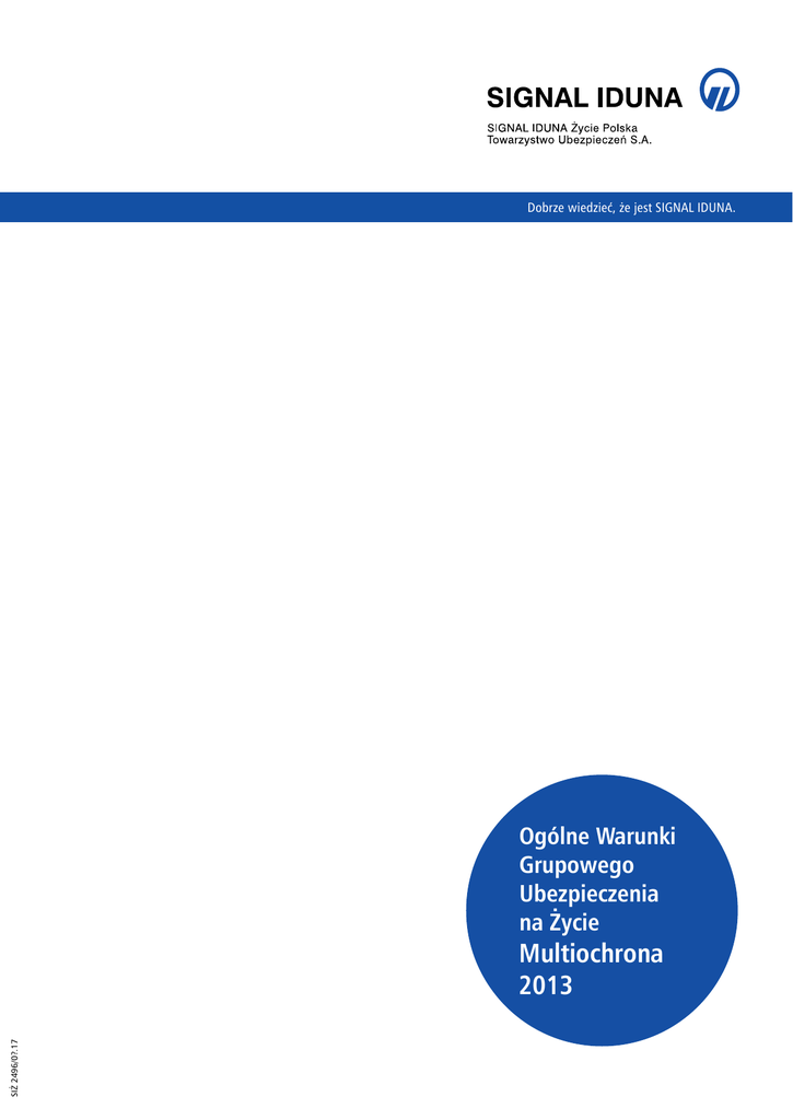 Dobrze wiedzieć, że jest SIGNAL IDUNA. Ogólne Warunki Grupowego Ubezpieczenia na Życie SIŻ 2496/0?.17 Multiochrona 2013 Aneks nr 1 Do Ogólnych Warunków Grupowego Ubezpieczenia na Życie „MULTIOCHRONA” zatwierdzonych uchwałą Nr 30/Z/2013 Zarządu SIGNAL IDUNA Życie Polska Towarzystwo Ubezpieczeń S.A. z dnia 12 sierpnia 2013 r. W Ogólnych Warunkach Grupowego Ubezpieczenia na Życie „MULTIOCHRONA” zatwierdzonych uchwałą Nr 30/Z/2013 Zarządu SIGNAL IDUNA Życie Polska Towarzystwo Ubezpieczeń S.A. z dnia 12 sierpnia 2013 r. (zwanych dalej OWU) wprowadza się następujące zmiany: I. 1) § 1 POSTANOWIENIA OGÓLNE zostaje poprzedzony informacjami o poniższym brzmieniu: Najważniejsze informacje dotyczące ubezpieczenia Szanowny Kliencie, poniżej przedstawiamy najważniejsze informacje zawarte w Ogólnych Warunkach Grupowego Ubezpieczenia na Życie „MULTIOCHRONA”. Numer jednostki redakcyjnej Lp. Rodzaj informacji Ogólnych Warunków Grupowego Ubezpieczenia na Życie „MULTIOCHRONA” § 2; § 3; § 17; § 18; § 19; § 20; § 21; § 22; § 23; § 24; § 25; § 26; § 27; 1. Przesłanki wypłaty odszkodowania i innych świadczeń lub wartości wykupu ubezpieczenia. § 28; § 29; § 30; § 31; § 32; § 33; § 34; § 35; § 36; § 37; § 38; § 39; § 40; § 41; § 42; § 43; § 44; § 45; § 46; § 47; § 48; § 49; § 50; § 61; § 62; § 63; § 64; § 65; § 66; § 67; § 2; § 14; § 16; § 18; § 19; § 20; SIT 0212/01.16 2. Ograniczenia oraz wyłączenia odpowiedzialności § 21; § 22; § 24; § 25; § 26; § 27; zakładu ubezpieczeń uprawniające do odmowy § 28; §29; § 30; § 31; § 32; § 33; wypłaty odszkodowania i innych świadczeń § 34; § 35; §36; § 37; § 38; § 39; lub ich obniżenia. § 40; § 41; § 42; § 43; § 44; § 45; § 46; § 47; § 48; § 49; 2) § 7 ust. 5 otrzymuje brzmienie: Ubezpieczyciel, przed objęciem danej osoby ochroną ubezpieczeniową, może zwrócić się z pytaniem dotyczącym formy zatrudnienia, stanu jej zdrowia lub skierować ją na badania lekarskie z wyłączeniem badań genetycznych. 3) § 8 ust. 3 otrzymuje brzmienie: 7.Za pisemną zgodą Ubezpieczonego, Ubezpieczyciel może nadto uzyskać od Narodowego Funduszu Zdrowia dane o nazwach i adresach świadczeniodawców, którzy udzielili opieki zdrowotnej w związku ze zdarzeniem będącym podstawą ustalenia jego odpowiedzialności oraz wysokości świadczenia. 7) § 60 otrzymuje brzmienie: 6) § 55 dodaje się ust. 6 i 7. 1.SIGNAL IDUNA Życie Polska TU S.A. podlega nadzorowi Komisji Nadzoru Finansowego. 2.Ubezpieczający, Ubezpieczony, Uposażony lub Uprawniony z umowy ubezpieczenia, będący osobą fizyczną (zwany dalej „Klientem”) może składać skargi, zażalenia i reklamacje, zawierające zastrzeżenia dotyczące usług świadczonych przez Ubezpieczyciela (zwane dalej łącznie „reklamacjami”). 3.Reklamacje można zgłaszać w następujących miejscach i formie: a)pisemnie za pośrednictwem poczty, kuriera lub posłańca na adres: SIGNAL IDUNA Życie Polska TU S.A., ul. Przyokopowa 31, 01-208 Warszawa, b)faksem na numer: 22 50 56 101, c)pocztą elektroniczną: [email protected], d)telefonicznie, pod numerem 0 801 120 120 lub 22 50 56 506, e)osobiście w siedzibie SIGNAL IDUNA (adres jak wyżej) lub Regionalnym Centrum Obsługi Ubezpieczeń (dane kontaktowe Regionalnych Centrów Obsługi Ubezpieczeń SIGNAL IDUNA podane są na stronie internetowej spółki pod adresem: www.signal-iduna.pl /signaliduna/kontakt) i na bieżąco aktualizowane. 4.Reklamacja powinna zawierać podstawowe dane kontaktowe Klienta umożliwiające identyfikację i kontakt w celu udzielenia odpowiedzi (imię i nazwisko, adres, numer umowy ubezpieczenia/polisy, której reklamacja dotyczy lub numer sprawy dotyczącej roszczenia, nadany wcześniej przez SIGNAL IDUNA). 5.Ubezpieczyciel rozpatruje reklamację i udziela na nią odpowiedzi niezwłocznie, nie później niż w terminie 30 dni od dnia jej otrzymania, chyba że mają miejsce szczególnie skomplikowane okoliczności, uniemożliwiające rozpatrzenie reklamacji i udzielenia odpowiedzi w tym terminie. W takiej sytuacji Ubezpieczyciel poinformuje Klienta, który złożył reklamację, o przyczynach opóźnienia, okolicznościach, które muszą zostać ustalone dla rozpatrzenia sprawy oraz określi przewidywany termin rozpatrzenia reklamacji i udzielenia odpowiedzi, który nie może przekroczyć 60 dni od dnia otrzymania reklamacji. W przypadku niedotrzymania powyższych terminów rozpatrzenia reklamacji i udzielenia odpowiedzi, reklamację uważa się za rozpatrzoną zgodnie z wolą Klienta. 6.Odpowiedź na reklamację jest udzielana w formie papierowej lub za pomocą innego trwałego nośnika informacji, a na wniosek Klienta – może być również dostarczona pocztą elektroniczną. 7.Powództwo o roszczenia wynikające z umowy ubezpieczenia można wytoczyć albo według przepisów o właściwości ogólnej albo przed sąd właściwy dla miejsca zamieszkania lub siedziby Ubezpieczającego, Ubezpieczonego, Uposażonego lub innej osoby uprawnionej z umowy ubezpieczenia, a także przed sąd właściwy dla miejsca zamieszkania spadkobiercy Ubezpieczonego lub spadkobiercy uprawnionego z umowy ubezpieczenia. 8.Klient może też składać skargi i zażalenia na działalność Ubezpieczyciela do Komisji Nadzoru Finansowego, Rzecznika Finansowego, miejskiego lub powiatowego Rzecznika Konsumentów oraz innych organów zajmujących się ochroną klientów podmiotów rynku finansowego. 9.Spory wynikające z Umowy ubezpieczenia mogą być rozpatrywane przez sądy polubowne przy Rzeczniku Ubezpieczonych oraz Komisji Nadzoru Finansowego zgodnie z regulaminami tych sądów. 8) § 68 otrzymuje brzmienie: Odpowiedzialność Ubezpieczyciela z tytułu ochrony udzielanej współubezpieczonemu rozpoczyna się i kończy w tych samych datach co odpowiedzialność w stosunku do Ubezpieczonego, z którym współubezpieczony pozostaje w odpowiedniej r