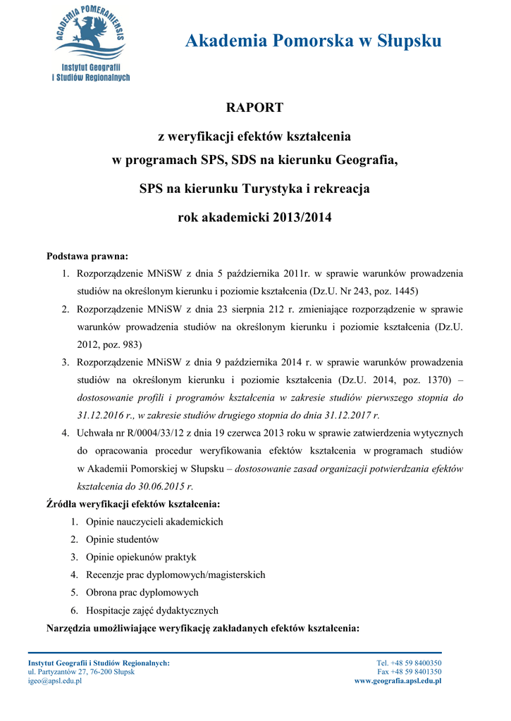 Akademia Pomorska w Słupsku RAPORT z weryfikacji efektów kształcenia w programach SPS, SDS na kierunku Geografia, SPS na kierunku Turystyka i rekreacja rok akademicki 2013/2014 Podstawa prawna: 1. Rozporządzenie MNiSW z dnia 5 października 2011r. w sprawie warunków prowadzenia studiów na określonym kierunku i poziomie kształcenia (Dz.U. Nr 243, poz. 1445) 2. Rozporządzenie MNiSW z dnia 23 sierpnia 212 r. zmieniające rozporządzenie w sprawie warunków prowadzenia studiów na określonym kierunku i poziomie kształcenia (Dz.U. 2012, poz. 983) 3. Rozporządzenie MNiSW z dnia 9 października 2014 r. w sprawie warunków prowadzenia studiów na określonym kierunku i poziomie kształcenia (Dz.U. 2014, poz. 1370) – dostosowanie profili i programów kształcenia w zakresie studiów pierwszego stopnia do 31.12.2016 r., w zakresie studiów drugiego stopnia do dnia 31.12.2017 r. 4. Uchwała nr R/0004/33/12 z dnia 19 czerwca 2013 roku w sprawie zatwierdzenia wytycznych do opracowania procedur weryfikowania efektów kształcenia w programach studiów w Akademii Pomorskiej w Słupsku – dostosowanie zasad organizacji potwierdzania efektów kształcenia do 30.06.2015 r. Źródła weryfikacji efektów kształcenia: 1. Opinie nauczycieli akademickich 2. Opinie studentów 3. Opinie opiekunów praktyk 4. Recenzje prac dyplomowych/magisterskich 5. Obrona prac dyplomowych 6. Hospitacje zajęć dydaktycznych Narzędzia umożliwiające weryfikację zakładanych efektów kształcenia: Instytut Geografii i Studiów Regionalnych: ul. Partyzantów 27, 76-200 Słupsk [email protected] Tel. +48 59 8400350 Fax +48 59 8401350 www.geografia.apsl.edu.pl Akademia Pomorska w Słupsku 1. mierniki ilościowe: oceny z zaliczeń i egzaminów, nakład pracy przeciętnego studenta potrzebny do osiągnięcia założonych efektów kształcenia, oceny uzyskane z egzaminu dyplomowego, oceny prac dyplomowych wystawiane przez recenzentów i promotorów 2. mierniki jakościowe: wyniki badań ankietowych oceny programu kształcenia, opinia absolwentów oceniających zrealizowany program kształcenia, adekwatność pytań egzaminacyjnych i kolokwialnych do efektów kształcenia, znajomość przez studentów wymogów dotyczących sposobu zaliczenia przedmiotu i wyliczania oceny końcowej, dostosowanie pytań na egzamin dyplomowy do weryfikacji założonych efektów kształcenia, przestrzeganie zasad pisania prac licencjackich i magisterskich, opinie pracodawców o studentach odbywających praktyki, ocena wyników hospitacji zajęć w zakresie dostosowania form i metod zajęć do osiągnięcia zakładanych efektów kształcenia Instytut Geografii i Studiów Regionalnych stosuje różnorodne sposoby weryfikacji efektów kształcenia w zakresie wiedzy, umiejętności i kompetencji społecznych. Wyodrębnione zostały cztery obszary (trzy dotyczące okresu studiowania i jeden odnoszący się do pracy zawodowej absolwentów IGiSR), które pozwalają weryfikować osiągnięte efekty kształcenia. Obszar pierwszy to proces kształcenia przy wykorzystaniu różnorodnych form zajęć (wykłady, ćwiczenia audytoryjne, laboratoryjne, konwersatoria, seminaria itp.), które pozwalają weryfikować efekty kształcenia przede wszystkim w zakresie wiedzy i umiejętności. Drugi obszar to praktyczny wymiar procesu kształcenia (praktyki i/lub staże studenckie), który pozwala zmierzyć stopień realizacji efektów kształcenia zwłaszcza w obszarze umiejętności i kompetencji społecznych. Kolejny obszar to egzamin dyplomowy, umożliwiający weryfikację zarówno wiedzy, jak i umiejętności. Ostatni obszar związany jest ze śledzeniem losów absolwentów i pozwala on weryfikować stopień realizacji efektów kształcenia głównie w zakresie umiejętności i kompetencji społecznych. Analiza weryfikacji realizacji efektów w poszczególnych obszarach: I. proces kształcenia przy wykorzystaniu różnorodnych form zajęć II. praktyki i/lub staże studenckie III. egzamin dyplomowy IV. rynek pracy i pracodawcy. Instytut Geografii i Studiów Regionalnych: ul. Partyzantów 27, 76-200 Słupsk [email protected] Tel. +48 59 8400350 Fax +48 59 8401350 www.geografia.apsl.edu.pl Akademia Pomorska w Słupsku Ad. I. W trakcie studiów podstawowymi kryteriami weryfikacji efektów kształcenia są oceny z zaliczeń wykładów, ćwiczeń audytoryjnych, laboratoryjnych, terenowych, konwersatoriów oraz oceny z egzaminów. Podstawą oceny studenta są okresowe prace kontrolne w postaci: kolokwiów, domowych prac kontrolnych, projektów, dyskusji problemowych, prezentacji multimedialnych, prezentacji ustnych i pisemnych, obserwacji, scenariuszy zajęć, przeprowadzenie lekcji. Egzaminy mogą być przeprowadzane w formie pisemnej i ustnej. W każdym z tych przypadków, zadania zaliczeniowe i egzaminacyjne muszą być formułowane z punktu widzenia efektów kształcenia zapisanych w sylabusach przedmiotów. Realizacja tego wymogu pociąga za sobą konieczność stosowania określonych form egzaminów pisemnych. Zadania testowe są formułowane tak, aby nie ograniczać egzaminu do sprawdzania wiedzy; łączy się różne formy testu i zadań problemowych. Formy weryfikowania szczegółowych efektów kształcenia dla modułu są opisane w sylabusach przedmiotowych, które prowadzący zajęcia ma obowiązek przygotować przed rozpoczęciem zajęć. W przypadku wszystkich form sprawdzenia efektów kształcenia ocenę wystawia prowadzący zajęcia, zgodnie z kryteriami oceny podanymi na pierwszych zajęciach. Skala ocen, którą przewiduje Regulamin studiów AP w Słupsku jest następująca: bardzo dobry, dobry plus, dobry, dostateczny plus, dostateczny, niedostateczny. Zgodnie z wypracowanymi przez Instytutową Komisję Wewnętrznego Systemu Zapewniania Jakości Kształcenia w IGiSR funkcjonowało w roku akademickim 2013/2014 narzędzie oceny programów kształcenia przez absolwentów danego kierunku. Oceny dokonali absolwenci studiów pierwszego stopnia oraz