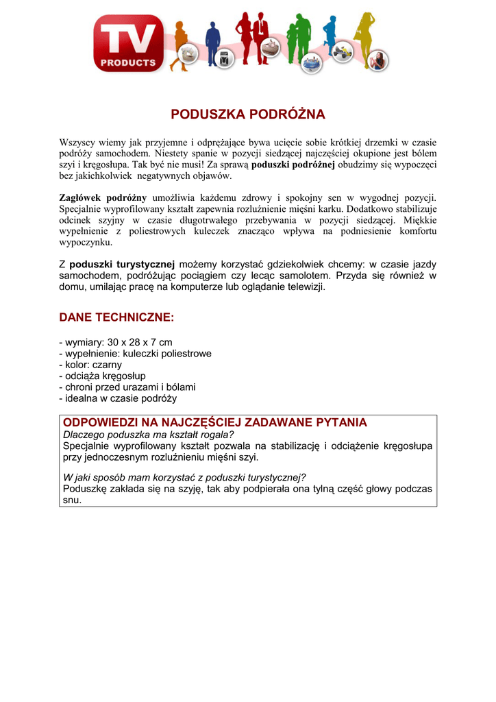 PODUSZKA PODRÓŻNA Wszyscy wiemy jak przyjemne i odprężające bywa ucięcie sobie krótkiej drzemki w czasie podróży samochodem. Niestety spanie w pozycji siedzącej najczęściej okupione jest bólem szyi i kręgosłupa. Tak być nie musi! Za sprawą poduszki podróżnej obudzimy się wypoczęci bez jakichkolwiek negatywnych objawów. Zagłówek podróżny umożliwia każdemu zdrowy i spokojny sen w wygodnej pozycji. Specjalnie wyprofilowany kształt zapewnia rozluźnienie mięśni karku. Dodatkowo stabilizuje odcinek szyjny w czasie długotrwałego przebywania w pozycji siedzącej. Miękkie wypełnienie z poliestrowych kuleczek znacząco wpływa na podniesienie komfortu wypoczynku. Z poduszki turystycznej możemy korzystać gdziekolwiek chcemy: w czasie jazdy samochodem, podróżując pociągiem czy lecąc samolotem. Przyda się również w domu, umilając pracę na komputerze lub oglądanie telewizji. DANE TECHNICZNE: - wymiary: 30 x 28 x 7 cm - wypełnienie: kuleczki poliestrowe - kolor: czarny - odciąża kręgosłup - chroni przed urazami i bólami - idealna w czasie podróży ODPOWIEDZI NA NAJCZĘŚCIEJ ZADAWANE PYTANIA Dlaczego poduszka ma kształt rogala? Specjalnie wyprofilowany kształt pozwala na stabilizację i odciążenie kręgosłupa przy jednoczesnym rozluźnieniu mięśni szyi. W jaki sposób mam korzystać z poduszki turystycznej? Poduszkę zakłada się na szyję, tak aby podpierała ona tylną część głowy podczas snu.