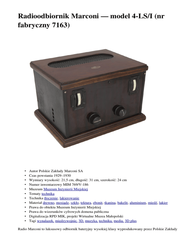 Radioodbiornik Marconi — model 4LS/I (nr fabryczny 7163) • • • • • • • • • • • • Autor Polskie Zakłady Marconi SA Czas powstania 1929–1930 Wymiary wysokość: 21,5 cm, długość: 31 cm, szerokość: 24 cm Numer inwentarzowy MIM 769/V186 Muzeum Muzeum Inżynierii Miejskiej Tematy technika Technika tłoczenie, lakierowanie Materiał drewno, mosiądz, szkło, tektura, ebonit, tkanina, bakelit, aluminium, miedź, lakier Prawa do obiektu Muzeum Inżynierii Miejskiej Prawa do wizerunków cyfrowych domena publiczna Digitalizacja RPD MIK, projekt Wirtualne Muzea Małopolski Tagi wynalazek, międzywojnie, 3D, muzyka, technika, media, 3D plus Radio Marconi to luksusowy odbiornik bateryjny wysokiej klasy wyprodukowany przez Polskie Zakłady Marconi SA. Ta warszawska filia londyńskiego przedsiębiorstwa Marconi Wireless Telegraph Company Ltd., założonego przez niekwestionowanego twórcę radiofonii Guglielma Marconiego, powstała w 1928 roku. Do roku 1932 mieściła się w Warszawie, w budynku Polskiego Towarzystwa Radiotechnicznego, pierwszej liczącej się na rynku polskiej firmy, która rozpoczęła stopniową radiofonizację Polski. Zakłady Marconi wyprodukowały kilkadziesiąt modeli odbiorników bateryjnych oraz dwa modele odbiorników sieciowych. Oprócz odbiorników radiowych montowały także radiostacje nadawcze, radiostacje przenośne i wyposażenie nagłośnieniowe do kin. Model 4LS/I jest przykładem konstrukcji odbiorników z początków historii radiofonii. Nie posiadał wbudowanego głośnika, dlatego do słuchania radia konieczne było podłączenie słuchawek lub zewnętrznego głośnika. Prezentowany radioodbiornik, dzięki zastosowaniu lampy ekranowej, umożliwiał wyraźne i głośne słuchanie stacji europejskich, eliminując stacje lokalne. Ogromne zalety tego typu odbiorników — jak prostota konstrukcji, bardzo duża czułość oraz możliwość detekcji niemodulowanego sygnału telegraficznego — powodowały, że były one powszechnie wykorzystywane w radiotechnice aż do schyłku lat 30. XX wieku. Odbiornik 4LS/I umieszczony był w drewnianej, prostokątnej skrzynce wykonanej z trolitu. W górnej płaszczyźnie skrzynki znajdowała się odchylana klapka ze znakiem firmowym producenta oraz otworem kratki wentylacyjnej do odprowadzania ciepła z lamp elektronowych. Z przodu obudowy po bokach umieszczono dwie skale z podziałką, poniżej dwa pokrętła strojenia dla zakresów fal długich i krótkich. Warto zobaczyć http://www.radioretro.pl/marconi.html Opracowanie: Muzeum Inżynierii Miejskiej, © wszystkie prawa zastrzeżone „Teraźniejszość jest ich, przyszłość moja” — Nikola Tesla Ekscentryk i wizjoner. Geniusz i odkrywca. Przede wszystkim jednak Nikola Tesla jest twórcą niemal 300 patentów, które chronią jego 125 wynalazków w kilkudziesięciu krajach świata, i które całkowicie zmieniły ludzką cywilizację. Warto też zapamiętać, że był jednocześnie niemal zapomniany, oszukiwany i wyśmiewany za życia. Okradano go z pomysłów, których sam nie był w stanie zamienić w finansowy sukces. Tesla mógł zostać milionerem, jednak zmarł w biedzie i samotności, pozostawiając nam jednocześnie spadek odkryć, które do dziś napędzają świat. Nikola Tesla urodził się w serbskiej rodzinie we wsi Smiljan w Chorwacji 10 lipca 1856 roku podczas ogromnej burzy. Opowieści głoszą, iż dziwnym zrządzeniem losu właśnie owo zjawisko nadało kształt jego późniejszemu życiu. Był czwartym dzieckiem Milutina Tesli (kapłana ortodoksyjnego serbskiego kościoła) i Any Kalinić. Nie poświęcano mu jednak uwagi aż do czasu przeprowadzki do Gospicia w 1862 roku. Nikola Tesla rozpoczął wówczas naukę w Karlovac, którą ukończył już po trzech latach. Gdy miał 12 lat, opanował na pamięć logarytmiczne tablice, a także zaczął konstruować swoje pierwsze silniki, zupełnie niepodobne do tych, które widział na co dzień w swojej okolicy. W 1875 roku rozpoczął studia inżynierii energetycznej na Politechnice Austriackiej w Grazu. Był to początek jego pracy nad już poważnymi projektami wykorzystania źródeł alternatywnych do pozyskiwania energii. Nikola Tesla posiadał niezwykłą pamięć wzrokową, dzięki czemu błyskawicznie opanował aż sześć języków, a jego wyliczenia „na oko” miały margines błędu jedną dziesiątą milimetra! Współcześni studenci mogliby się uczyć od niego tytanowej pracy, gdyż Tesla potrafił przesiadywać nad książkami 20 godzin dziennie tylko po to, by móc zakończyć rozważane przez niego zagadnienie. Młody naukowiec stwierdził, iż przewyższa poziomem swoich wykładowców. Tym samym zaniedbywał zajęcia i w 1878 roku musiał opuścić uczelnię, zrywając jednocześnie kontakt z rodziną. 6 czerwca 1884 roku Nikola Tesla wyemigrował do Nowego Jorku. Posiadając rekomendację od menedżera firmy, w której wcześniej pracował — Ch. Batchelora — udał się do największego wynalazcy tamtych czasów — Thomasa Edisona. Po zapoznaniu się z futurystycznymi projektami Edison niestety poczuł się zagrożony i szybko zerwał współpracę z Teslą. Przez kilka najbliższych lat obaj żyli w ciągłym konflikcie, angażując w nigo coraz więcej osób. Edison był w stanie posunąć się do publicznego zafałszowania eksperymentów z prądem przemiennym, by móc zdyskredytować Teslę! Na szczęście nie wszystkich udało mu się przekonać, dzięki czemu Nikola dwa lata później otworzył swoją własną fabrykę. Można go było wówczas spotkać w trakcie spacerów pośród energetycznych promieni albo siedzącego między błyskającymi urządzeniami. Wtedy to właśnie opracował do końca podstawy prądu przemiennego, świetlówki oraz silnik elektryczny. Jak pisze Mark Seifer — biograf Tesli — „był pierwszą osobą, która naprawdę pokazała, jak przekazywać bezprzewodową energię przez powietrze do lamp elektrycznych”. Do 