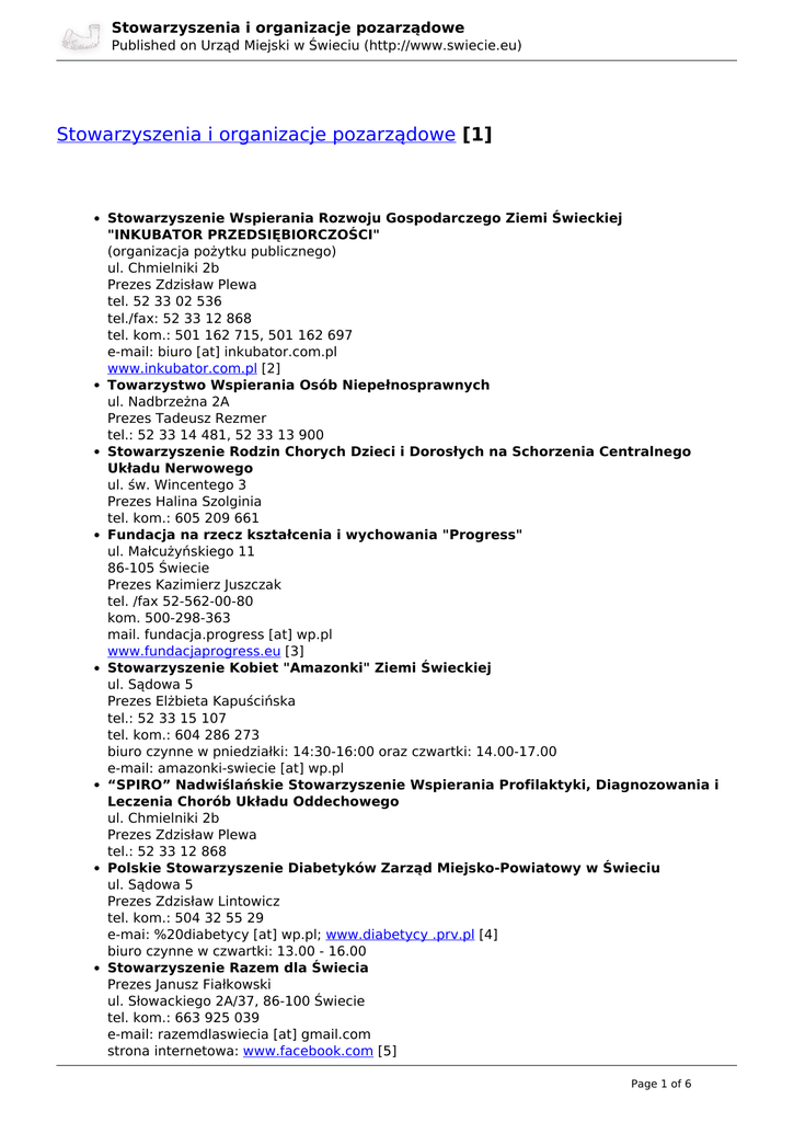 Stowarzyszenia i organizacje pozarządowe Published on Urząd Miejski w Świeciu (http://www.swiecie.eu) Stowarzyszenia i organizacje pozarządowe [1] Stowarzyszenie Wspierania Rozwoju Gospodarczego Ziemi Świeckiej "INKUBATOR PRZEDSIĘBIORCZOŚCI" (organizacja pożytku publicznego) ul. Chmielniki 2b Prezes Zdzisław Plewa tel. 52 33 02 536 tel./fax: 52 33 12 868 tel. kom.: 501 162 715, 501 162 697 e-mail: biuro [at] inkubator.com.pl www.inkubator.com.pl [2] Towarzystwo Wspierania Osób Niepełnosprawnych ul. Nadbrzeżna 2A Prezes Tadeusz Rezmer tel.: 52 33 14 481, 52 33 13 900 Stowarzyszenie Rodzin Chorych Dzieci i Dorosłych na Schorzenia Centralnego Układu Nerwowego ul. św. Wincentego 3 Prezes Halina Szolginia tel. kom.: 605 209 661 Fundacja na rzecz kształcenia i wychowania "Progress" ul. Małcużyńskiego 11 86-105 Świecie Prezes Kazimierz Juszczak tel. /fax 52-562-00-80 kom. 500-298-363 mail. fundacja.progress [at] wp.pl www.fundacjaprogress.eu [3] Stowarzyszenie Kobiet "Amazonki" Ziemi Świeckiej ul. Sądowa 5 Prezes Elżbieta Kapuścińska tel.: 52 33 15 107 tel. kom.: 604 286 273 biuro czynne w pniedziałki: 14:30-16:00 oraz czwartki: 14.00-17.00 e-mail: amazonki-swiecie [at] wp.pl “SPIRO” Nadwiślańskie Stowarzyszenie Wspierania Profilaktyki, Diagnozowania i Leczenia Chorób Układu Oddechowego ul. Chmielniki 2b Prezes Zdzisław Plewa tel.: 52 33 12 868 Polskie Stowarzyszenie Diabetyków Zarząd Miejsko-Powiatowy w Świeciu ul. Sądowa 5 Prezes Zdzisław Lintowicz tel. kom.: 504 32 55 29 e-mai: %20diabetycy [at] wp.pl; www.diabetycy .prv.pl [4] biuro czynne w czwartki: 13.00 - 16.00 Stowarzyszenie Razem dla Świecia Prezes Janusz Fiałkowski ul. Słowackiego 2A/37, 86-100 Świecie tel. kom.: 663 925 039 e-mail: razemdlaswiecia [at] gmail.com strona internetowa: www.facebook.com [5] Page 1 of 6 Stowarzyszenia i organizacje pozarządowe Published on Urząd Miejski w Świeciu (http://www.swiecie.eu) Stowarzyszenie Pomocy Osobom ze Spektrum Autyzmu "Niebieski Klucz" w Świeciu ul. Wojska Polskiego 69B/54, 86-105 Świecie Prezes Monika Rezmer, tel.: 531 788 485, e-mail: niebieski.klucz-swiecie [at] o2.pl Wiceprezes Aleksandra Sikorska, tel.: 693 457 329, e-mail: a.m.sikorska [at] hotmail.com strona internetowa: www.facebook.com [6] Stowarzyszenie Popierania Sportowej Sylwetki "Next Gym" w Świeciu Prezes Krzysztof Browiński ul. Hallera 4/1, 86-100 Świecie Tel.: 602 134 280 e-mail: info [at] nextgym.pl Polski Związek Hodowców Gołębi Pocztowych Oddział Świecie z siedzibą w Laskowicach Prezes Zbigniew Graczyk tel. kom.: 784 193 289 e-mail: zb.graczyk [at] op.pl; zielinski.zenon@zgm-swiecie [7]; strona internetowa: www.pzhgp_okregtorun.republika.pl [8] Polski Związek Niewidomych Koło PZN w Świeciu ul. Wojska Polskiego 139, OKSiR (Dom Kultury) Prezes Alicja Frank tel.: 515 23 10 24 biuro czynne w środy: 10:00 - 12:00 oraz czwartki: 16:00 - 18:00 Polski Czerwony Krzyż ul. Wojska Polskiego (barak nr 1) Prezes Arkadiusz Wojciechowski tel.: 52 33 11 820 strona internetowa: www.krwiodawcy.wswieciu.pl [9] Towarzystwo Przyjaciół Dzieci ul. Wojska Polskiego (barak nr 1) Prezes Halina Urban tel.: 52 33 13 245 Godziny urzędowania: wtorki i środy: 9:00 - 11.00 oraz piątki 15.00 - 17.00 strona internetowa: www.tpdswiecie.cba.pl [10] Klub Seniora "KOCIEWIACY" ul. Wojska Polskiego 139, OKSiR (Dom Kultury) Przewodnicząca Teresa Szeczewska tel. kom.: 694 941 956 Klub Seniora "WRZOS" ul. Marszałka Piłsudskiego 15 Prezes Anna Świerczyńska tel. kom.: 602 511 083 e-mail: ania_mats53 [at] o2.pl strona internetowa: www.kswrzos.pl [11] Klub Seniora Stokrotka ul. Kard. Wyszyńskiego 15 Prezes Anna Rozmus tel.: 52 33 12 188 e-mail: sok.stokrotka [at] wp.pl strona internetowa: www.stokrotka.smswiecie.pl [12] Polski Związek Emerytów, Rencistów i Inwalidów ul. Sądowa 5 Związek Represjonowanych Żołnierzy i Górników ul. Sądowa 5 Związek Kombatantów RP i Byłych Więźniów Politycznych ul. Sądowa 5 tel.: 52 33 11 842 Towarzystwo Przyjaciół Dolnej Wisły ul. Młyńska 4 86-111 Gruczno Page 2 of 6 Stowarzyszenia i organizacje pozarządowe Published on Urząd Miejski w Świeciu (http://www.swiecie.eu) Prezes Sylwia Kuklińska tel. kom.: 664 480 549 e-mail: aborygeniznadwisly [at] wp.pl%20">aborygeniznadwisly [at] wp.pl [13] strona internetowa: www.tpdw.pl [14] Zespół Parków Krajobrazowych Chełmińskiego i Nadwiślańskiego ul. Sądowa 5 tel./fax: (52) 33 15 000 e-mail: dolwislapark [at] poczta.wp.pl strona internetowa: www.dolnawisla.pl [15] Związek Nauczycielstwa Polskiego ul. Sienkiewicza 3 Prezes Ewa Mielewska tel.: 52 33 11 866 Cech Rzemieślniczy i Przemysłowo-Handlowy ul. Słowackiego 16 Starszy Cechu Adamiak Matylda tel.: 52 33 33 275; 52 33 33 276 e-mail: cechsw [at] wp.pl strona intenetowa: www.swiecie-bip.izbarzem.pl [16] Oddział PTTK w Świeciu ul. Mestwina 1 Prezes Marek Grębecki tel.: 52 562 09 39 Koło Wędkarskie Świecie Adres: 86-100 Świecie, ul. 10 Lutego 18 Miejsko-Gminne Koło Pszczelarzy w Świeciu adres do korespondencji: Czesław Wejner ul. Paderewskiego 45 86-105 Świecie tel.: 52 33 15 421 e-mail: czeslaw.wejner [at] neostrada.pl Stowarzyszenie Osób Bezrobotnych ul. św. Wincentego 1 tel. kom.: 509 511 310 lub 600 990 562 e-mail: sob [at] autograf.pl; sobswiecie [at] gmail.com strona internetowa: www.sobswiecie.blogspot.com [17] Stowarzyszenie PRO PUBLICO BONO. Dla dobra wspólnego Oddział Regionalny w Świeciu ul. Laskowicka 1/18 86-100 Świecie e-mail: propublico_swiecie [at] poczta.onet.pl () Liga Ochrony Przyrody ul. Sądowa 5 86-100 Świecie prezes: Kazimierz Gerke Stowarzyszenie "Orkiestra Dęta Świecie" (organizacja pożytku publicznego) ul. Bydgoska 1, 86-100 Świecie tel. kom.: 606 275 572 strona internetowa: www.orkiestraswiecie.pl [18] Klub Szachowy "Gambit" Świecie ul. Wyszyńskiego 15, 86-105 Świecie (Spółdzielczy Ośrodek Kultury "Stokrotka") Prezes Leszek Bultrowicz tel.: 793 292 272 Klub Brydżowy "Blotka" Świecie 