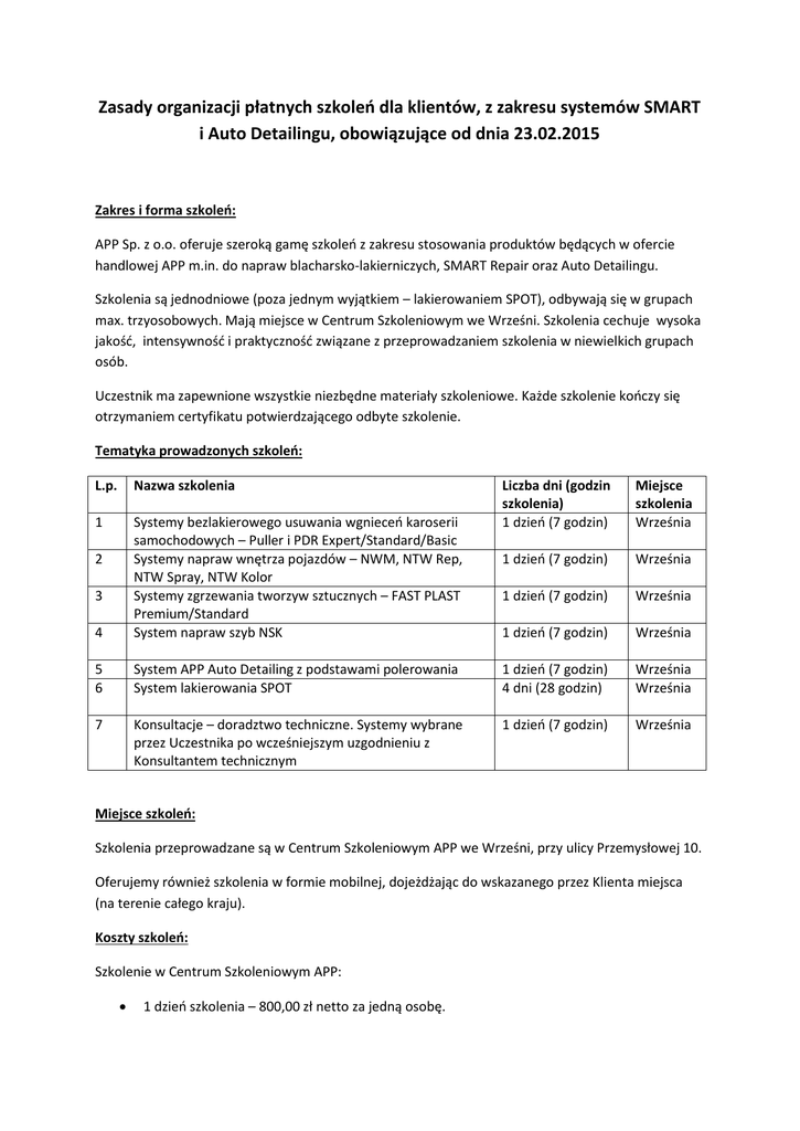 Zasady organizacji płatnych szkoleń dla klientów, z zakresu systemów SMART i Auto Detailingu, obowiązujące od dnia 23.02.2015 Zakres i forma szkoleń: APP Sp. z o.o. oferuje szeroką gamę szkoleń z zakresu stosowania produktów będących w ofercie handlowej APP m.in. do napraw blacharsko-lakierniczych, SMART Repair oraz Auto Detailingu. Szkolenia są jednodniowe (poza jednym wyjątkiem – lakierowaniem SPOT), odbywają się w grupach max. trzyosobowych. Mają miejsce w Centrum Szkoleniowym we Wrześni. Szkolenia cechuje wysoka jakość, intensywność i praktyczność związane z przeprowadzaniem szkolenia w niewielkich grupach osób. Uczestnik ma zapewnione wszystkie niezbędne materiały szkoleniowe. Każde szkolenie kończy się otrzymaniem certyfikatu potwierdzającego odbyte szkolenie. Tematyka prowadzonych szkoleń: L.p. Nazwa szkolenia 1 4 Systemy bezlakierowego usuwania wgnieceń karoserii samochodowych – Puller i PDR Expert/Standard/Basic Systemy napraw wnętrza pojazdów – NWM, NTW Rep, NTW Spray, NTW Kolor Systemy zgrzewania tworzyw sztucznych – FAST PLAST Premium/Standard System napraw szyb NSK 5 6 7 2 3 Liczba dni (godzin szkolenia) 1 dzień (7 godzin) Miejsce szkolenia Września 1 dzień (7 godzin) Września 1 dzień (7 godzin) Września 1 dzień (7 godzin) Września System APP Auto Detailing z podstawami polerowania System lakierowania SPOT 1 dzień (7 godzin) 4 dni (28 godzin) Września Września Konsultacje – doradztwo techniczne. Systemy wybrane przez Uczestnika po wcześniejszym uzgodnieniu z Konsultantem technicznym 1 dzień (7 godzin) Września Miejsce szkoleń: Szkolenia przeprowadzane są w Centrum Szkoleniowym APP we Wrześni, przy ulicy Przemysłowej 10. Oferujemy również szkolenia w formie mobilnej, dojeżdżając do wskazanego przez Klienta miejsca (na terenie całego kraju). Koszty szkoleń: Szkolenie w Centrum Szkoleniowym APP: 1 dzień szkolenia – 800,00 zł netto za jedną osobę. Jeżeli z tej samej firmy (jedna faktura) przyjedzie więcej osób, to odpłatność wygląda następująco: 2 osoby – 1000,00 zł netto, 3 osoby – 1200,00 zł netto, większa liczba Uczestników z jednej firmy – kwota negocjowana. Szkolenia „u Klienta”: 1 dzień szkolenia, dowolna liczba Uczestników – 1200,00 netto (koszt dojazdu i zakwaterowania Technika po stronie APP). Podane ceny to ceny ostateczne i nie podlegające rabatowaniu. Warunki uczestnictwa w szkoleniach płatnych: 1. Osoba zainteresowana uczestnictwem (Zgłaszający) wypełnia Formularz zgłoszeniowy. Formularz ten, podpisany i podstemplowany, należy wysłać faxem na numer 061 4370021 lub zeskanować i przesłać na adres [email protected] 2. Po zebraniu grupy uczestników, Konsultant techniczny kontaktuje się ze Zgłaszającym bezpośrednio, korzystając z informacji zawartych w Formularzu zgłoszeniowym. Uzgadnia termin szkolenia odpowiadający wszystkim zainteresowanym. 3. Po uzgodnieniu terminu szkolenia, Zgłaszający otrzymuje mailowo od Konsultanta technicznego Potwierdzenie uczestnictwa w szkoleniu wraz z Ofertą proforma (dawniej Faktura proforma). 4. Po otrzymaniu Potwierdzenia uczestnictwa w szkoleniu ale przed terminem szkolenia, Zgłaszający zobowiązany jest zapłacić całą kwotę za szkolenie przelewem na rachunek bankowy, wskazany w Ofercie proforma. 5. Po wpłynięciu kwoty na konto APP, wystawiana jest faktura dla Klienta i przesyłana do niego pocztą na adres wskazany w Formularzu zgłoszenia uczestnictwa. 6. Brak pisemnego zgłoszenia rezygnacji do dnia rozpoczęcia szkolenia, a po otrzymaniu Potwierdzenia uczestnictwa w szkoleniu, oznacza obciążenie Zgłaszającego pełnymi kosztami uczestnictwa. W przypadku rezygnacji zgłoszonej przed rozpoczęciem szkolenia, ale po otrzymaniu Potwierdzenia uczestnictwa, Zgłaszający obciążony zostanie kosztami w wysokości 50% odpłatności za szkolenie. Rezygnacja z uczestnictwa zgłoszona wcześniej nie powoduje żadnych kosztów po stronie Zgłaszającego. 7. Potwierdzenie dokonania wpłaty należności za szkolenie należy okazać w dniu szkolenia jego prowadzącemu.