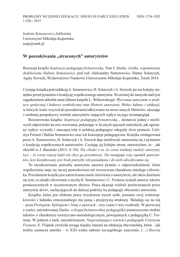 PROBLEMY WCZESNEJ EDUKACJI / ISSUES IN EARLY EDUCATION 1 (28) / 2015 ISSN 1734-1582 Izabela Symonowicz-Jabłońska Uniwersytet Mikołaja Kopernika [email protected] W poszukiwaniu „straconych” autorytetów Recenzja książki Inspiracje pedagogią freinetowską. Tom I: Studia, źródła, wspomnienia dedykowane Halinie Semenowicz, pod red. Aleksandry Semenowicz, Hanny Solarczyk, Agaty Szwech, Wydawnictwo Naukowe Uniwersytetu Mikołaja Kopernika, Toruń 2014. Czytając książkę pod redakcją A. Semenowicz, H. Solarczyk i A. Szwech, po raz kolejny stanęłam przed pytaniem o kondycję współczesnego autorytetu. Wcześniej do namysłu nad tym zagadnieniem skłoniła mnie lektura książek L. Witkowskiego: Wyzwania autorytetu w praktyce społecznej i kulturze symbolicznej oraz Historie autorytetu. Wobec kultury i edukacji, w których Autor wzywał do poszukiwania/odkrywania na nowo starych Mistrzów, ukazując z osobistej perspektywy wielość autorytetów mających wpływ na jego światopogląd. Recenzowana książka: Inspiracje pedagogią freinetowską… dostarcza jednej z możliwych odpowiedzi na owe wezwania, pokazując w licznych ujęciach autorskich, jak ogromny wpływ wywarły i znaczącą rolę w polskiej pedagogice odegrały dwie postacie: Celestyn Freinet i Halina Semenowicz oraz ich koncepcje pedagogiczne. Książka zredagowana przez A. Semenowicz, H. Solarczyk i A. Szwech daje możliwość zmierzenia się z pytaniem o kondycję współczesnych autorytetów. Czytając jej kolejne strony zauważyłam, że – jak określił to J. Barański (2013: 4–10): Nie chodzi o to, że coraz trudniej znaleźć autorytet, lecz – że coraz więcej ludzi nie chce go poszukiwać. Nie następuje więc upadek autorytetów, lecz kształtowany jest brak potrzeby ich posiadania i do nich odwoływania się. To nieodczuwanie potrzeby autorytetu nasuwa pytanie o odpowiedzialność, która współcześnie staje się raczej pustosłowiem niż tworzywem charakteru młodego człowieka. Przesłaniem książki jest zatem konieczność mówienia o autorytecie, ale także dzielenie się tym, co dzięki obcowaniu z myślą H. Semenowicz i C. Freineta zyskali autorzy teksów pomieszczonych w recenzowanym zbiorze. Praca ukazuje wielość pootwieranych przez autorytety drzwi, zachęcających do dalszej podróży ku pedagogii obecności autorytetu. Książka, która jest efektem pracy trzydziestu trzech osób, pomimo swej wielowątkowości i ładunku emocjonalnego ma jasną i przejrzystą strukturę. Składają się na nią – poza Prologiem, Epilogiem i Notą o autorach – trzy części i trzy rozdziały. W pierwszej z części, zatytułowanej Studia: w kręgu freinetowskiej pedagogi(k)i pomieszczono siedem tekstów o charakterze teoretyczno-metodologicznym, powiązanych z pedagogiką C. Freineta. W jednym z nich, zatytułowanym: Nieprzemijające wartości pedagogiki Celestyna Freineta, E. Filipiak zwróciła uwagę między innymi na edukację obywatelską, która – jak trafnie zaznacza autorka – w XXI wieku nabiera szczególnego znaczenia. (…) Rozwój 164 Izabela Symonowicz-Jabłońska technologii i sieci informatycznych z jednej strony zwielokrotnia kanały komunikowania, z drugiej pogłębia tendencję do wycofywania się i izolowania. Istnieje potrzeba prawdziwego komunikowania, a taką oferuje Nowoczesna Szkoła Technik Freineta. (…) w której to charakterystyczne jest tworzenie środowiska sprzyjającego pytaniu, dyskutowaniu, argumentowaniu. (s. 31–32) Dzieci w jej przestrzeni tej doświadczają prawdziwego zastosowania w praktyce zasad funkcjonujących w społeczeństwie (s. 33). Z kolei Z. Aleksander i W. Frankiewicz w tekście Socjolingwistyczne i psychopedagogiczne interpretacje wartości freinetowkiej pedagogiki w edukacji wczesnoszkolnej i akademickiej, ukazują w metodycznym zamyśle swobodnego tekstu C. Freineta wagę kształcenia języka pisanego od najwcześniejszych lat szkoły podstawowej do okresu studiów, podkreślając, że wyrabia to umiejętności krytycznego oglądu świata a nie ślepego powielania jedynych i słusznych idei. W następnym w artykule, napisanym przez K. Kossak-Główczewskiego, odnaleźć można potwierdzenie, że w koncepcji C. Freineta dostrzegamy wyraźny opór i niezgodę na narzucane sensy. Zaś o zgodności edukacji regionalnej z pedagogią C. Freineta świadczy jej zaangażowanie w zmianę (s. 78). Owo zaangażowanie w zmianę odnajdujemy również w tekście Z. Napiórkowskiej: Budowanie demokracji w edukacji. Autorka wskazuje w nim na zachowujące aktualność reguły demokratycznego wychowania, których współczesna polska szkoła nie dopuszcza do głosu z taką mocą, z jaką powinna, a przecież samorządności nie nabywa się z wiekiem, nic nie robiąc w tym kierunku, tylko ciężką acz pełną przygód pracą, ku wolności i odpowiedzialności. Nie osiągnie się tego, jeżeli jednostki nie zdobędą doń stosownej motywacji, o czym przypomina M. Muszyńska w swoim tekście Wprowadzenie do czytania metaforycznego języka pedagogiki Freineta. Autorka podkreśla, że francuski pedagog rozwija w przestrzeni edukacyjnej tę intuicyjnie wywiedzioną prawdę i obmyśla techniki, dzięki którym możliwe jest podsycanie ciekawości świata i uświadamianie sensu najprostszego nawet działania (s. 95–96). Warunki do tego stwarza unikanie jednoznacznych odpowiedzi na pytania o „sensy świata”, ale też podołanie wyzwaniu, jakie stawia poetycki język C. Freineta. Jego metafory – jak pisze dalej autorka – można przypuszczać, mogą uruchomić twórcze myślenie pedagogiczne współczesnych nauczycieli, a poprzez to twórczość samych dzieci, którym potrzebny jest nie tylko chleb, ale i róże (s. 115). Dzięki metaforycznemu oglądowi świata człowiek – czy to dziecko, dorosły, czy starzec – nie staje się ślepym wyznawcą jedynej słusznej edukacji systemowej, lecz jest gotów do wykraczania – jak czytamy w Tropach epizodó