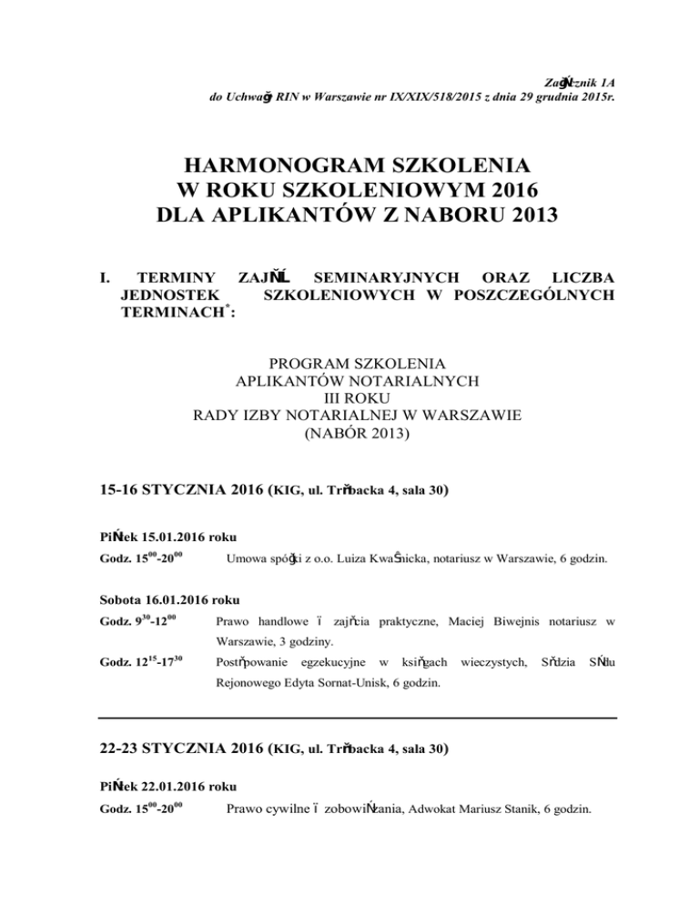 Załącznik 1A do Uchwały RIN w Warszawie nr IX/XIX/518/2015 z dnia 29 grudnia 2015r. HARMONOGRAM SZKOLENIA W ROKU SZKOLENIOWYM 2016 DLA APLIKANTÓW Z NABORU 2013 I. TERMINY ZAJĘĆ SEMINARYJNYCH ORAZ LICZBA JEDNOSTEK SZKOLENIOWYCH W POSZCZEGÓLNYCH * TERMINACH : PROGRAM SZKOLENIA APLIKANTÓW NOTARIALNYCH III ROKU RADY IZBY NOTARIALNEJ W WARSZAWIE (NABÓR 2013) 15-16 STYCZNIA 2016 (KIG, ul. Trębacka 4, sala 30) Piątek 15.01.2016 roku Godz. 1500-2000 Umowa spółki z o.o. Luiza Kwaśnicka, notariusz w Warszawie, 6 godzin. Sobota 16.01.2016 roku Godz. 930-1200 Prawo handlowe – zajęcia praktyczne, Maciej Biwejnis notariusz w Warszawie, 3 godziny. 15 Godz. 12 -17 30 Postępowanie egzekucyjne w księgach wieczystych, Sędzia Sądu Rejonowego Edyta Sornat-Unisk, 6 godzin. 22-23 STYCZNIA 2016 (KIG, ul. Trębacka 4, sala 30) Piątek 22.01.2016 roku Godz. 1500-2000 Prawo cywilne – zobowiązania, Adwokat Mariusz Stanik, 6 godzin. Sobota 23.01.2016 roku Godz. 930-1200 15 Godz. 12 -17 30 Inne organy ochrony prawnej, dr Jacek Zaleśny, 3 godziny. Rygory egzekucyjne, Adwokat Aleksander Grot, 6 godzin. ______________________________________________________________ __ 29-30 STYCZNIA 2016 (KIG, ul. Trębacka 4, sala 30) Piątek 29.01.2016 roku Godz. 1500-2000 Statut spółki akcyjnej, Luiza Kwaśnicka notariusz w Warszawie, 6 godzin. Sobota 30.01.2016 roku Godz. 930-1200 Księgi dawne, Sędzia Sądu Rejonowego Edyta Sornat-Unisk, 3 godziny. Godz. 1215-1730 Spółka akcyjna a spółka z o.o., Luiza Kwaśnicka notariusz w Warszawie, 6 godzin. 12-13 LUTEGO 2016 (KIG, ul. Trębacka 4, sala 30) Piątek 12.02.2016 roku Godz. 1500-2000 Rozwiązywanie kazusu z egzaminu notarialnego, Ewa Serafin notariusz w Warszawie, 6 godzin. Sobota 13.02.2016 roku Godz. 930-1445 Grunty warszawskie, Czesława Kołcun notariusz w Warszawie, 6 godzin. Godz. 1500-1730 Inne organy ochrony prawnej, dr Jacek Zaleśny, 3 godziny. 19-20 LUTEGO 2016 (KIG, ul. Trębacka 4, sala 30) Piątek 19.02.2016 roku Godz. 1500-2000 Gospodarka nieruchomościami – podziały, Marek Watrakiewicz notariusz w Warszawie, 6 godzin. Sobota 20.02.2016 roku Godz. 930-1445 Pierwokupy, Grażyna Socha notariusz w Warszawie, 6 godzin. _______________________________________________________________________________ 26-27 LUTEGO 2016 (KIG, ul. Trębacka 4, sala 30) Piątek 26.02.2016 roku Godz. 1500-2030 Prawo rodzinne – małżeńskie ustroje majątkowe, Hanna ZbrzeżnaCąkała notariusz w Warszawie, 6 godzin Sobota 27.02.2016 roku Godz. 930-1200 Prawo o notariacie – poświadczenia - Zenon Jabłoński – emerytowany notariusz, 3 godziny. 15 Godz. 12 -14 45 Prawo cywilne – spadki (testamenty) – Alicja Janowska – emerytowany notariusz , 3 godziny. 11-12 MARCA 2016 (KIG, ul. Trębacka 4, sala 30) Piątek 11.03.2016 roku Godz. 1500-2000 Opinia prawna, adwokat Agata Rewerska, 6 godzin. Sobota 12.03.2016 roku Godz. 930-1445 Prawo spółdzielcze, Wojciech Fortuński notariusz w Piasecznie, 6 godzin. 18-19 MARCA 2016 (KIG, ul. Trębacka 4, sala 30) Piątek 18.03.2016 roku Godz. 1500-2000 - Prawo cywilne, zobowiązania, umowy nienazwane – Mariusz Stanik – adwokat – 6 godzin. Sobota 19.03.2016 roku Godz. 930-1200 - Prawo o notariacie – poświadczenia, Zenon Jabłoński emerytowany notariusz, 3 godziny. 15 Godz. 12 -14 45 - Prawo cywilne – spadki (testamenty), Alicja Janowska emerytowany notariusz , 3 godziny. 1-2 KWIETNIA 2016 (KIG, ul. Trębacka 4, sala 30) Piątek 01.04.2016 roku Godz. 1500-2000 - Księgi wieczyste – elektroniczna księga wieczysta, Piotr Siciński, notariusz w Warszawie 6 godzin. Sobota 02.04.2016 roku Godz. 930-1445 - Prawo rzeczowe – ograniczone prawa rzeczowe, Ewa Serafin notariusz w Warszawie – 6 godzin. 15-16 KWIETNIA 2016 (KIG, ul. Trębacka 4, sala 30) Piątek 15.04.2016 roku Godz. 1500-200 Cudzoziemcy – nabywanie nieruchomości, Grażyna Socha notariusz w Warszawie, 6 godziny. Sobota 16.04.2016 roku Godz. 930-1445 Prawo spółdzielcze, Wojciech Fortuński notariusz w Piasecznie, 6 godzin. 22-23 KWIETNIA 2016 (KIG, ul. Trębacka 4, sala 30) Piątek 22.04.2016 roku Godz. 1500-2000 Prawo europejskie i prawo prywatne międzynarodowe, dr hab. Paweł Czubik, notariusz w Krakowie, 6 godzin. Sobota.23.04.2016 Godz. 1100-1500 Prawo cywilne – zobowiązania: umowa renty i dożywocia – dr hab. Adam Bieranowski, notariusz w Olsztynie – 6 godzin . 3-4 CZERWCA 2016 r. (KIG, ul. Trębacka 4, sala 30) Piątek 03.06.2016 roku Godz. 1500-2000 Postępowanie cywilne, Magdalena Archutowska notariusz w Warszawie, 6 godzin. Godz. 930-1445 Podatek od spadków i darowizn – notariusz jako płatnik, Kinga Nałęcz notariusz w Warszawie, 6 godzin. 10-11 CZERWCA 2016 r. (KIG, ul. Trębacka 4, sala 30) Piątek 10.06.2016 roku Godz. 1500-2000 Umowa deweloperska, Robert Giler, notariusz w Warszawie, 6 godzin. Sobota 11.06.2016 roku Godz. 930-1200 Prawo handlowe – spółki kapitałowe a spółki osobowe, Luiza Kwaśnicka notariusz w Warszawie, 3 godziny. 15 Godz. 12 -17 30 Kościelne osoby prawne – Joanna Greguła, notariusz w Krakowie – 6 godzin. 24-25 CZERWCA 2016 r. (KIG, ul. Trębacka 4, sala 30) Piątek 24.06.2016 roku Godz. 1500-2000 Postępowanie egzekucyjne – Paweł Gintowt, komornik, 6 godzin. Sobota 25.06.2016 roku Godz. 930-1200 Etyka – w zawodzie prawnika – zajęcia z sędzią sądu okręgowego w Warszawie, 3 godziny. Godz. 1215-1730 Prawo rolne w ujęciu historycznym – aspekty notarialne, Marek Sawicki, notariusz w Olecku – 6 godzin. 7-8 PAŹDZIERNIKA 2016 (KIG, ul. Trębacka 4, sala 30) Piątek 07.10.2016 roku Godz. 1500-2000 Prawo cywilne – orzecznictwo SN , Wojciech Fortuński notariusz w Piasecznie, 6 godzin. Sobota 08.10.2016 roku Godz. 930-1200 Prawo cywilne – spadki, umowy o spadek, Alicja Janowska emerytowany notariusz, 3 godziny. Godz. 1215-1730 Postępowanie wieczystoksięgowe, sędzia Sądu Rejonowego Edyta SornatUnisk, 6 godzin. 21-22 PAŹDZIERNIKA 2016 (KIG, ul. Trębacka 4, sala 30) Piąte