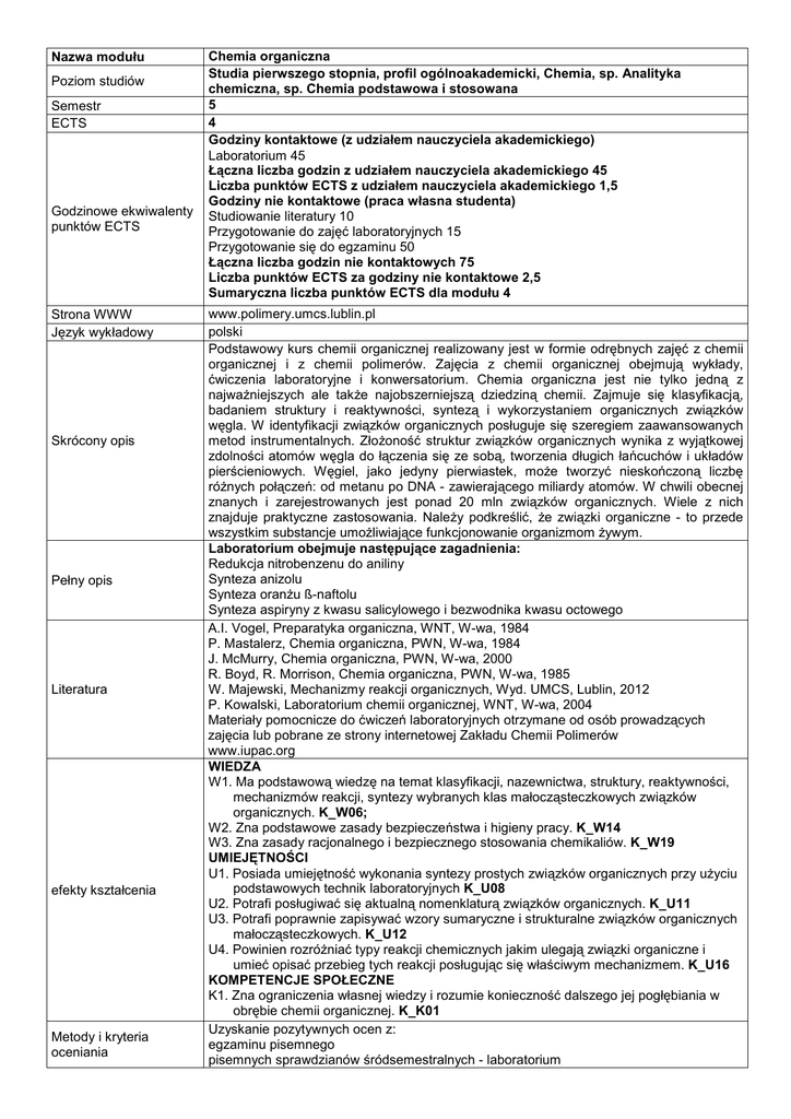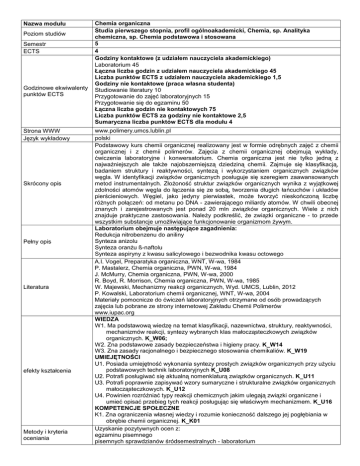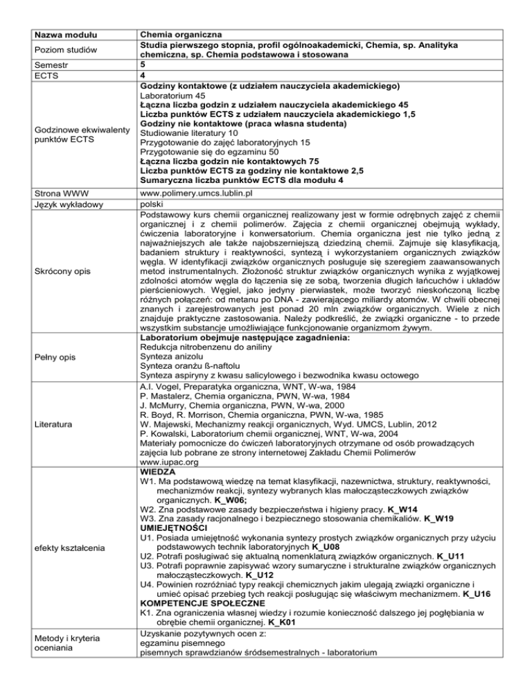 Nazwa modułu Poziom studiów Semestr ECTS Godzinowe ekwiwalenty punktów ECTS Strona WWW Język wykładowy Skrócony opis Pełny opis Literatura efekty kształcenia Metody i kryteria oceniania Chemia organiczna Studia pierwszego stopnia, profil ogólnoakademicki, Chemia, sp. Analityka chemiczna, sp. Chemia podstawowa i stosowana 5 4 Godziny kontaktowe (z udziałem nauczyciela akademickiego) Laboratorium 45 Łączna liczba godzin z udziałem nauczyciela akademickiego 45 Liczba punktów ECTS z udziałem nauczyciela akademickiego 1,5 Godziny nie kontaktowe (praca własna studenta) Studiowanie literatury 10 Przygotowanie do zajęć laboratoryjnych 15 Przygotowanie się do egzaminu 50 Łączna liczba godzin nie kontaktowych 75 Liczba punktów ECTS za godziny nie kontaktowe 2,5 Sumaryczna liczba punktów ECTS dla modułu 4 www.polimery.umcs.lublin.pl polski Podstawowy kurs chemii organicznej realizowany jest w formie odrębnych zajęć z chemii organicznej i z chemii polimerów. Zajęcia z chemii organicznej obejmują wykłady, ćwiczenia laboratoryjne i konwersatorium. Chemia organiczna jest nie tylko jedną z najważniejszych ale także najobszerniejszą dziedziną chemii. Zajmuje się klasyfikacją, badaniem struktury i reaktywności, syntezą i wykorzystaniem organicznych związków węgla. W identyfikacji związków organicznych posługuje się szeregiem zaawansowanych metod instrumentalnych. Złożoność struktur związków organicznych wynika z wyjątkowej zdolności atomów węgla do łączenia się ze sobą, tworzenia długich łańcuchów i układów pierścieniowych. Węgiel, jako jedyny pierwiastek, może tworzyć nieskończoną liczbę różnych połączeń: od metanu po DNA - zawierającego miliardy atomów. W chwili obecnej znanych i zarejestrowanych jest ponad 20 mln związków organicznych. Wiele z nich znajduje praktyczne zastosowania. Należy podkreślić, że związki organiczne - to przede wszystkim substancje umożliwiające funkcjonowanie organizmom żywym. Laboratorium obejmuje następujące zagadnienia: Redukcja nitrobenzenu do aniliny Synteza anizolu Synteza oranżu ß-naftolu Synteza aspiryny z kwasu salicylowego i bezwodnika kwasu octowego A.I. Vogel, Preparatyka organiczna, WNT, W-wa, 1984 P. Mastalerz, Chemia organiczna, PWN, W-wa, 1984 J. McMurry, Chemia organiczna, PWN, W-wa, 2000 R. Boyd, R. Morrison, Chemia organiczna, PWN, W-wa, 1985 W. Majewski, Mechanizmy reakcji organicznych, Wyd. UMCS, Lublin, 2012 P. Kowalski, Laboratorium chemii organicznej, WNT, W-wa, 2004 Materiały pomocnicze do ćwiczeń laboratoryjnych otrzymane od osób prowadzących zajęcia lub pobrane ze strony internetowej Zakładu Chemii Polimerów www.iupac.org WIEDZA W1. Ma podstawową wiedzę na temat klasyfikacji, nazewnictwa, struktury, reaktywności, mechanizmów reakcji, syntezy wybranych klas małocząsteczkowych związków organicznych. K_W06; W2. Zna podstawowe zasady bezpieczeństwa i higieny pracy. K_W14 W3. Zna zasady racjonalnego i bezpiecznego stosowania chemikaliów. K_W19 UMIEJĘTNOŚCI U1. Posiada umiejętność wykonania syntezy prostych związków organicznych przy użyciu podstawowych technik laboratoryjnych K_U08 U2. Potrafi posługiwać się aktualną nomenklaturą związków organicznych. K_U11 U3. Potrafi poprawnie zapisywać wzory sumaryczne i strukturalne związków organicznych małocząsteczkowych. K_U12 U4. Powinien rozróżniać typy reakcji chemicznych jakim ulegają związki organiczne i umieć opisać przebieg tych reakcji posługując się właściwym mechanizmem. K_U16 KOMPETENCJE SPOŁECZNE K1. Zna ograniczenia własnej wiedzy i rozumie konieczność dalszego jej pogłębiania w obrębie chemii organicznej. K_K01 Uzyskanie pozytywnych ocen z: egzaminu pisemnego pisemnych sprawdzianów śródsemestralnych - laboratorium Metody dydaktyczne Sposoby sprawdzania efektów kształcenia Wymagania wstępne Uwagi Typ zajęć Osoby prowadzące Liczba godzin Literatura Efekty kształcenia sprawozdań z wykonywanych preparatów - laboratorium Ćwiczenia laboratoryjne W1, zajęcia laboratoryjne – pisemne sprawdziany śródsemestralne; W2, zajęcia laboratoryjne – sprawozdania z wykonywanych preparatów W3, zajęcia laboratoryjne – sprawozdania z wykonywanych preparatów U1, zajęcia laboratoryjne – sprawozdania z wykonywanych preparatów U2, zajęcia laboratoryjne – pisemne sprawdziany śródsemestralne; U3, zajęcia laboratoryjne – pisemne sprawdziany śródsemestralne; U4, zajęcia laboratoryjne – pisemne sprawdziany śródsemestralne; K1, zajęcia laboratoryjne – pisemne sprawdziany śródsemestralne; Podstawowa wiedza z chemii ogólnej i chemii fizycznej Laboratorium dr Marta Grochowicz, dr Władysław Majewski, dr Maciej Podgórski, dr Beata Podkościelna, dr Andrzej Puszka, dr Magdalena Rogulska, dr Magdalena Sobiesiak, dr Łukasz Szajnecki 45 A.I. Vogel, Preparatyka organiczna, WNT, W-wa, 1984 P. Mastalerz, Chemia organiczna, PWN, W-wa, 1984 J. McMurry, Chemia organiczna, PWN, W-wa, 2000 R. Boyd, R. Morrison, Chemia organiczna, PWN, W-wa, 1985 W. Majewski, Mechanizmy reakcji organicznych, Wyd. UMCS, Lublin, 2012 P. Kowalski, Laboratorium chemii organicznej, WNT, W-wa, 2004 Materiały pomocnicze do ćwiczeń laboratoryjnych otrzymane od osób prowadzących zajęcia lub pobrane ze strony internetowej Zakładu Chemii Polimerów www.iupac.org WIEDZA W1. Ma podstawową wiedzę na temat klasyfikacji, nazewnictwa, struktury, reaktywności, mechanizmów reakcji, syntezy i roli w funkcjonowaniu organizmów żywych wybranych klas związków organicznych. K_W06; W2. Zna podstawowe zasady bezpieczeństwa i higieny pracy. K_W14 W3. Zna zasady racjonalnego i bezpiecznego stosowania chemikaliów. K_W19 UMIEJĘTNOŚCI U1. Posiada umiejętność wykonywania podstawowych czynności w laboratorium chemicznym. K_U08 U2. Potrafi posługiwać się aktualnym nazewnictwem związków organicznych. K_U11 U3. Potrafi poprawnie zapisywać wzory sumaryczne i strukturalne zw