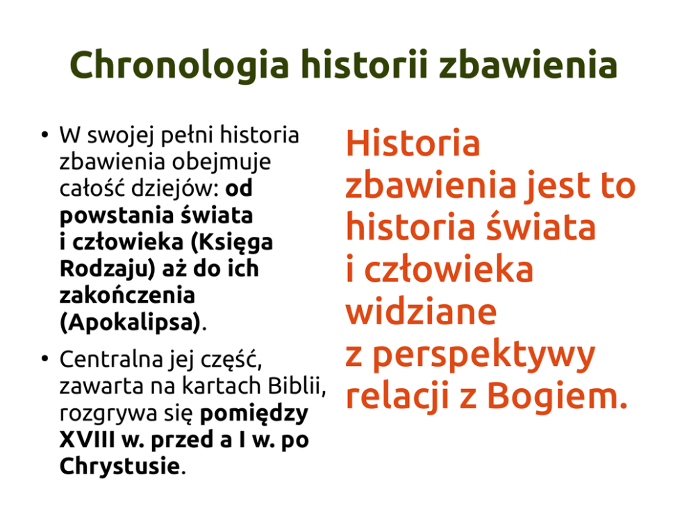 Chronologia historii zbawienia ● ● W swojej pełni historia zbawienia obejmuje całość dziejów: od powstania świata i człowieka (Księga Rodzaju) aż do ich zakończenia (Apokalipsa). Centralna jej część, zawarta na kartach Biblii, rozgrywa się pomiędzy XVIII w. przed a I w. po Chrystusie. Historia zbawienia jest to historia świata i człowieka widziane z perspektywy relacji z Bogiem. Geografia historii zbawienia ● ● W swojej pełni historia zbawienia obejmuje cały świat, a nawet cały wszechświat. Centralna jej część, zawarta na kartach Biblii, rozgrywa się natomiast na terenie Egiptu, Palestyny i Mezopotamii. Tereny biblijne Treść historii zbawienia ● ● ● ● Całej treści historii zbawienia nie sposób spisać (J 21,25). Najważniejsze wątki tej historii są natomiast zawarte w Biblii. Pewnym źródłem są również apokryfy. Pomocą w poznaniu historii zbawienia jest archeologia biblijna. Jak czytać historię zbawienia? Ma ona przede wszystkim przesłanie religijne. Mówi więc o tym, w jaki sposób Bóg przenika całe dzieje człowieka, jak interweniuje w jego historię i jaki ma plan względem człowieka. Na drugim miejscu jest w niej zawarte przesłanie moralne. Mówi więc, jak człowiek powinien postępować i żyć, aby mógł Boga spotkać (skoro ten Bóg przenika jego dzieje) i doświadczyć Jego błogosławieństwa. Te przesłania historii zbawienia są oczywiście oparte na jakichś wydarzeniach historycznych. Historia jest tu jednak tylko kanwą dla pouczenia religijnego i moralnego. Stąd fakty historyczne traktowane są wybiórczo i nieprecyzyjnie. Nie można zatem biblijnej historii zbawienia traktować jak podręcznika do historii.