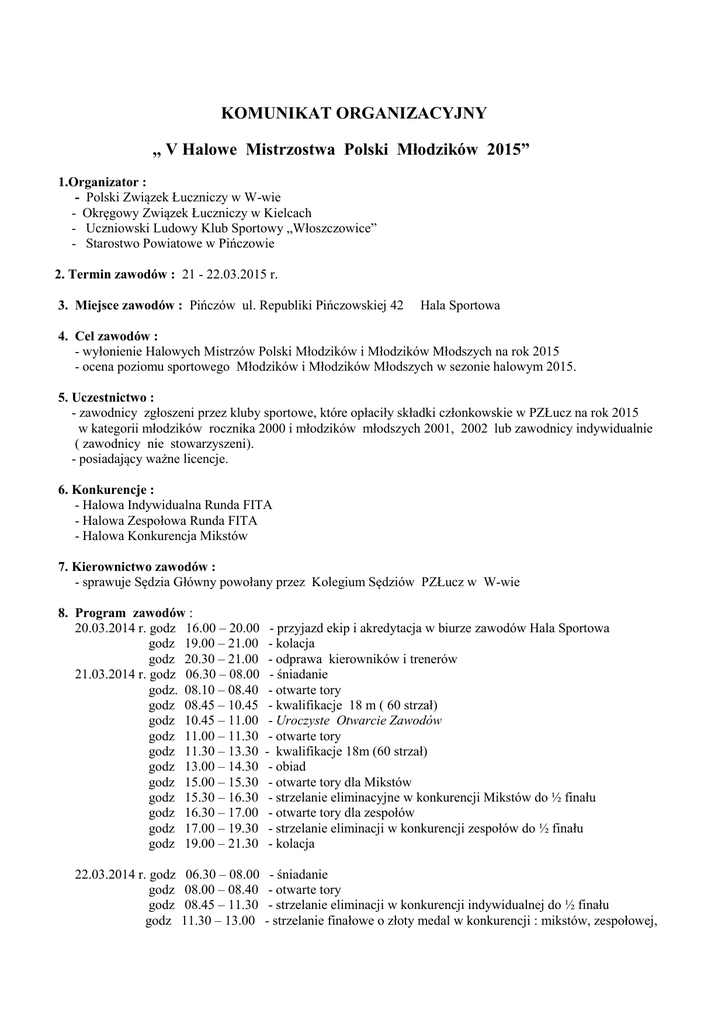 KOMUNIKAT ORGANIZACYJNY ,, V Halowe Mistrzostwa Polski Młodzików 2015” 1.Organizator : - Polski Związek Łuczniczy w W-wie - Okręgowy Związek Łuczniczy w Kielcach - Uczniowski Ludowy Klub Sportowy „Włoszczowice” - Starostwo Powiatowe w Pińczowie 2. Termin zawodów : 21 - 22.03.2015 r. 3. Miejsce zawodów : Pińczów ul. Republiki Pińczowskiej 42 Hala Sportowa 4. Cel zawodów : - wyłonienie Halowych Mistrzów Polski Młodzików i Młodzików Młodszych na rok 2015 - ocena poziomu sportowego Młodzików i Młodzików Młodszych w sezonie halowym 2015. 5. Uczestnictwo : - zawodnicy zgłoszeni przez kluby sportowe, które opłaciły składki członkowskie w PZŁucz na rok 2015 w kategorii młodzików rocznika 2000 i młodzików młodszych 2001, 2002 lub zawodnicy indywidualnie ( zawodnicy nie stowarzyszeni). - posiadający ważne licencje. 6. Konkurencje : - Halowa Indywidualna Runda FITA - Halowa Zespołowa Runda FITA - Halowa Konkurencja Mikstów 7. Kierownictwo zawodów : - sprawuje Sędzia Główny powołany przez Kolegium Sędziów PZŁucz w W-wie 8. Program zawodów : 20.03.2014 r. godz 16.00 – 20.00 godz 19.00 – 21.00 godz 20.30 – 21.00 21.03.2014 r. godz 06.30 – 08.00 godz. 08.10 – 08.40 godz 08.45 – 10.45 godz 10.45 – 11.00 godz 11.00 – 11.30 godz 11.30 – 13.30 godz 13.00 – 14.30 godz 15.00 – 15.30 godz 15.30 – 16.30 godz 16.30 – 17.00 godz 17.00 – 19.30 godz 19.00 – 21.30 22.03.2014 r. godz godz godz godz 06.30 – 08.00 08.00 – 08.40 08.45 – 11.30 11.30 – 13.00 - przyjazd ekip i akredytacja w biurze zawodów Hala Sportowa - kolacja - odprawa kierowników i trenerów - śniadanie - otwarte tory - kwalifikacje 18 m ( 60 strzał) - Uroczyste Otwarcie Zawodów - otwarte tory - kwalifikacje 18m (60 strzał) - obiad - otwarte tory dla Mikstów - strzelanie eliminacyjne w konkurencji Mikstów do ½ finału - otwarte tory dla zespołów - strzelanie eliminacji w konkurencji zespołów do ½ finału - kolacja - śniadanie - otwarte tory - strzelanie eliminacji w konkurencji indywidualnej do ½ finału - strzelanie finałowe o złoty medal w konkurencji : mikstów, zespołowej, indywidualnej w kategorii łuków klasycznych . godz 12.30 – 14.30 - obiad godz 14.30 - ceremonia dekoracji zwycięzców i zakończenie Mistrzostw Polski Młodzików i Młodzików Młodszych.. 9. Zgłoszenia : - Zgłoszenia do zawodów i zamówienia na noclegi oraz wyżywienie prosimy przesłać w terminie do dnia 13.03.2015 r. – poprzez aplikację AZZ na stronie www.archery.pl 10. Klasyfikacja : - oddzielnie dla kobiet i mężczyzn w kategorii młodzików i młodzików młodszych w konkurencji indywidualnej , zespołów i mikstów. 11.Tytuły i wyróżnienia : - zwycięzcy w klasyfikacji HIR FITA , HZR FITA , i Miksty zawodnicy otrzymują złote medale i tytuły Halowych Mistrzów Polski Młodzików i Młodzików Młodszych na rok 2015. - za m-ca II w klasyfikacji HIR FITA , HZR FITA i Miksty zawodnicy otrzymują srebrne medale i tytuł I Halowego V-ce Mistrza Polski Młodzików i Młodzików Młodszych na rok 2015 . - za m-ca III i IV w klasyfikacji HIR FITA , HZR FITA i MIKSTY zawodnicy otrzymują brązowe medale oraz zostaną im nadane tytuły II Halowego V-ce Mistrza Polski Młodzików i Młodzików Młodszych na rok 2015 - w konkurencji zespołowej drużyna otrzymuje 4 medale , jeżeli 4 zawodników startowało w zawodach w drużynie oraz trenerzy klubowi. - zawodnicy za miejsca 1 -4 otrzymują upominki ufundowane przez organizatora. - za miejsca I – VIII zawodnicy otrzymują dyplomy. 12. Sprawy finansowe : - opłata startowa wynosi 30,- zł od 1-go zawodnika z licencją a zawodnicy nie stowarzyszeni 100,- zł od 1-go zawodnika płatne gotówką u organizatora w dniu 20.03.2015 w biurze zawodów – Hala Sportowa - koszt zakwaterowania 1 osobodnia (nocleg + wyżywienie) wynosi od 75.00 zł do 80.00 zł w zależności od miejsca zakwaterowania ( pokoje 1,2,3,4 osobowe) płatne u organizatora w dniu 20.03.2015 tylko gotówką. 13. W czasie zawodów obowiązuje Regulamin Halowych Mistrzostw Polski PZŁucz : - prawo interpretacji regulaminu na zawodach przysługuje pełnomocnikowi Zarządowi PZŁucz a w sprawach organizacyjno-porządkowych bezpośredniemu organizatorowi. - protesty – zgodnie z Regulaminem Łucznictwa 14. Postanowienia końcowe : - organizator nie ponosi odpowiedzialności za ubezpieczenie zawodników w czasie trwania imprezy i za rzeczy pozostawione na obiekcie sportowym . - w czasie zawodów obowiązuje ubiór sportowy- klubowy lub biały zgodnie z regulaminem łucznictwa . - na obiekcie sportowym mogą przebywać tylko uczestnicy imprezy a na widowni pozostali. - wejście zawodników i opiekunów na halę sportową tylko w obuwiu sportowym /halowym-zmiennym/ w innym obuwiu uczestnicy zawodów nie będą wpuszczeni. - na hali łuczniczej zabrania się spożywania alkoholu i palenia tytoniu . - obowiązuje regulamin Łucznictwa PZŁucz . - nie ma możliwości strzelania poza konkursem. - w uroczystej ceremonii wręczenia medali i wyróżnień zawodnicy uczestniczą tylko w ubiorach sportowych. Organizator zastrzega sobie możliwość zmiany w programie zawodów w zależności od ilości zgłoszonych zawodników . ORGANIZATOR BEZPOŚREDNI