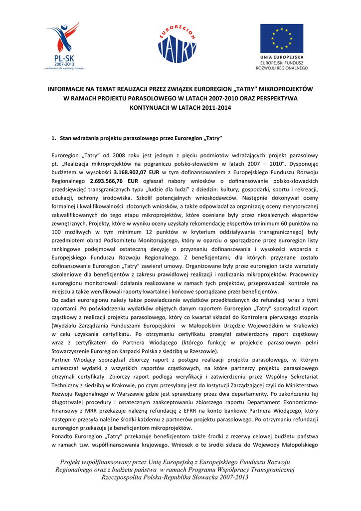 INFORMACJE NA TEMAT REALIZACJI PRZEZ ZWIĄZEK EUROREGION „TATRY” MIKROPROJEKTÓW W RAMACH PROJEKTU PARASOLOWEGO W LATACH 2007-2010 ORAZ PERSPEKTYWA KONTYNUACJI W LATACH 2011-2014 1. Stan wdrażania projektu parasolowego przez Euroregion „Tatry” Euroregion „Tatry” od 2008 roku jest jednym z pięciu podmiotów wdrażających projekt parasolowy pt. „Realizacja mikroprojektów na pograniczu polsko-słowackim w latach 2007 – 2010”. Dysponując budżetem w wysokości 3.168.902,07 EUR w tym dofinansowaniem z Europejskiego Funduszu Rozwoju Regionalnego 2.693.566,76 EUR ogłaszał nabory wniosków o dofinansowanie polsko-słowackich przedsięwzięć transgranicznych typu „ludzie dla ludzi” z dziedzin: kultury, gospodarki, sportu i rekreacji, edukacji, ochrony środowiska. Szkolił potencjalnych wnioskodawców. Następnie dokonywał oceny formalnej i kwalifikowalności złożonych wniosków, a także odpowiadał za organizację oceny merytorycznej zakwalifikowanych do tego etapu mikroprojektów, które oceniane były przez niezależnych ekspertów zewnętrznych. Projekty, które w wyniku oceny uzyskały rekomendację ekspertów (minimum 60 punktów na 100 możliwych w tym minimum 12 punktów w kryterium oddziaływania transgranicznego) były przedmiotem obrad Podkomitetu Monitorującego, który w oparciu o sporządzone przez euroregion listy rankingowe podejmował ostateczną decyzję o przyznaniu dofinansowania i wysokości wsparcia z Europejskiego Funduszu Rozwoju Regionalnego. Z beneficjentami, dla których przyznane zostało dofinansowanie Euroregion „Tatry” zawierał umowy. Organizowane były przez euroregion także warsztaty szkoleniowe dla beneficjentów z zakresu prawidłowej realizacji i rozliczania mikroprojektów. Pracownicy euroregionu monitorowali działania realizowane w ramach tych projektów, przeprowadzali kontrole na miejscu a także weryfikowali raporty kwartalne i końcowe sporządzane przez beneficjentów. Do zadań euroregionu należy także poświadczanie wydatków przedkładanych do refundacji wraz z tymi raportami. Po poświadczeniu wydatków objętych danym raportem Euroregion „Tatry” sporządzał raport cząstkowy z realizacji projektu parasolowego, który co kwartał składał do Kontrolera pierwszego stopnia (Wydziału Zarządzania Funduszami Europejskimi w Małopolskim Urzędzie Wojewódzkim w Krakowie) w celu uzyskania certyfikatu. Po otrzymaniu certyfikatu przesyłał zatwierdzony raport cząstkowy wraz z certyfikatem do Partnera Wiodącego (którego funkcję w projekcie parasolowym pełni Stowarzyszenie Euroregion Karpacki Polska z siedzibą w Rzeszowie). Partner Wiodący sporządzał zbiorczy raport z postępu realizacji projektu parasolowego, w którym umieszczał wydatki z wszystkich raportów cząstkowych, na które partnerzy projektu parasolowego otrzymali certyfikaty. Zbiorczy raport podlega weryfikacji i zatwierdzeniu przez Wspólny Sekretariat Techniczny z siedzibą w Krakowie, po czym przesyłany jest do Instytucji Zarządzającej czyli do Ministerstwa Rozwoju Regionalnego w Warszawie gdzie jest sprawdzany przez dwa departamenty. Po zakończeniu tej długotrwałej procedury i ostatecznym zaakceptowaniu zbiorczego raportu Departament EkonomicznoFinansowy z MRR przekazuje należną refundację z EFRR na konto bankowe Partnera Wiodącego, który następnie przesyła należne środki każdemu z partnerów projektu parasolowego. Po otrzymaniu refundacji euroregion przekazuje je beneficjentom mikroprojektów. Ponadto Euroregion „Tatry” przekazuje beneficjentom także środki z rezerwy celowej budżetu państwa w ramach tzw. współfinansowania krajowego. Wniosek o te środki składa do Wojewody Małopolskiego Projekt współfinansowany przez Unię Europejską z Europejskiego Funduszu Rozwoju Regionalnego oraz z budŜetu państwa w ramach Programu Współpracy Transgranicznej Rzeczpospolita Polska-Republika Słowacka 2007-2013 każdorazowo po uzyskaniu certyfikatu od Kontrolera pierwszego stopnia, następnie Wojewoda Małopolski występuje z wnioskiem do MRR w tej sprawie a ostateczną decyzję podejmuje Minister Finansów. Do zadań związanych z wdrażaniem projektu parasolowego należy także promocja Programu Współpracy Transgranicznej Rzeczpospolita Polska-Republika Słowacka 2007-2013 w zakresie mikroprojektów, pomoc w znajdowaniu partnerów dla potencjalnych wnioskodawców oraz współpraca z instytucjami kontrolującymi projekt. Dotychczas Euroregion „Tatry” ogłosił dwa nabory mikroprojektów: pierwszy w marcu 2009 r., który trwał do końca maja 2009 r. oraz drugi w sierpniu 2010, który trwał do połowy października 2010 r. a) Pierwszy nabór mikroprojektów Ze 100 wniosków o dofinansowanie mikroprojektów z obszaru wsparcia należącego do kompetencji Euroregionu „Tatry”, ostatecznie 56 mikroprojektów uzyskało dofinansowanie z EFRR na łączną kwotę 1.878.188,83 EUR. Niektórzy beneficjenci działania w ramach projektów zaczęli na własne ryzyko już w czerwcu 2009 r. , nie czekając na decyzję o dofinansowaniu, która podjęta została przez Podkomitet Monitorujący Programu we wrześniu 2009. Po uprawomocnieniu się protokołu z posiedzenia PKM Euroregion „Tatry” zawarł umowy z wszystkimi beneficjentami (od 26 listopada 2009 do 9 marca 2010). Okres realizacji mikroprojektów trwał około 12 miesięcy. Tylko w kilku uzasadnionych przypadkach, po zawarciu stosownych aneksów do umów, działania realizowane były w okresie nieco dłuższym ale nieprzekraczającym limitu 18 miesięcy. Ostatni projekt z pierwszego naboru realizowany przez Gminę Jodłownik (która na skutek powodzi w 2010 r. zmuszona była przesunąć terminy niektórych działań na 2011) zakończył się w czerwcu 2011 r. Do końca sierpnia 2011 r. poświadczony został ostatni raport końcowy złożony przez tego beneficjenta. Zatem raportem cząstkowym za trzeci kwartał 2011, który Euroregion „Tatry” sporządzi w l
