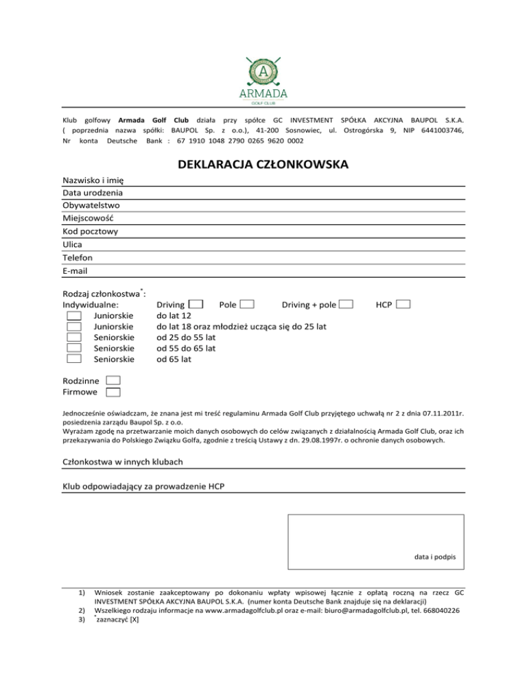 Klub golfowy Armada Golf Club działa przy spółce GC INVESTMENT SPÓŁKA AKCYJNA BAUPOL S.K.A. ( poprzednia nazwa spółki: BAUPOL Sp. z o.o.), 41-200 Sosnowiec, ul. Ostrogórska 9, NIP 6441003746, Nr konta Deutsche Bank : 67 1910 1048 2790 0265 9620 0002 DEKLARACJA CZŁONKOWSKA Nazwisko i imię Data urodzenia Obywatelstwo Miejscowość Kod pocztowy Ulica Telefon E-mail Rodzaj członkostwa*: Indywidualne: Juniorskie Juniorskie Seniorskie Seniorskie Seniorskie Driving Pole Driving + pole do lat 12 do lat 18 oraz młodzież ucząca się do 25 lat od 25 do 55 lat od 55 do 65 lat od 65 lat HCP Rodzinne Firmowe Jednocześnie oświadczam, że znana jest mi treść regulaminu Armada Golf Club przyjętego uchwałą nr 2 z dnia 07.11.2011r. posiedzenia zarządu Baupol Sp. z o.o. Wyrażam zgodę na przetwarzanie moich danych osobowych do celów związanych z działalnością Armada Golf Club, oraz ich przekazywania do Polskiego Związku Golfa, zgodnie z treścią Ustawy z dn. 29.08.1997r. o ochronie danych osobowych. Członkostwa w innych klubach Klub odpowiadający za prowadzenie HCP data i podpis 1) 2) 3) Wniosek zostanie zaakceptowany po dokonaniu wpłaty wpisowej łącznie z opłatą roczną na rzecz GC INVESTMENT SPÓŁKA AKCYJNA BAUPOL S.K.A. (numer konta Deutsche Bank znajduje się na deklaracji) Wszelkiego rodzaju informacje na www.armadagolfclub.pl oraz e-mail: [email protected], tel. 668040226 * zaznaczyć [X]
