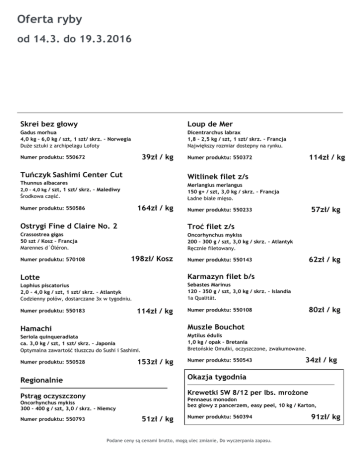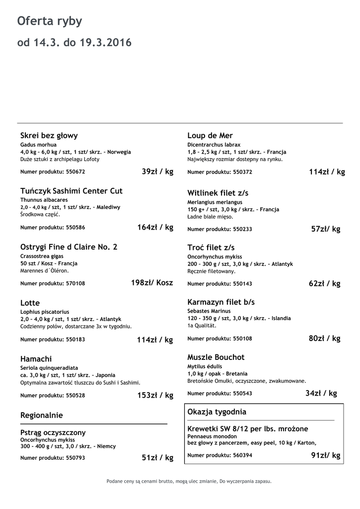 Oferta ryby od 14.3. do 19.3.2016 Skrei bez głowy Loup de Mer Gadus morhua 4,0 kg – 6,0 kg / szt, 1 szt/ skrz. – Norwegia Duże sztuki z archipelagu Lofoty Dicentrarchus labrax 1,8 – 2,5 kg / szt, 1 szt/ skrz. – Francja Największy rozmiar dostepny na rynku. 39zł / kg Numer produktu: 550672 Tuńczyk Sashimi Center Cut Witlinek filet z/s Thunnus albacares 2,0 – 4,0 kg / szt, 1 szt/ skrz. – Malediwy Środkowa część. Merlangius merlangus 150 g+ / szt, 3,0 kg / skrz. – Francja Ładne białe mięso. 164zł / kg Numer produktu: 550586 Troć filet z/s Crassostrea gigas 50 szt / Kosz – Francja Marennes d´Òléron. Oncorhynchus mykiss 200 – 300 g / szt, 3,0 kg / skrz. - Atlantyk Ręcznie filetowany. 198zł/ Kosz Karmazyn filet b/s Lophius piscatorius 2,0 – 4,0 kg / szt, 1 szt/ skrz. – Atlantyk Codzienny połów, dostarczane 3x w tygodniu. Sebastes Marinus 120 - 350 g / szt, 3,0 kg / skrz. – Islandia 1a Qualität. 114zł / kg 62zł / kg Numer produktu: 550143 Lotte Numer produktu: 550183 57zł/ kg Numer produktu: 550233 Ostrygi Fine d Claire No. 2 Numer produktu: 570108 114zł / kg Numer produktu: 550372 80zł / kg Numer produktu: 550108 Muszle Bouchot Hamachi Mytilus édulis 1,0 kg / opak – Bretania Bretońskie Omułki, oczyszczone, zwakumowane. Seriola quinqueradiata ca. 3,0 kg / szt, 1 szt/ skrz. – Japonia Optymalna zawartość tłuszczu do Sushi i Sashimi. 153zł / kg Numer produktu: 550528 Numer produktu: 550543 34zł / kg Regionalnie Okazja tygodnia Pstrąg oczyszczony Krewetki SW 8/12 per lbs. mrożone Pennaeus monodon bez głowy z pancerzem, easy peel, 10 kg / Karton, Oncorhynchus mykiss 300 - 400 g / szt, 3,0 / skrz. - Niemcy Numer produktu: 550793 51zł / kg Numer produktu: 560394 Podane ceny są cenami brutto, mogą ulec zmianie, Do wyczerpania zapasu. 91zł/ kg